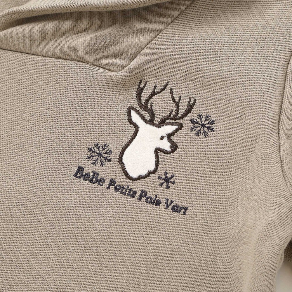 胸元のトナカイはベロア生地で立体感を演出し、ツノと雪の結晶は刺しゅうで丁寧に仕上げています。