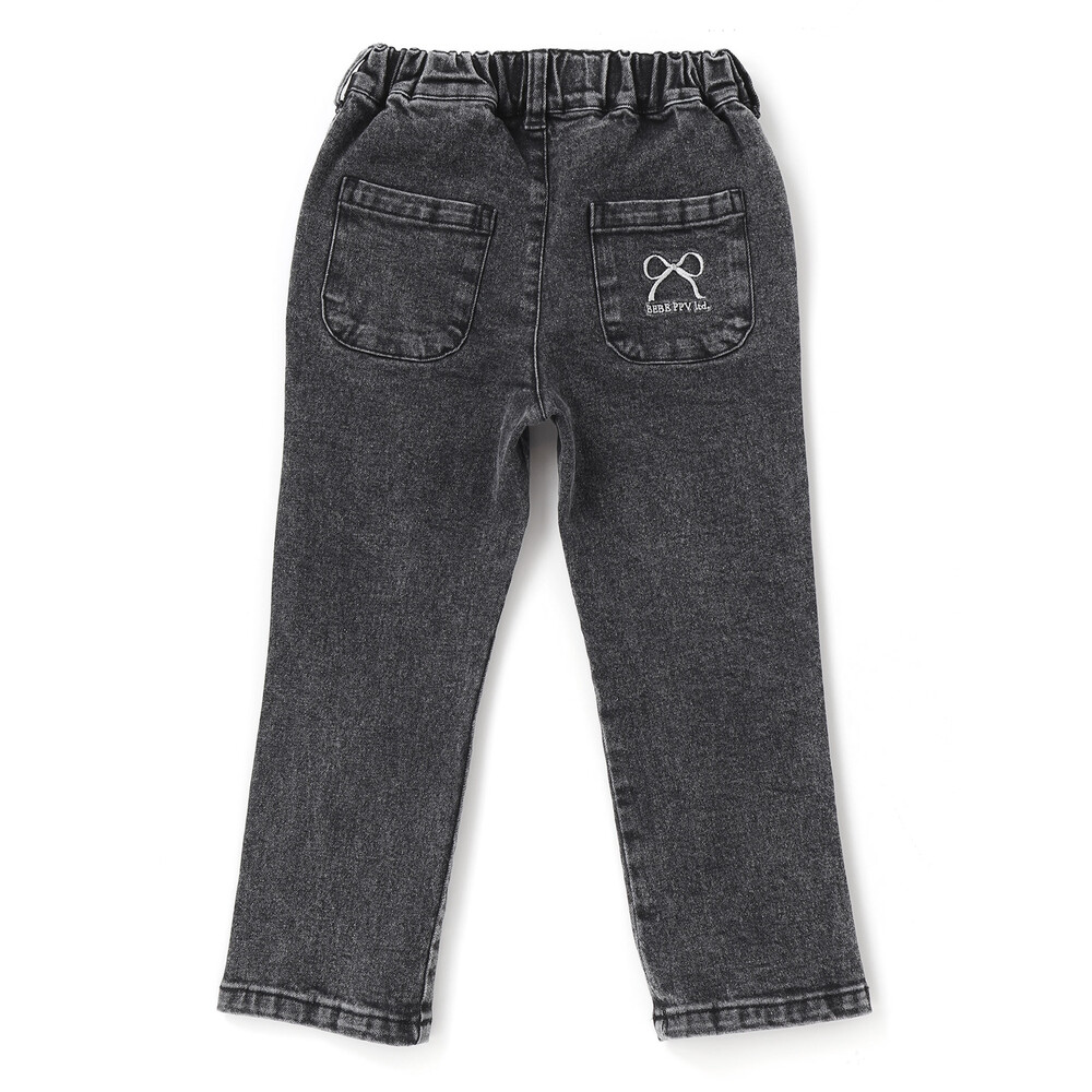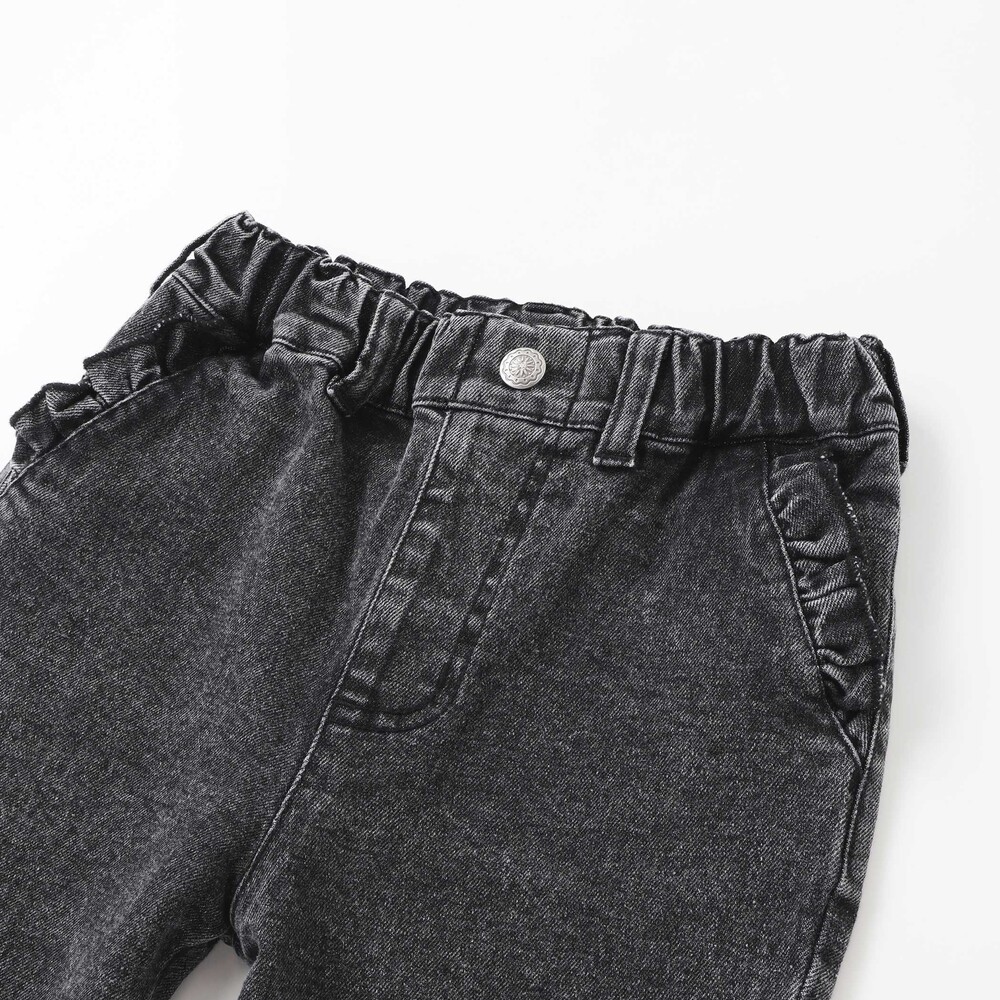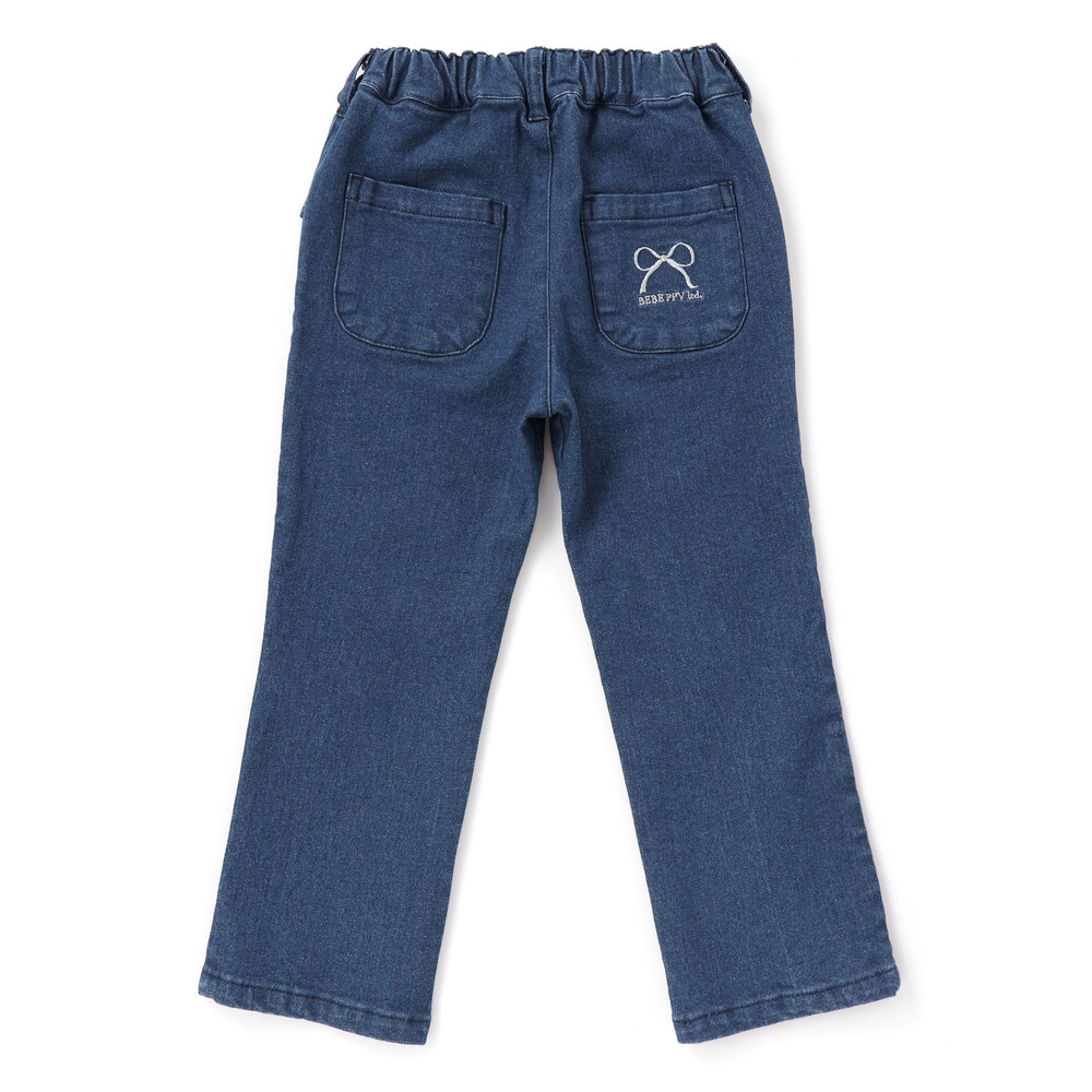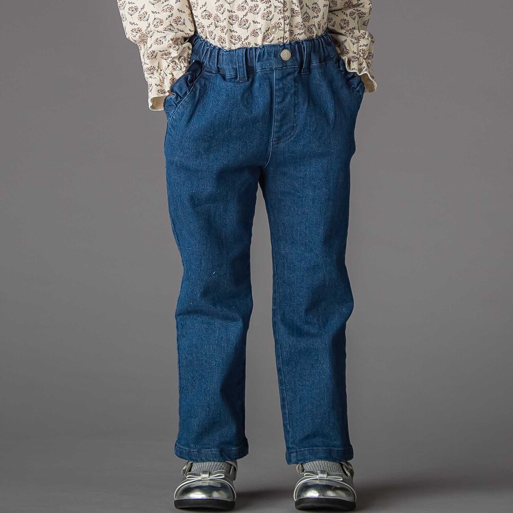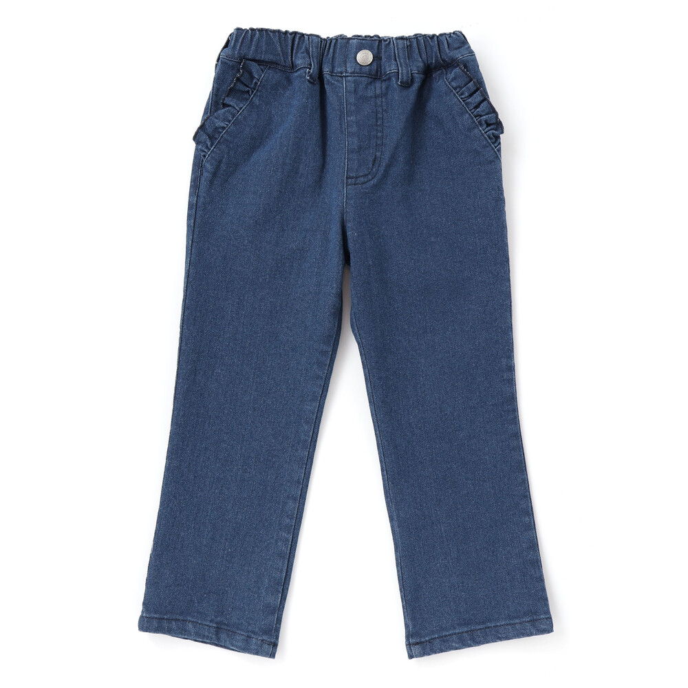 両脇フリル×リボン刺しゅうがかわいい、女の子用ストレッチデニムパンツ。