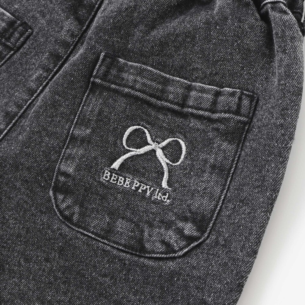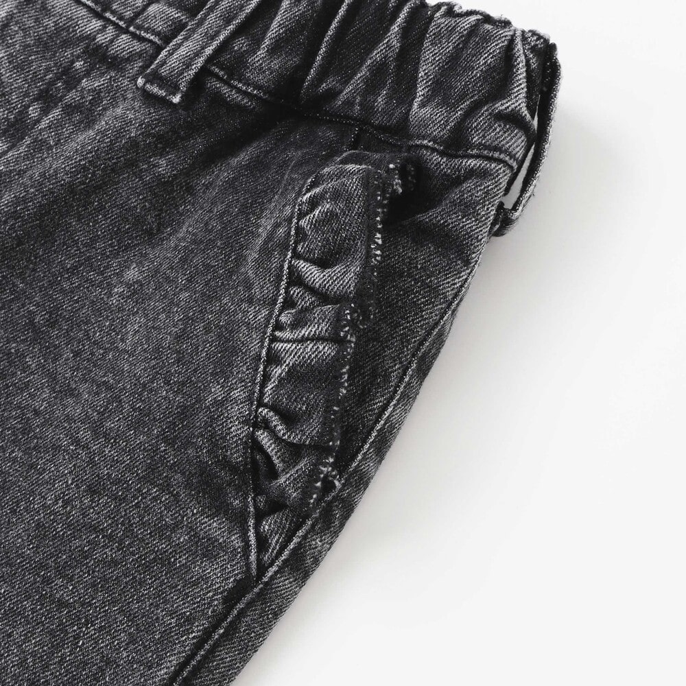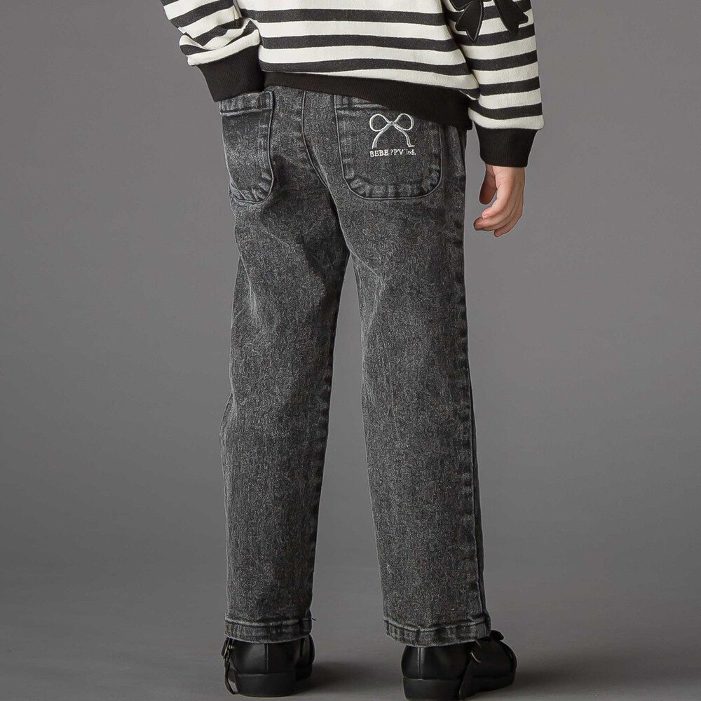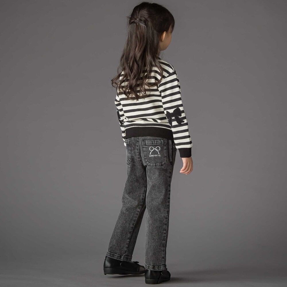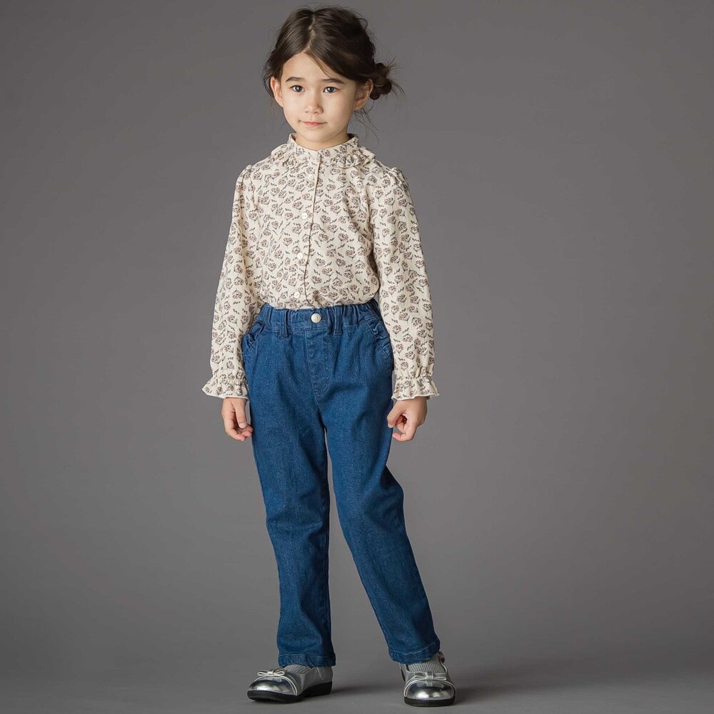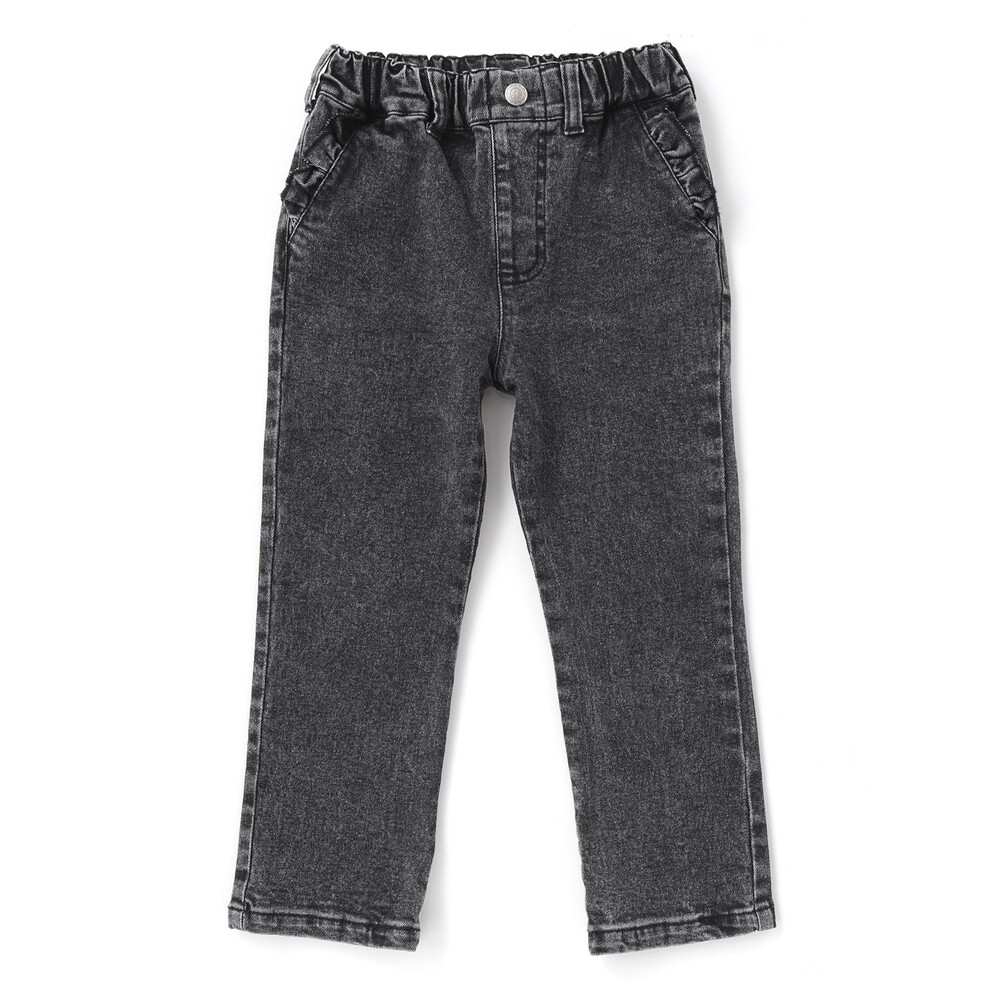 両脇フリル×リボン刺しゅうがかわいい、女の子用ストレッチデニムパンツ。