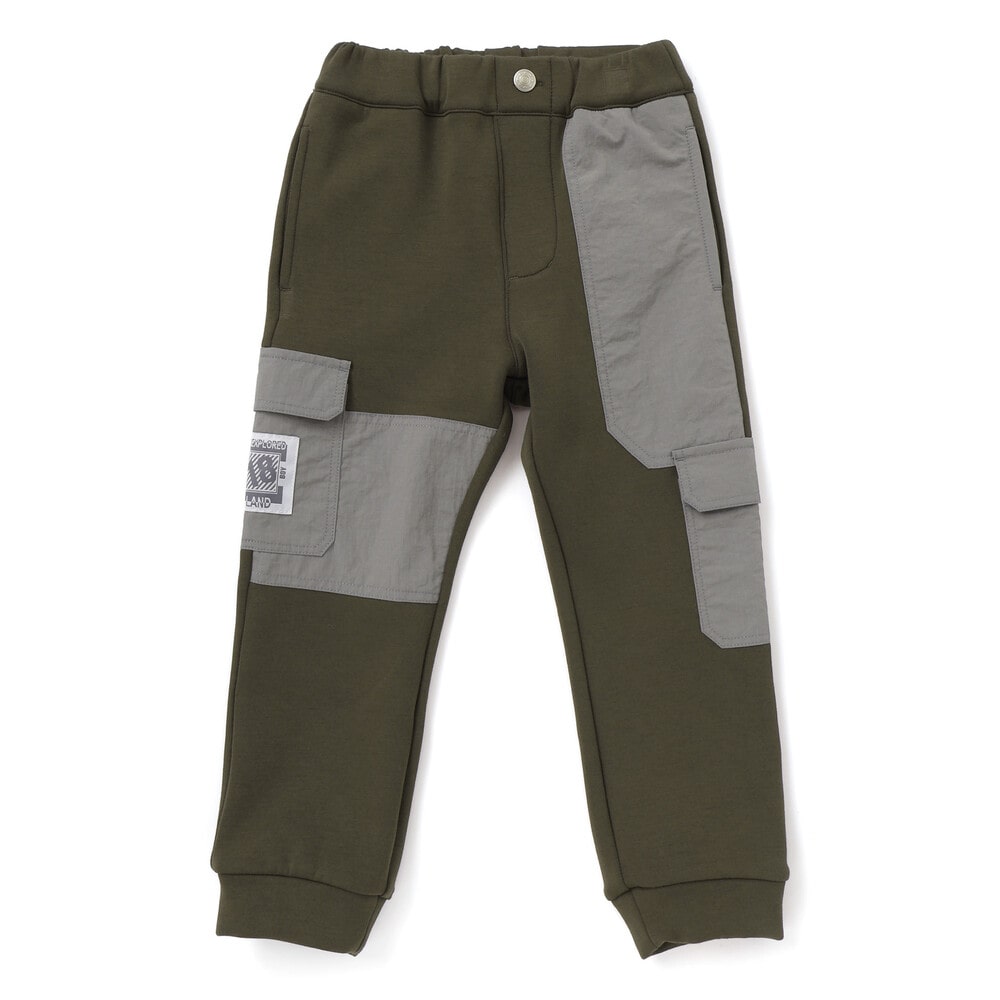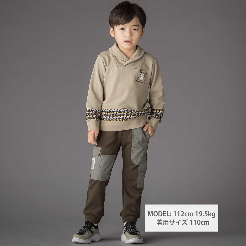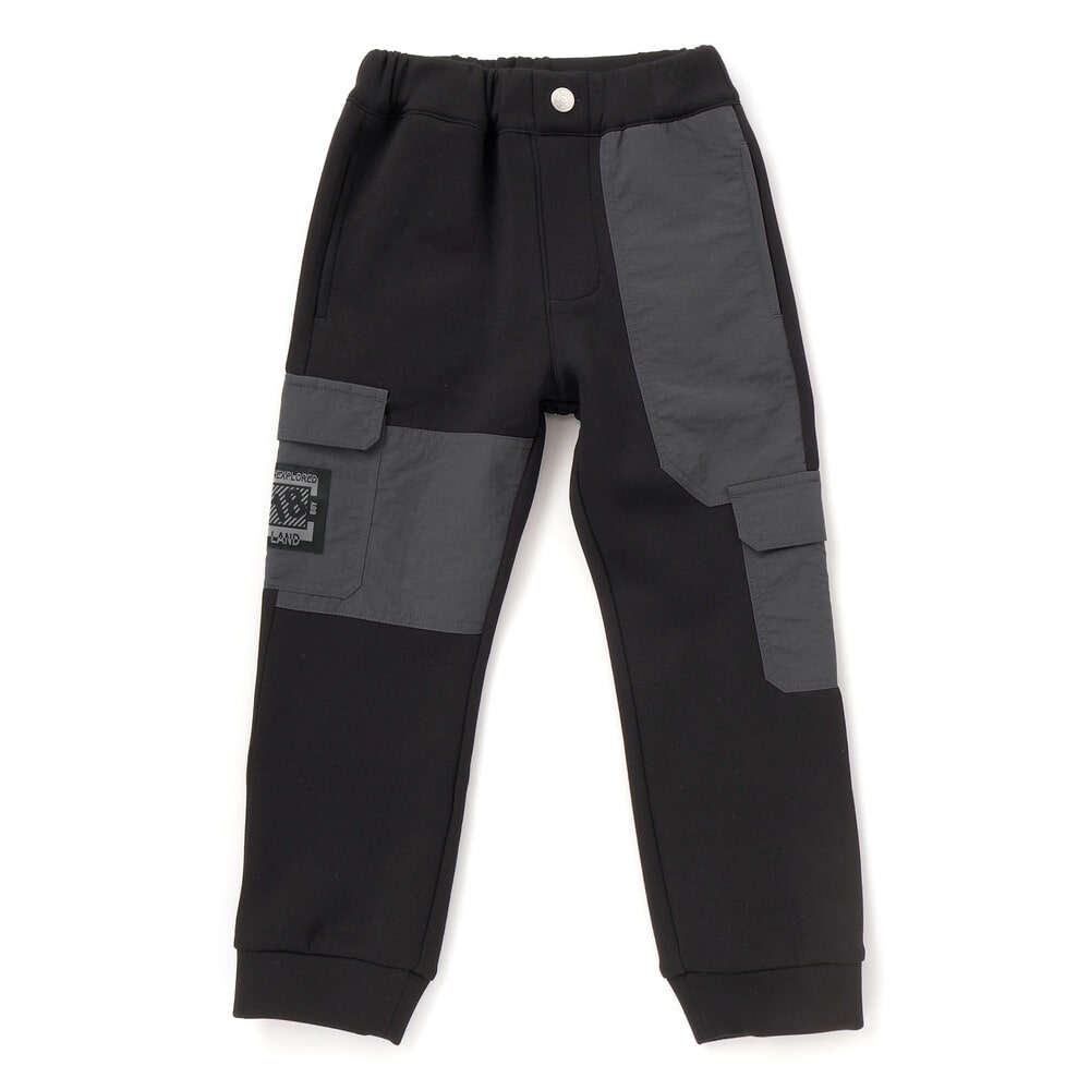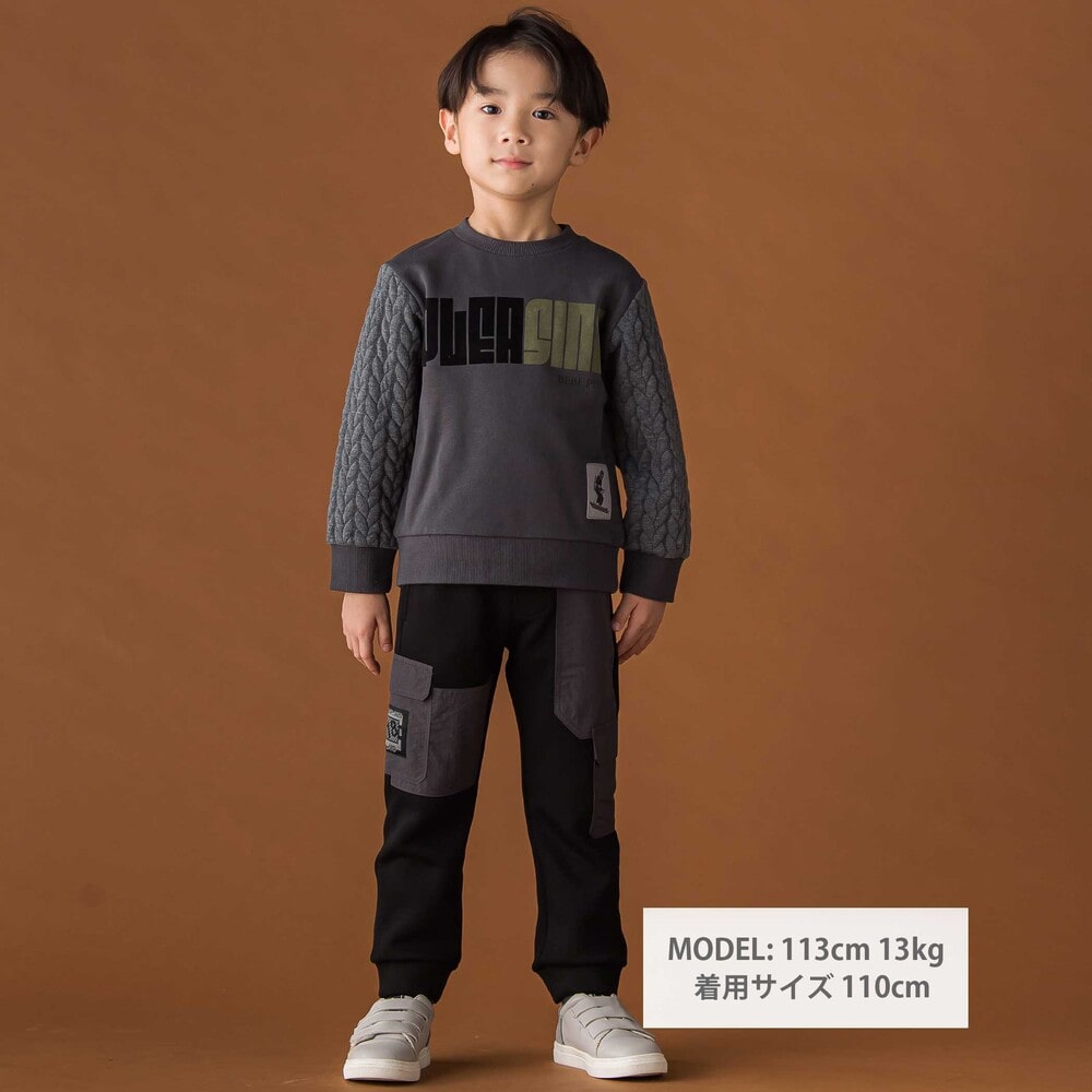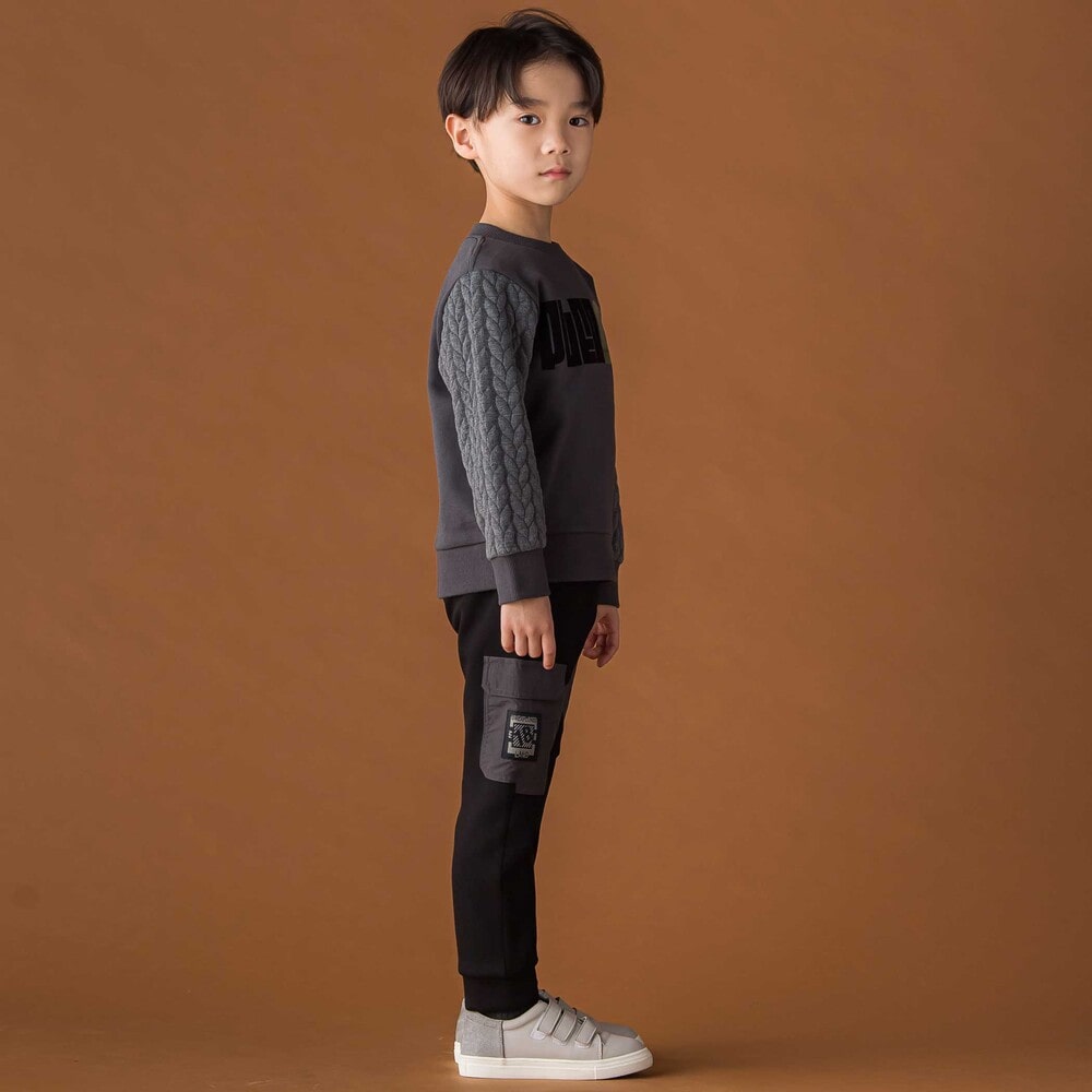 異素材切り替えとアシンメトリーデザインが映える男の子用ロングパンツ。