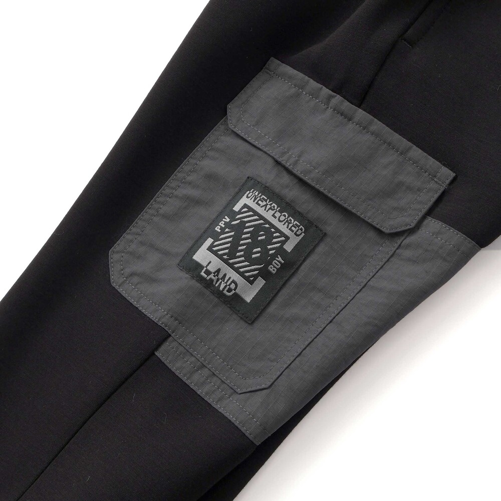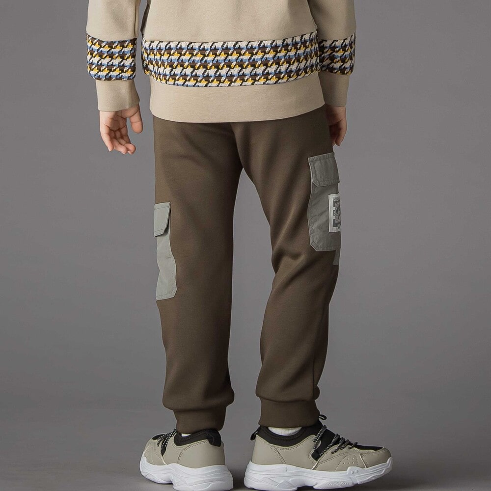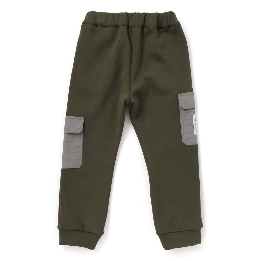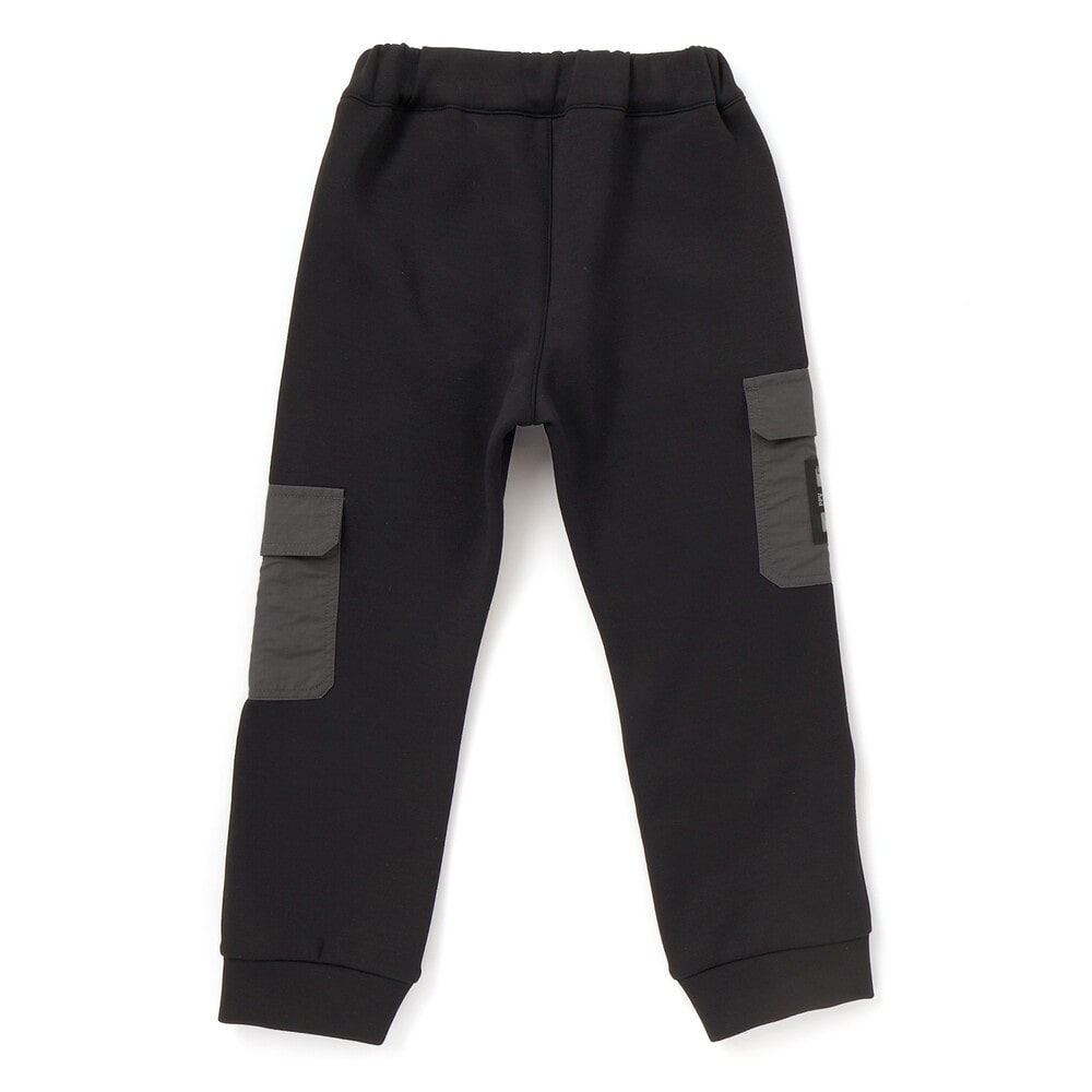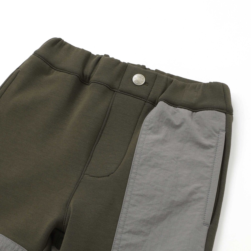 異素材切り替えとアシンメトリーデザインが映える男の子用ロングパンツ。