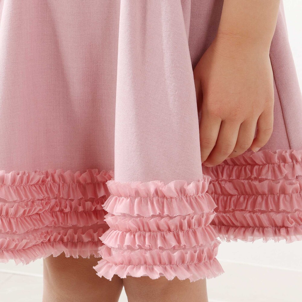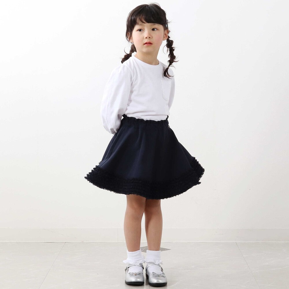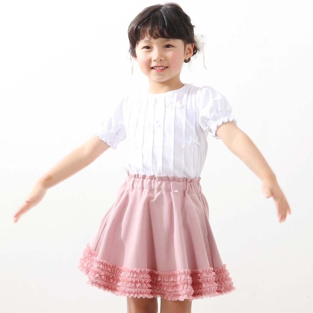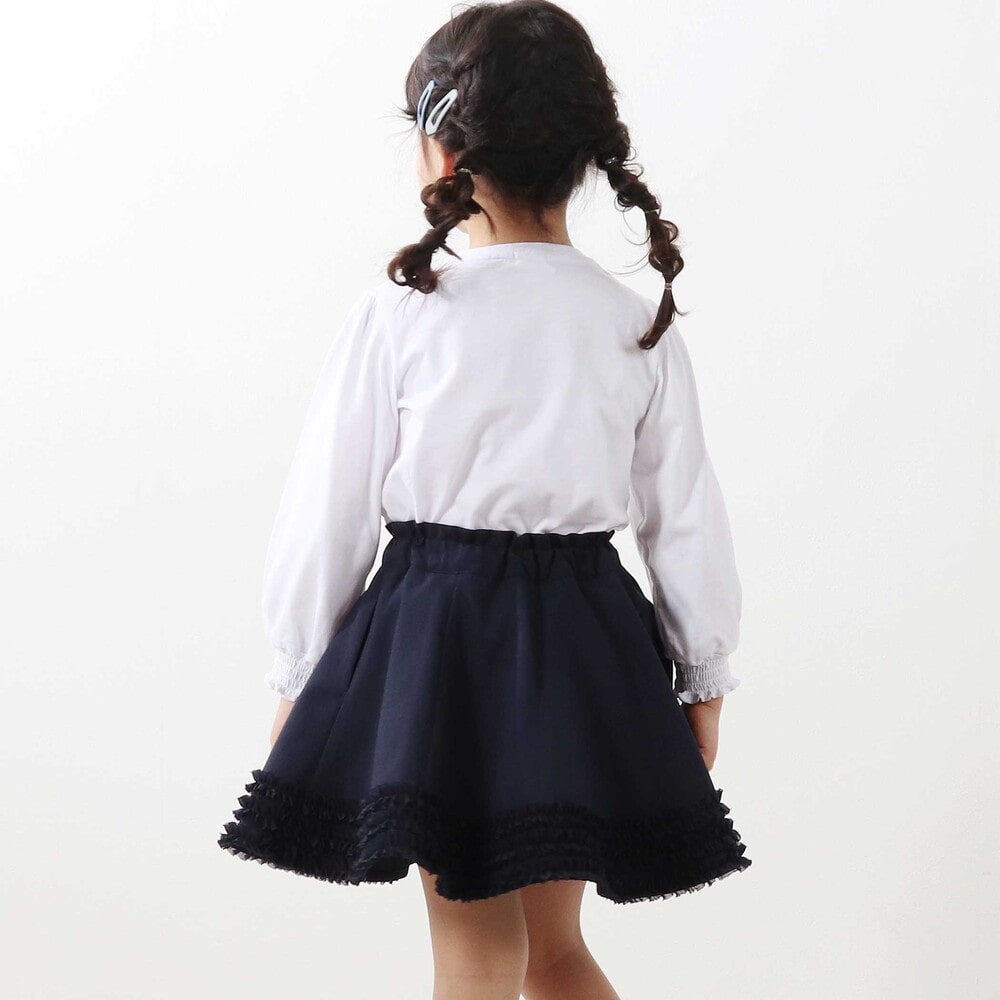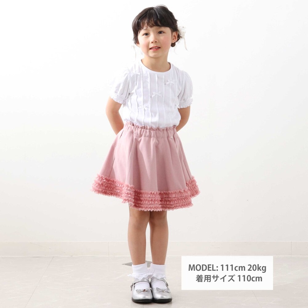 裾にあしらったオーガンジーの3段フリルがふわっと揺れる、女の子らしさたっぷりのフレアスカート。