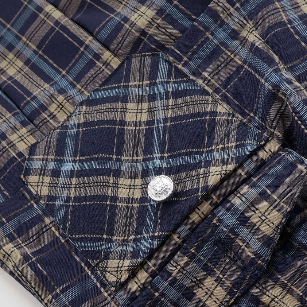 フロントポケットには、クラシックなエンブレムを刻印したアンティーク調ボタンを配置。
