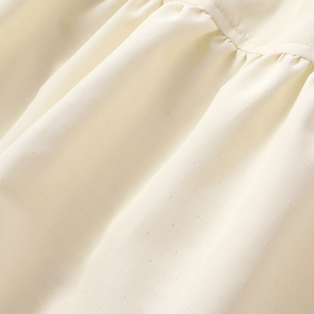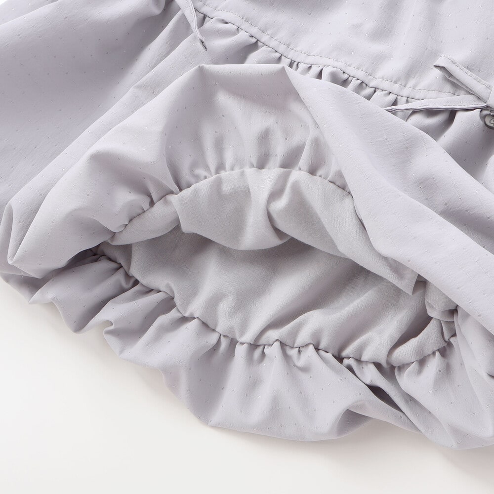 ヨーク切り替え位置に細幅リボンを左右へ配し、繊細なアクセントを添えています。