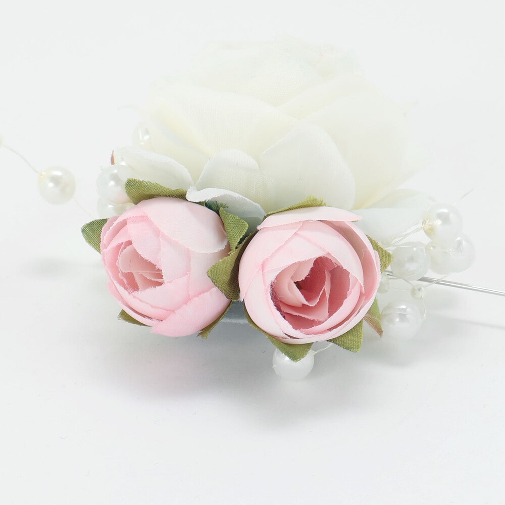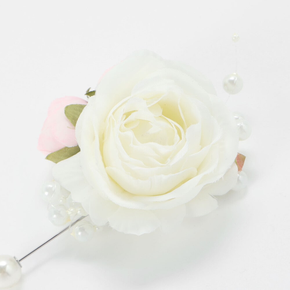 上品なパールが輝く、ローズとパールモチーフのコサージュ。