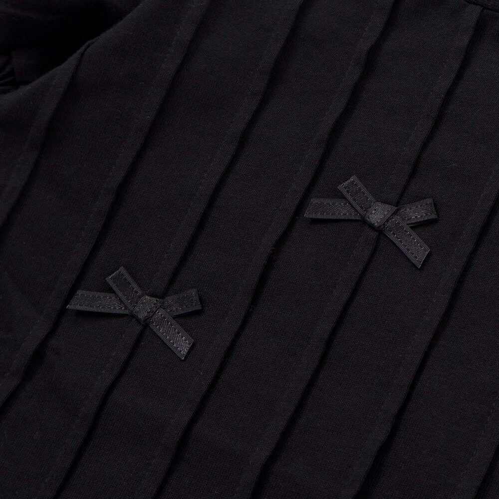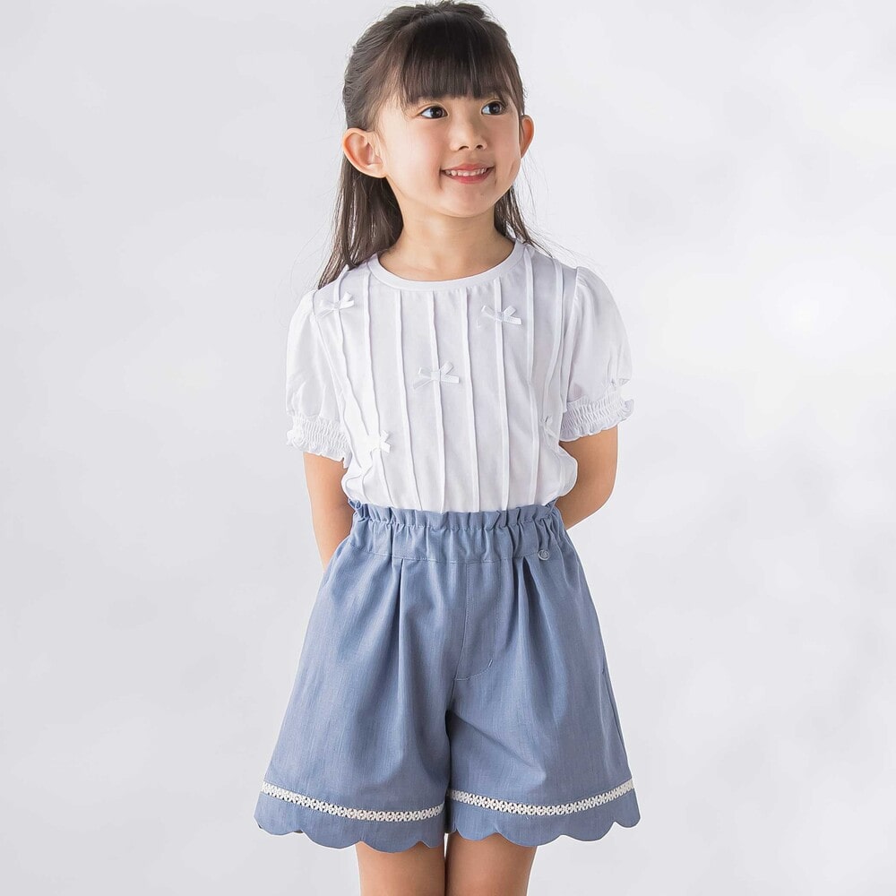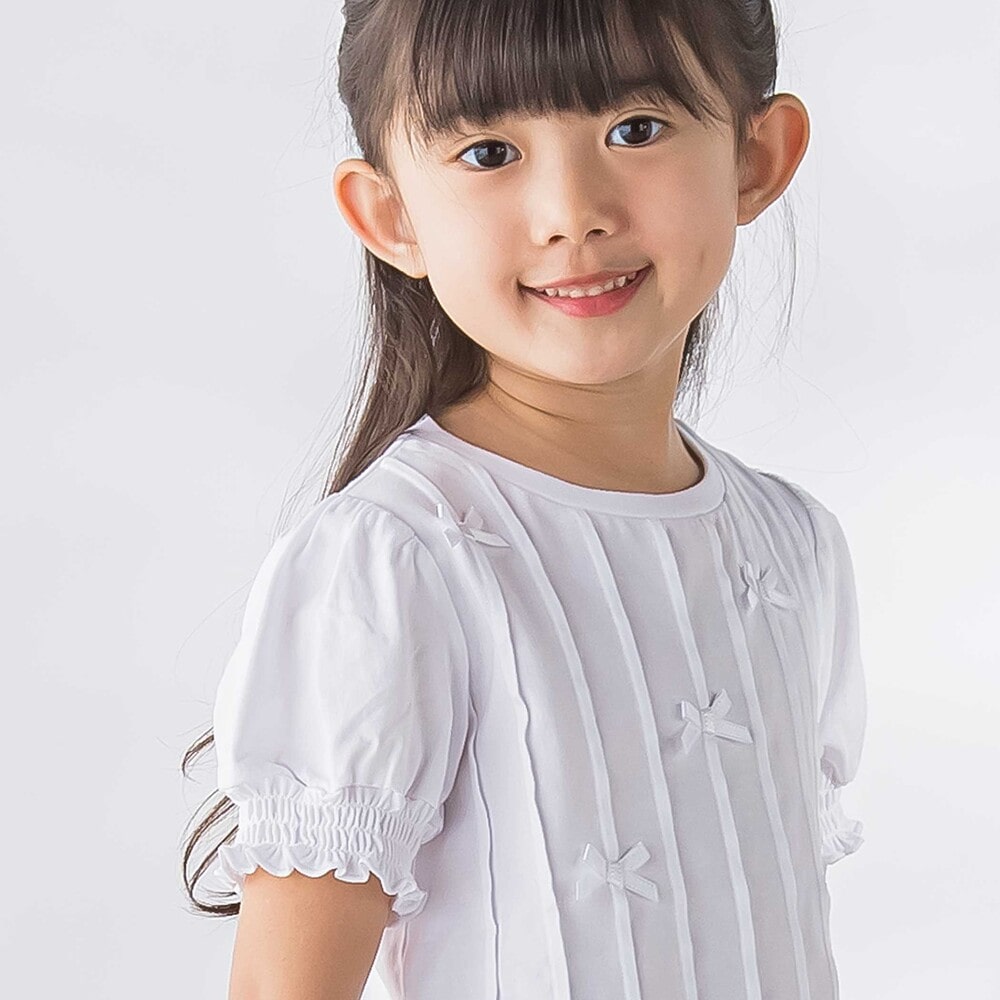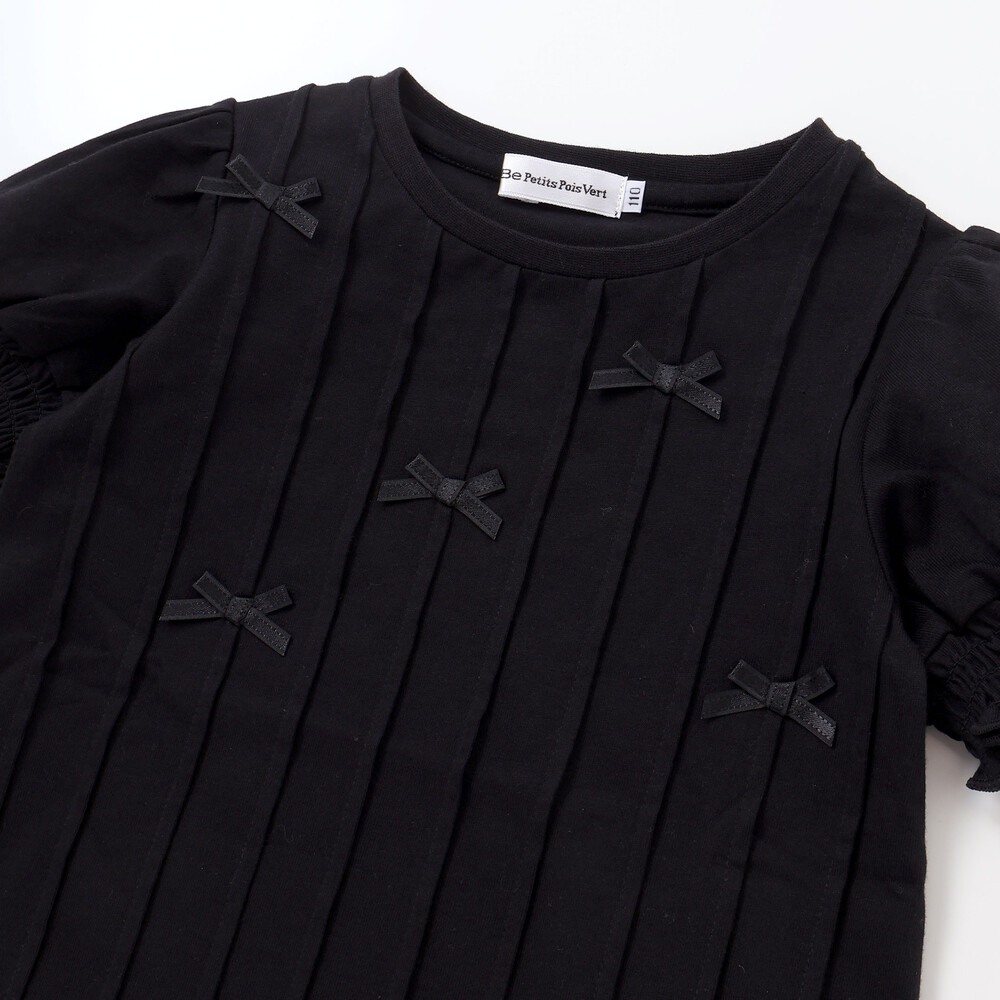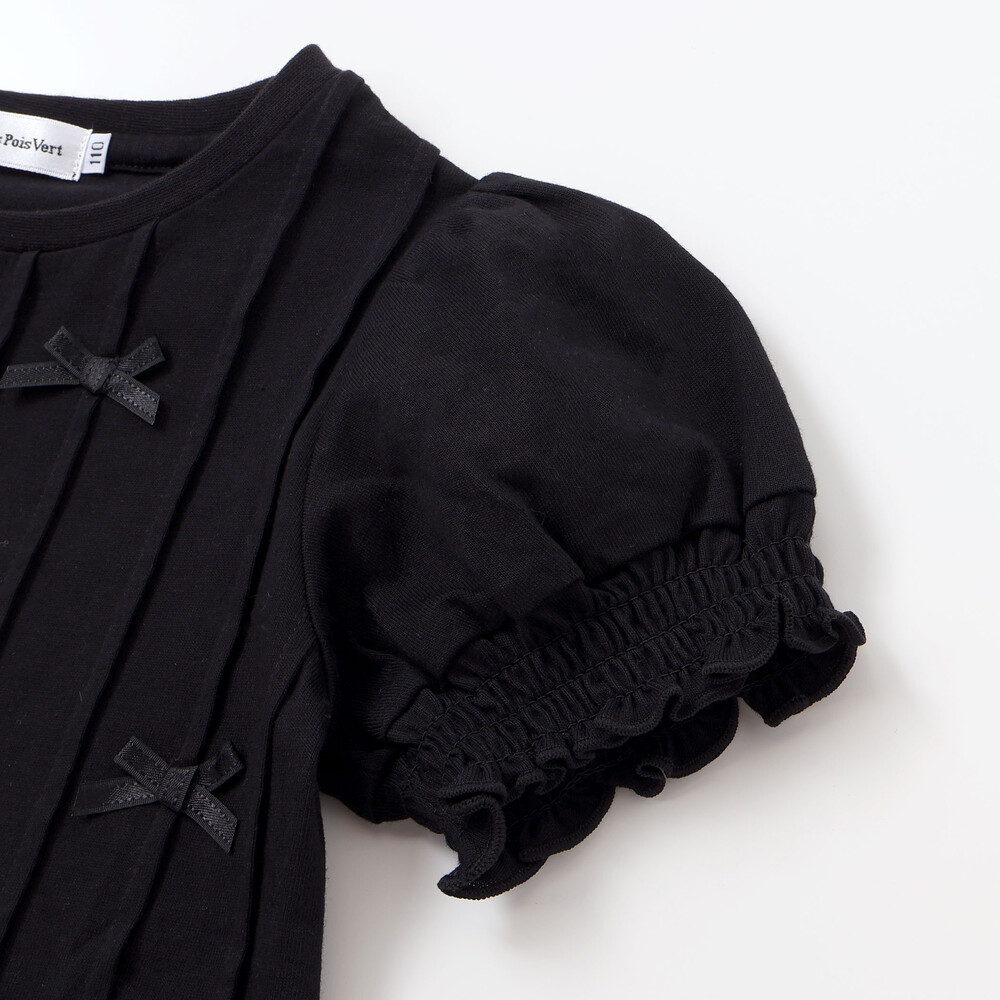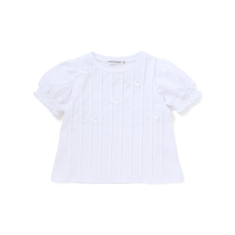 リボン×ピンタックが上品可愛い。ふんわり袖のガーリーな女の子用半袖Tシャツ。