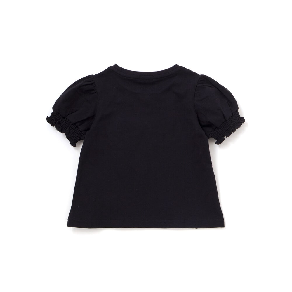 肩先にはギャザーを寄せ、袖口はシャーリングゴムでキュッと絞ったふんわりシルエットが女の子らしさを引き立てます。