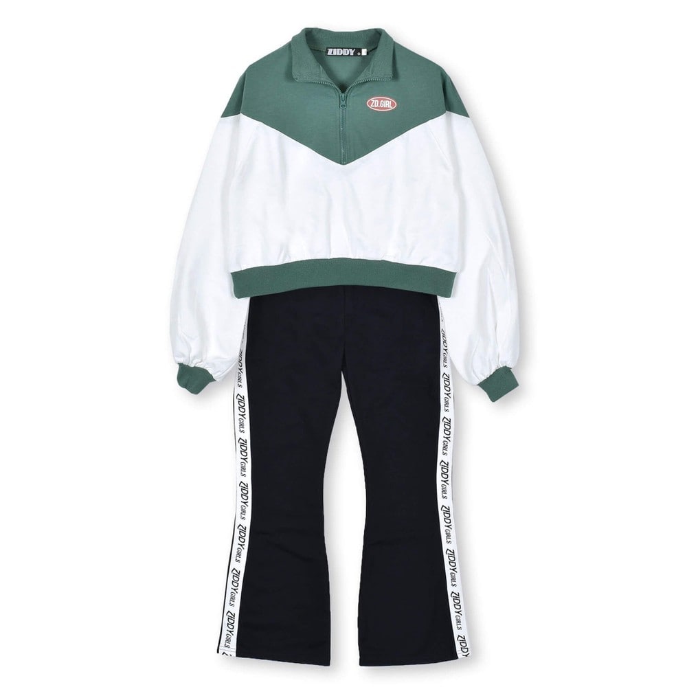 切り替え配色が目を引く、シンプルでカッコいいハーフZIPのトレーナーとフレアパンツのセットです。