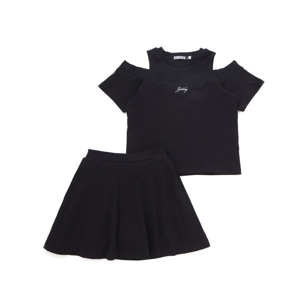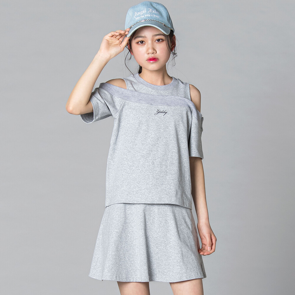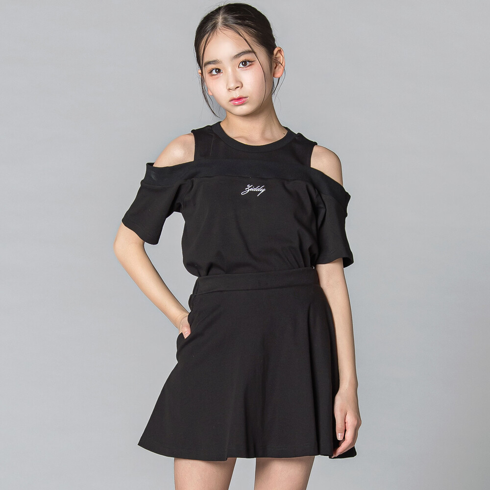 肩あきの抜け感がちょいギャルで、トレンドムードをそのまま楽しめるセットアップ。