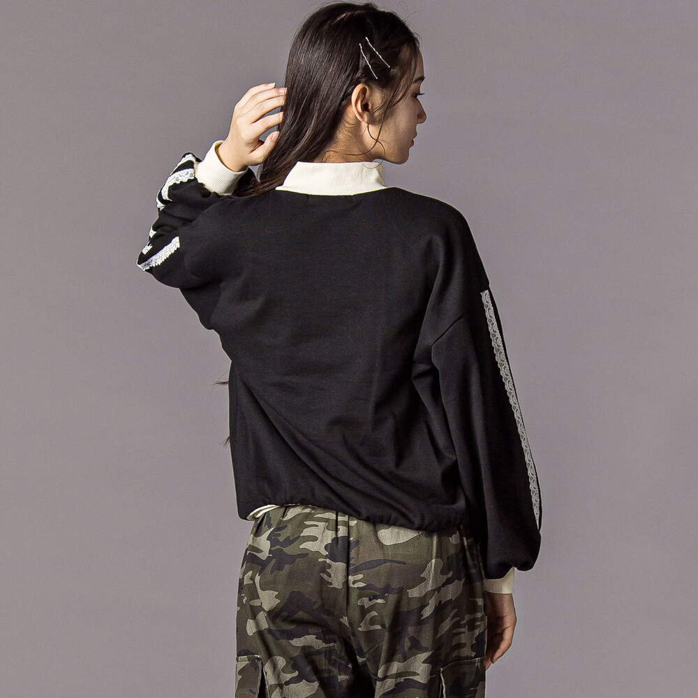 レースの異素材感が加わって、一枚で映えるプルオーバーに。