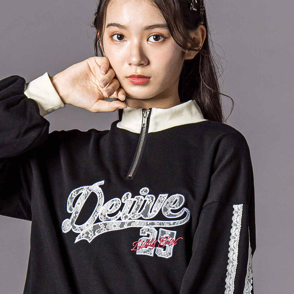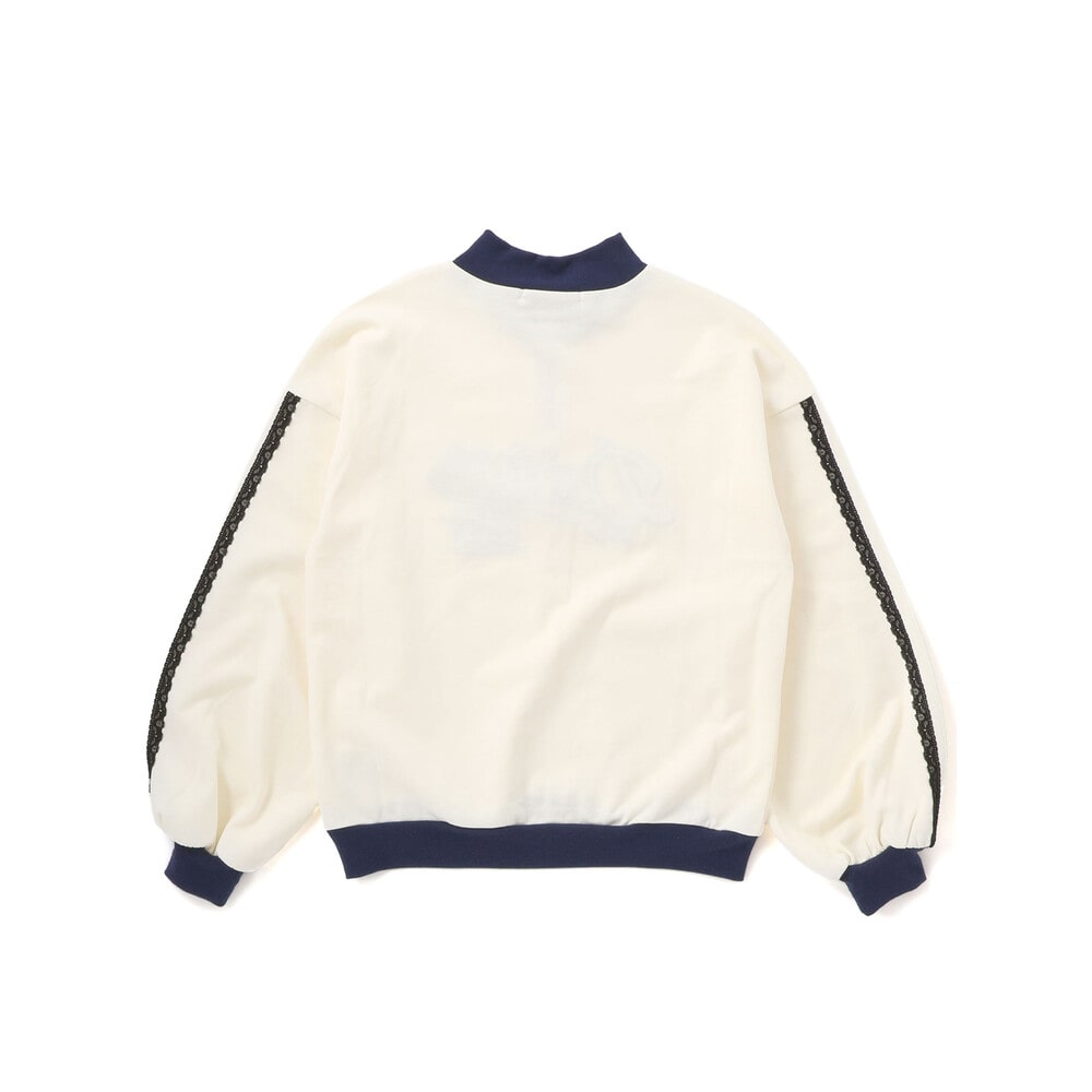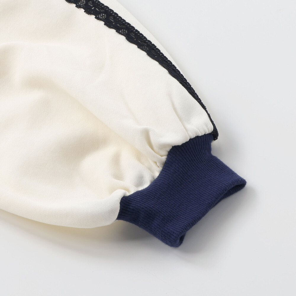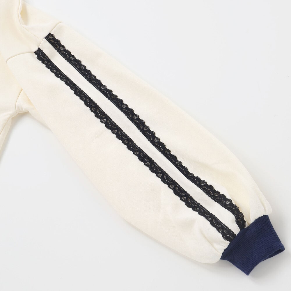 袖のレースラインとリブ切り替えがスポーツ感を出して、都会っぽかわいい雰囲気に。