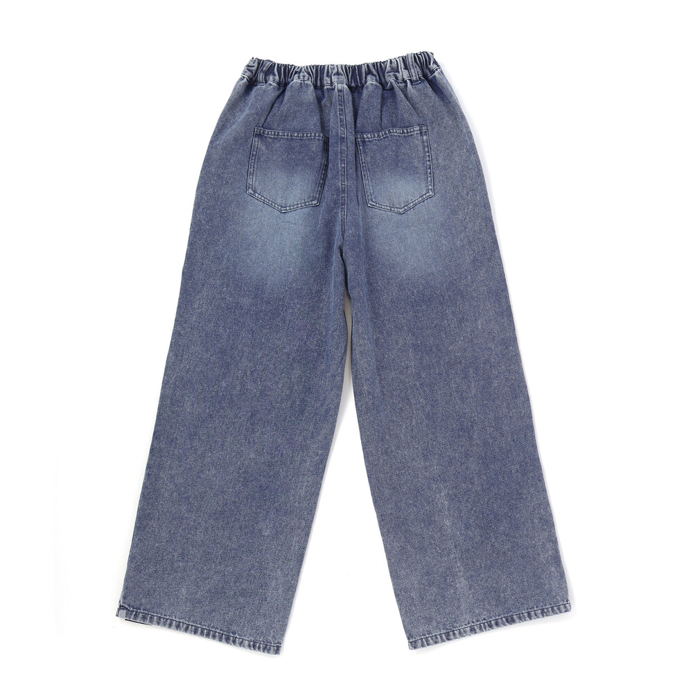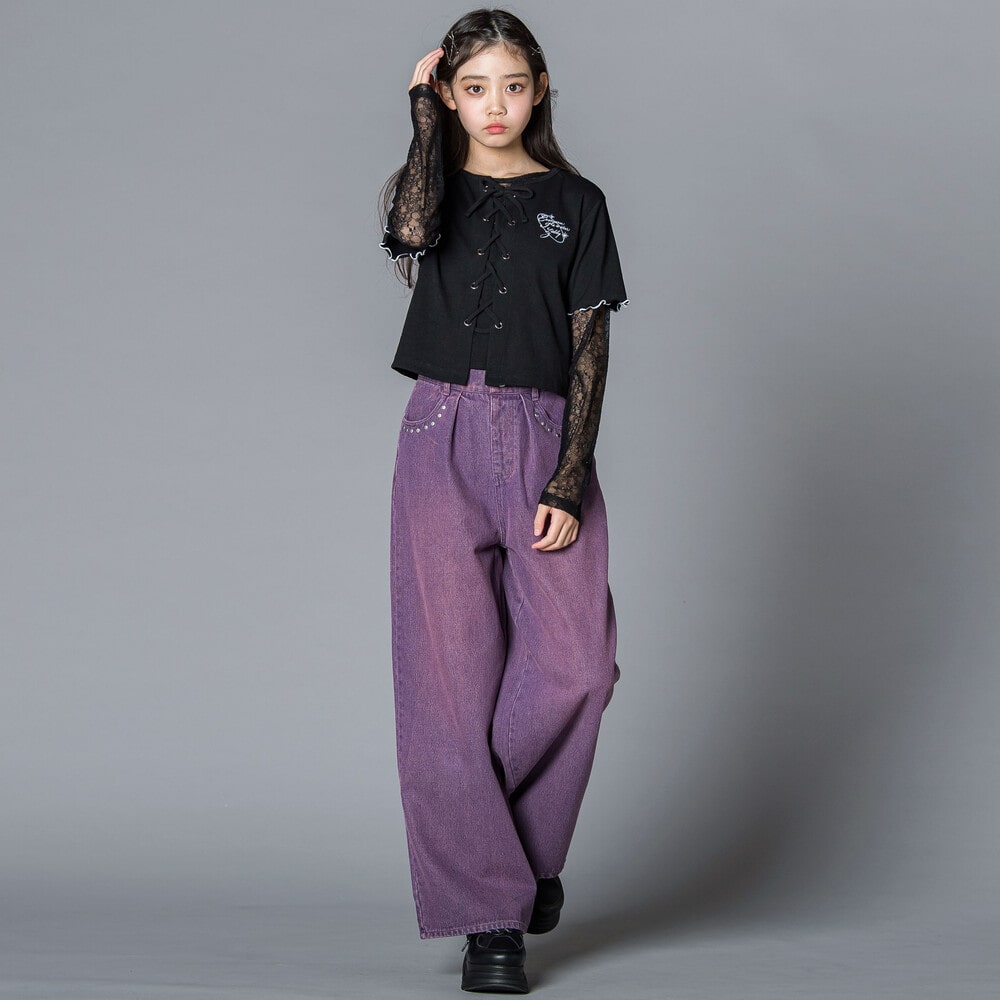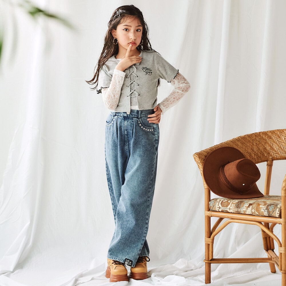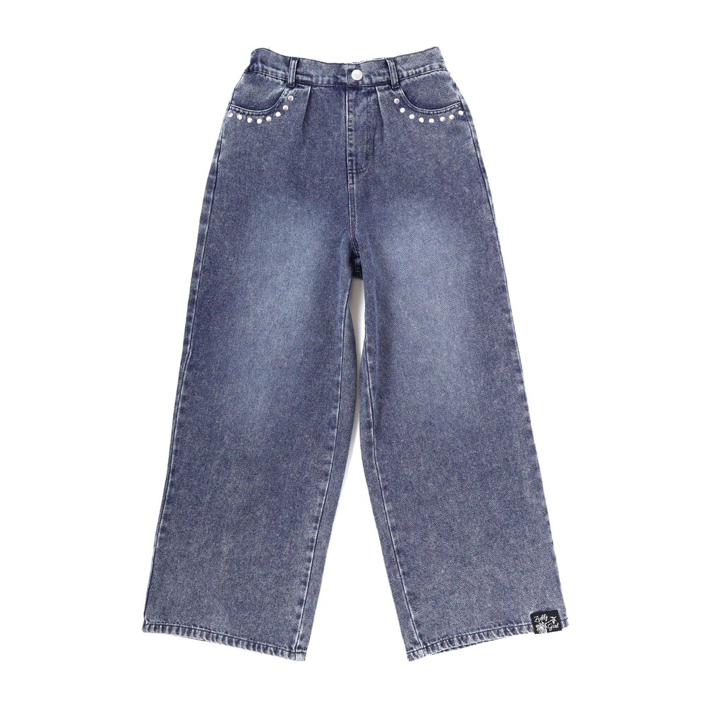 ウエスタンコアのスタッズをポケットに散りばめて、韓国ガールみたいな甘辛ムードに仕上げたデニムワイド。