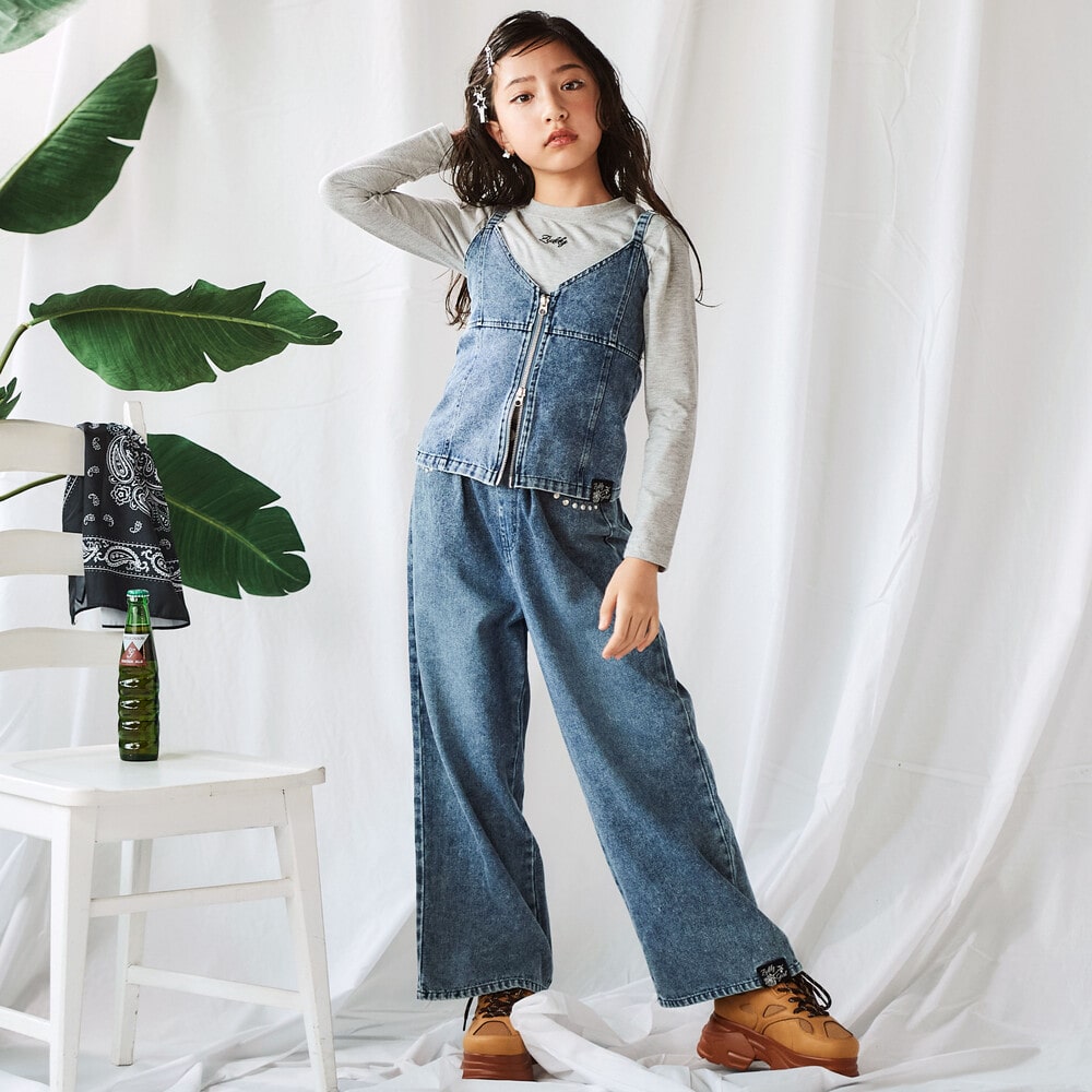 デニムビスチェ&TシャツSETとスタッズデニムワイドパンツには、バラモチーフのおそろいタグ付き。