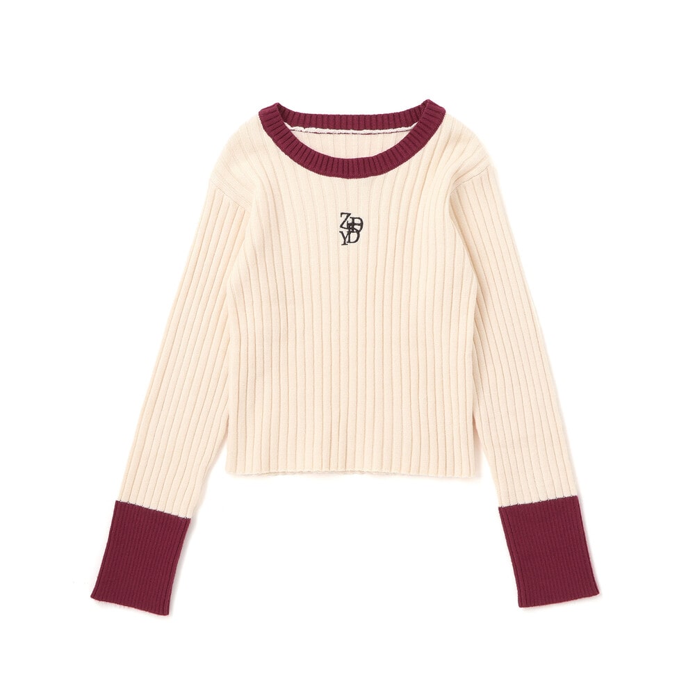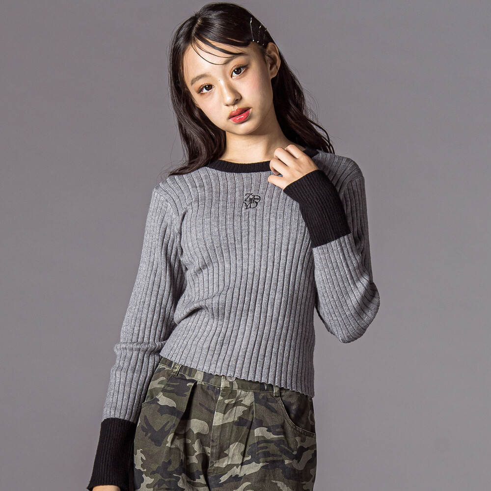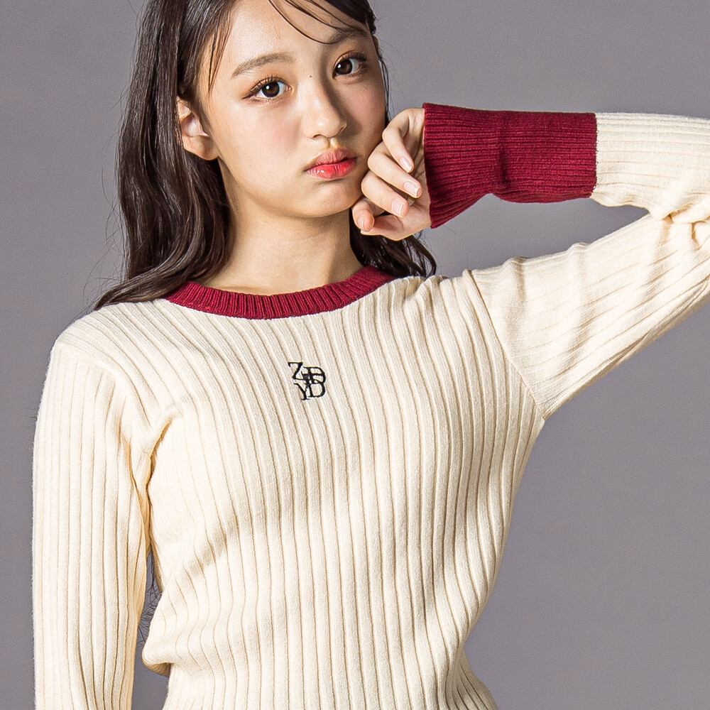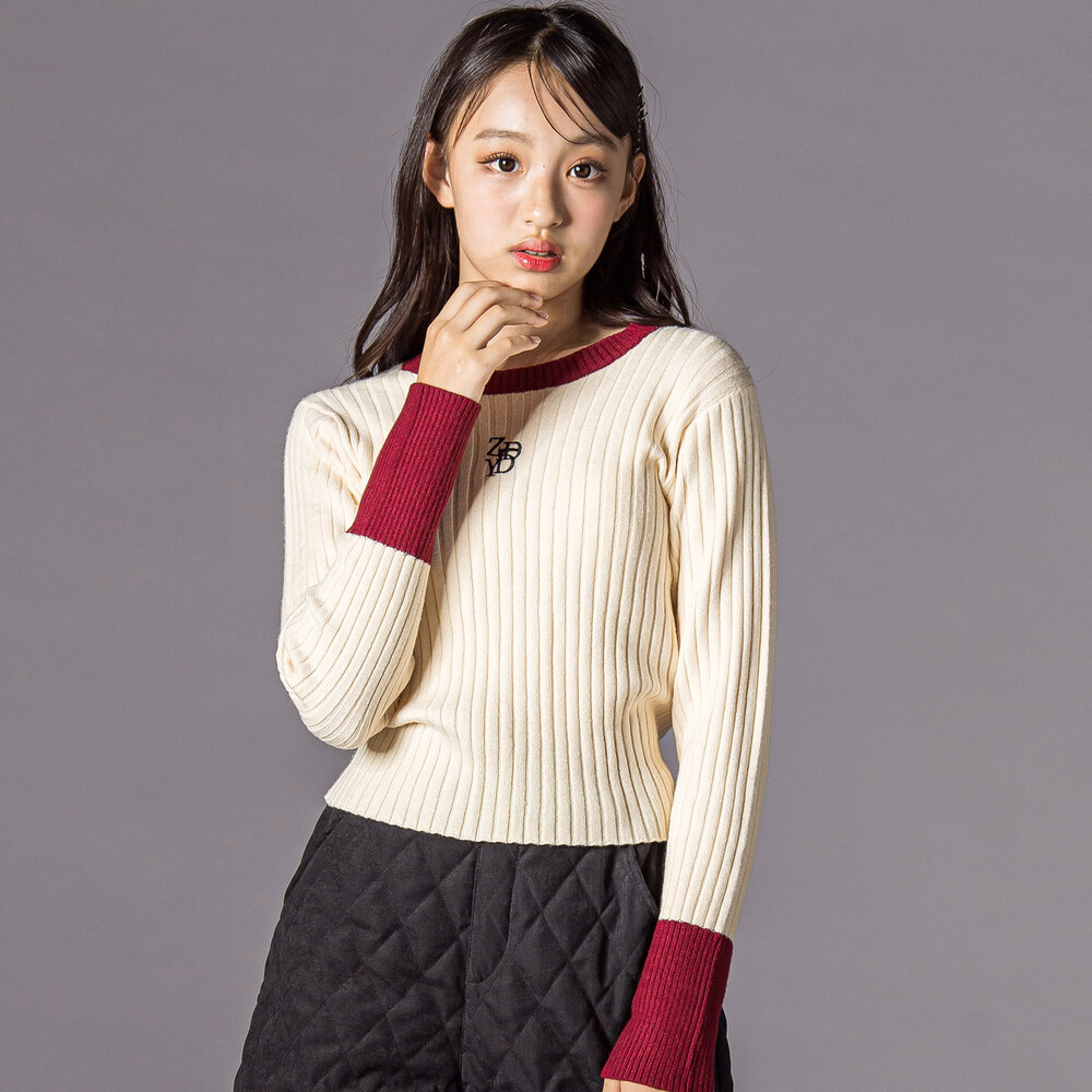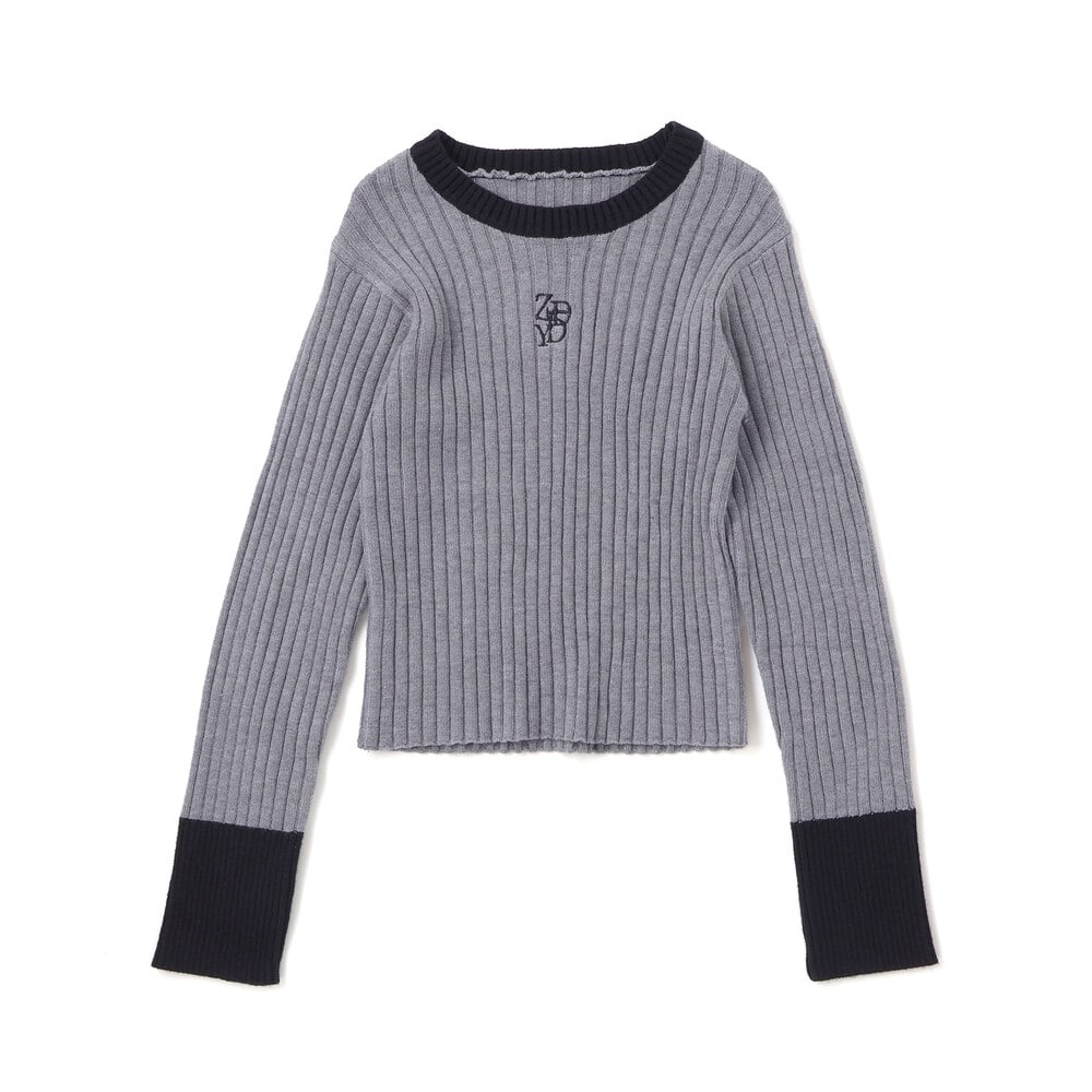 首もとすっきりのリブニットに、袖口をキュッときかせてスタイルよく見えるデザイン。