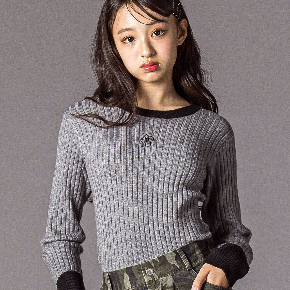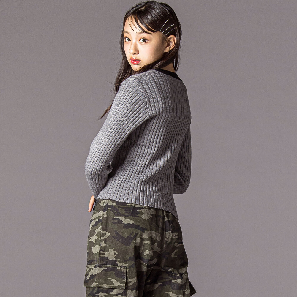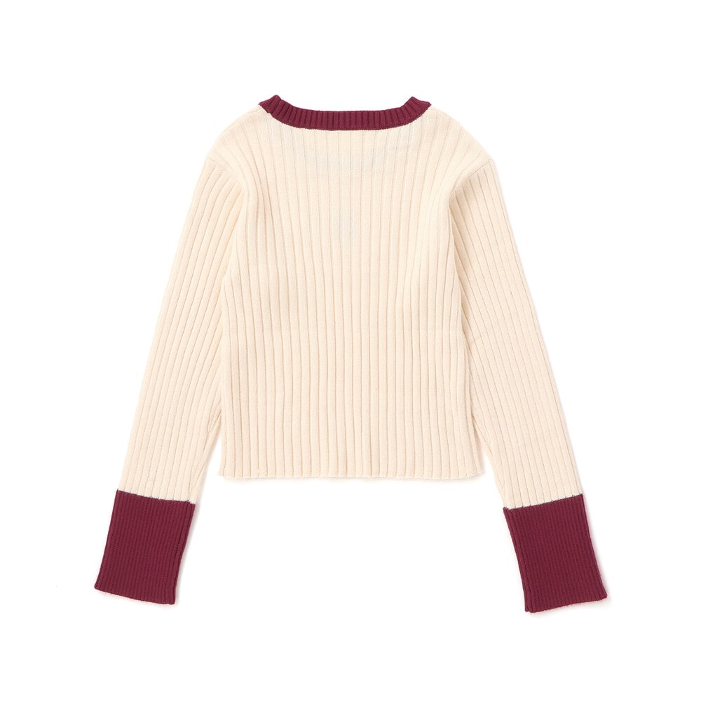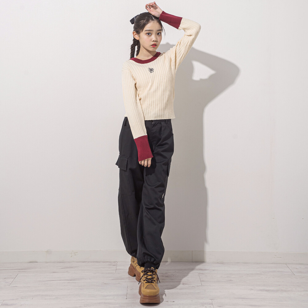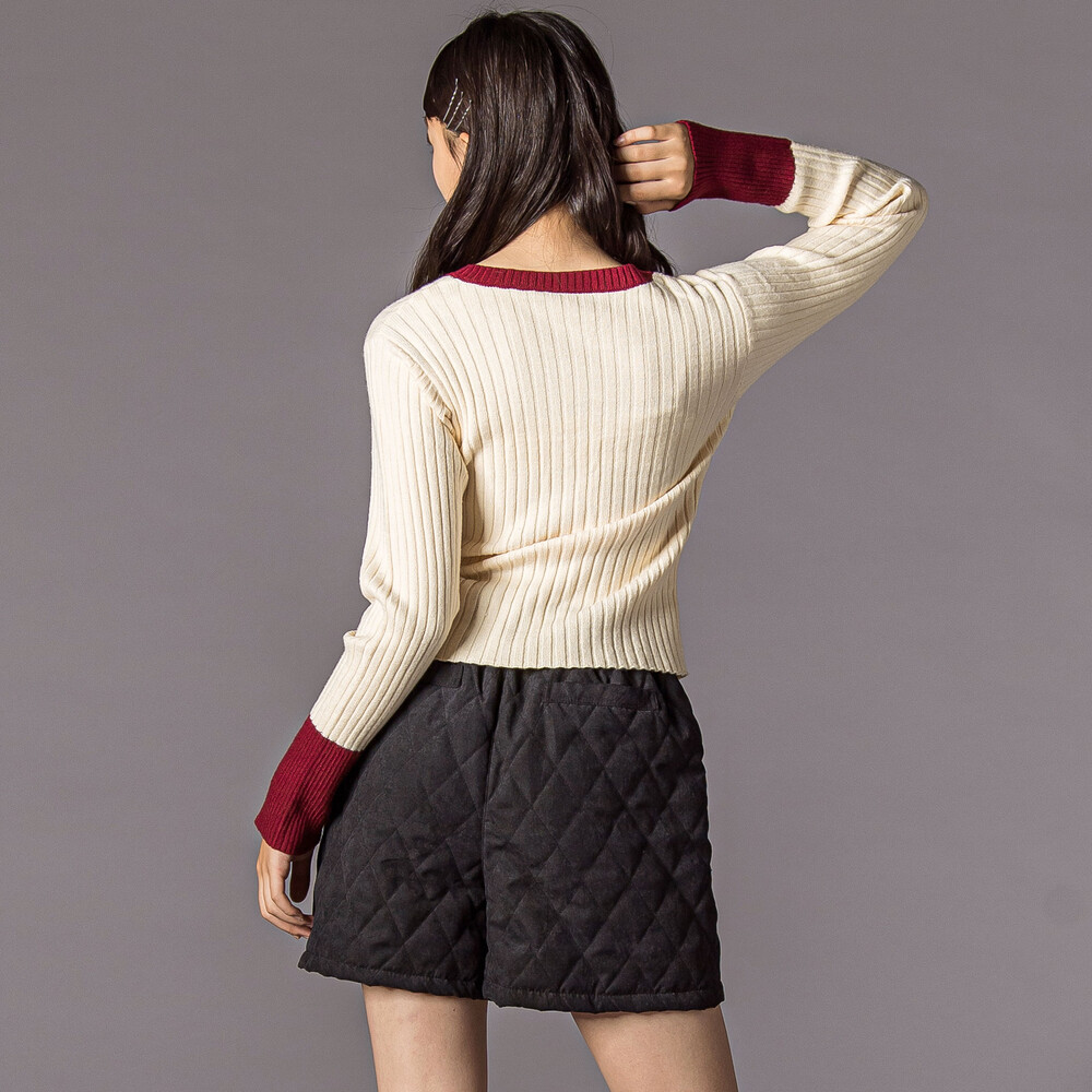 首もとすっきりのリブニットに、袖口をキュッときかせてスタイルよく見えるデザイン。