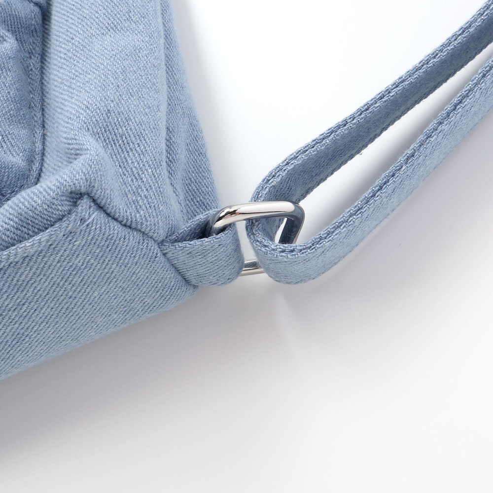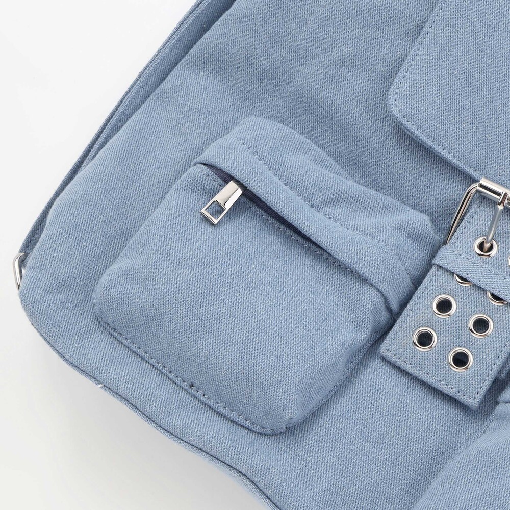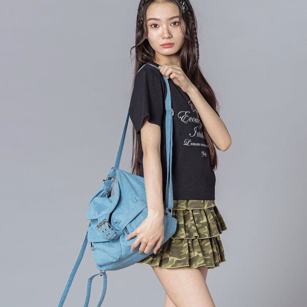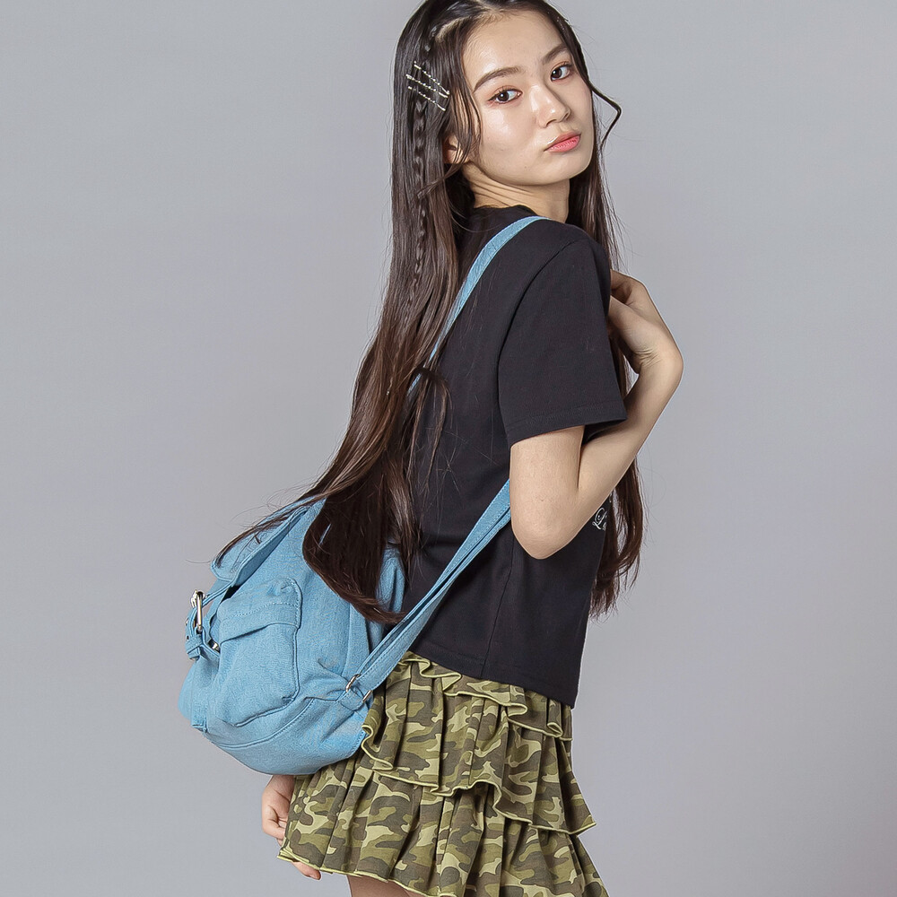 ブラックはシルバーパーツがキリッと映えるクールギャル、ブルーは春夏にぴったりのデニム調で軽やか見え。