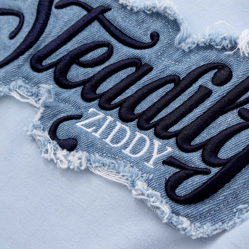 デニムをざっくり貼り付けたロゴワッペンが存在感たっぷりで、立体刺しゅうがクールに引き締めてくれるデザイン。