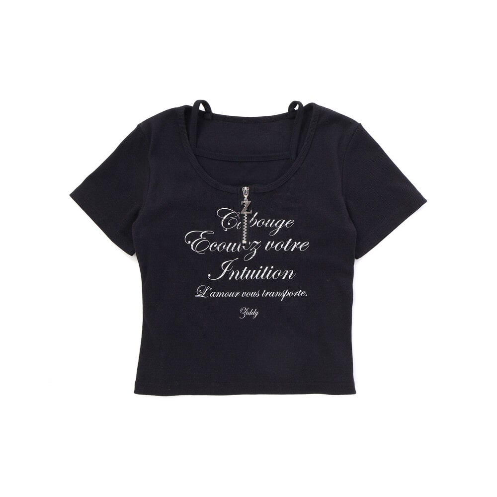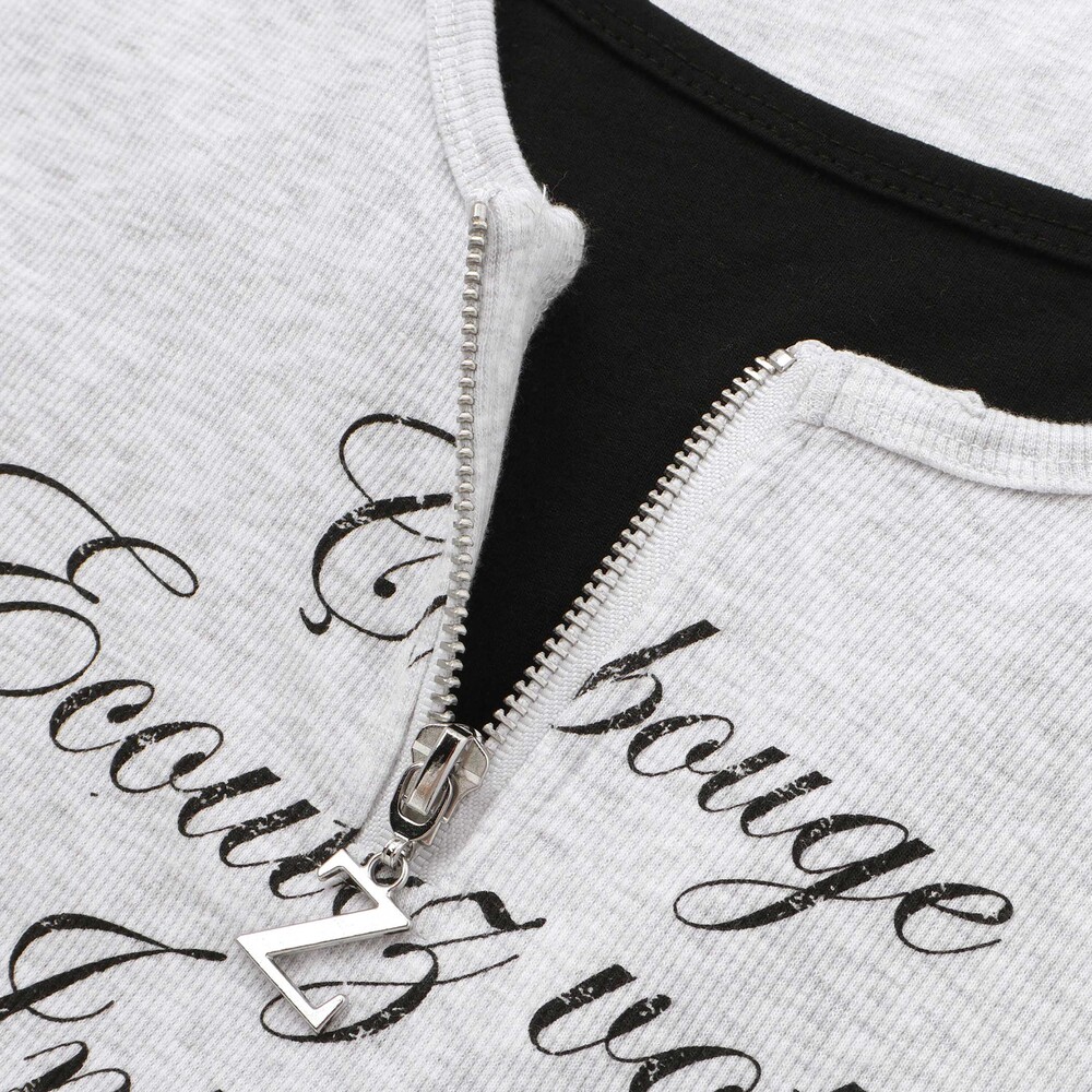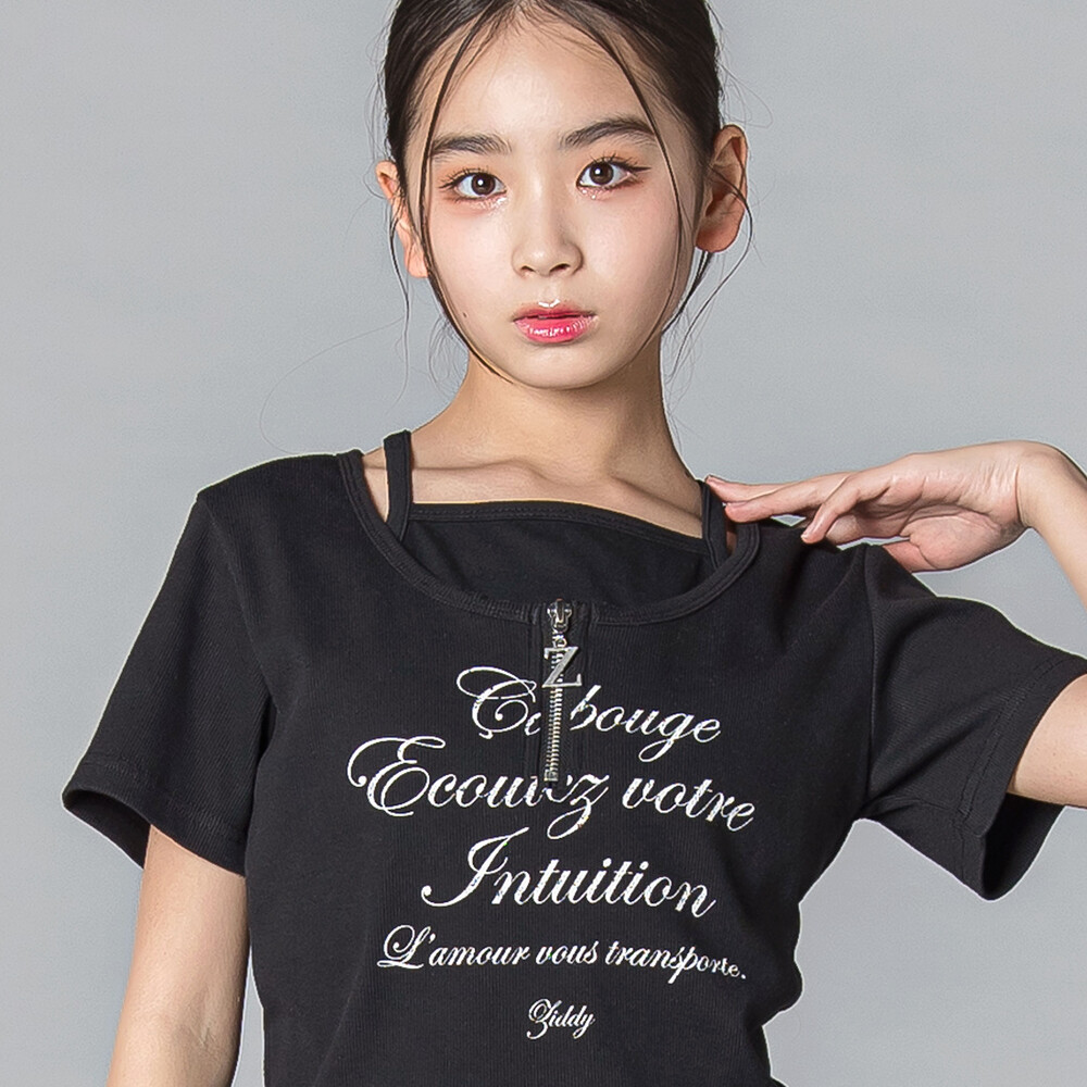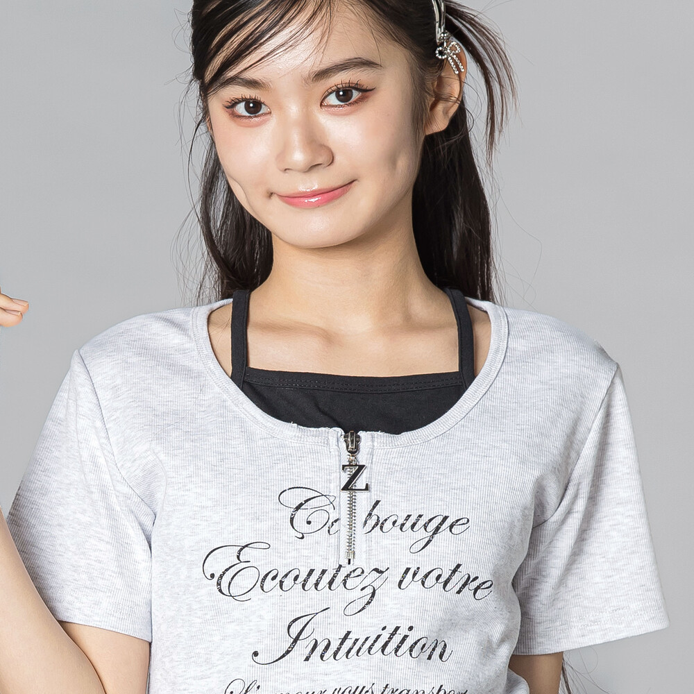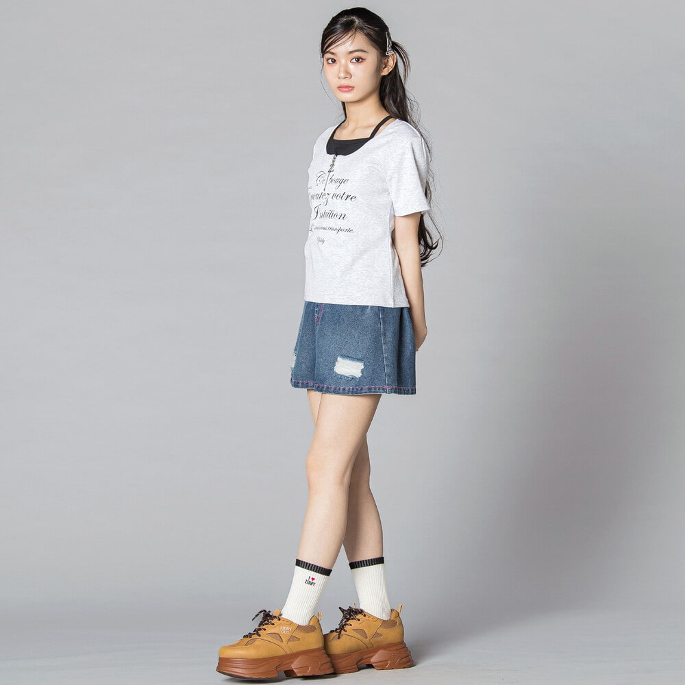 前のハーフジップは閉じて着るとバランスが良く、ロゴとかすれプリントが平成ギャルのムードを今っぽくアップデート。