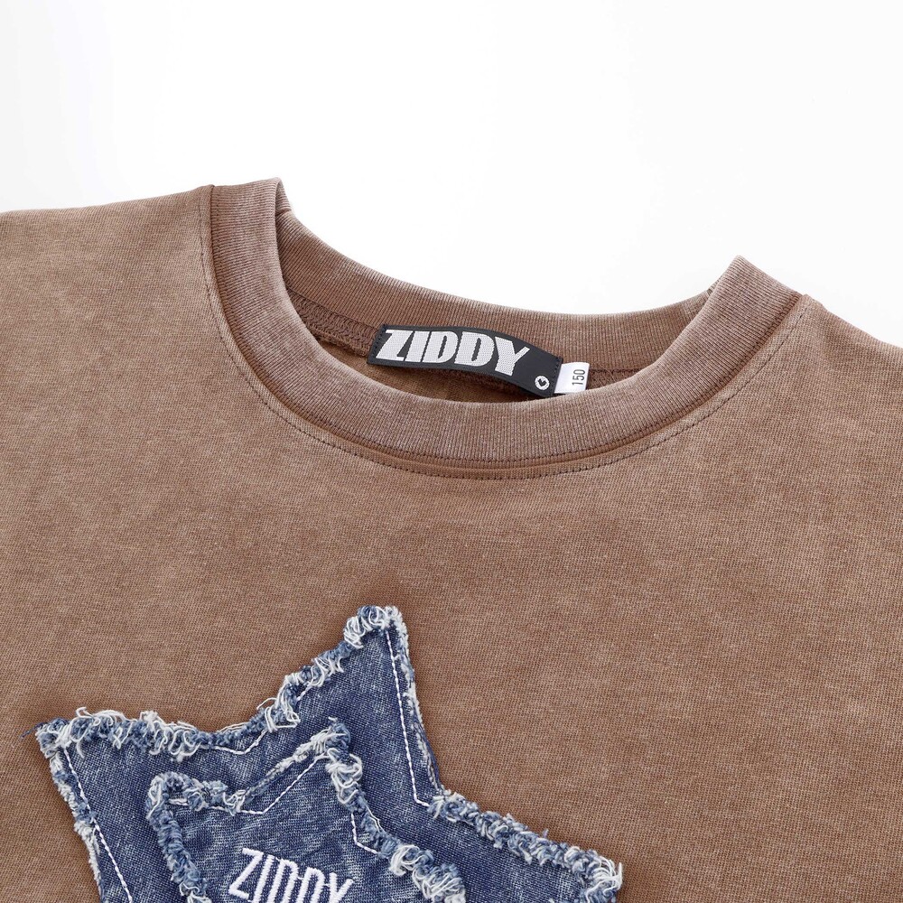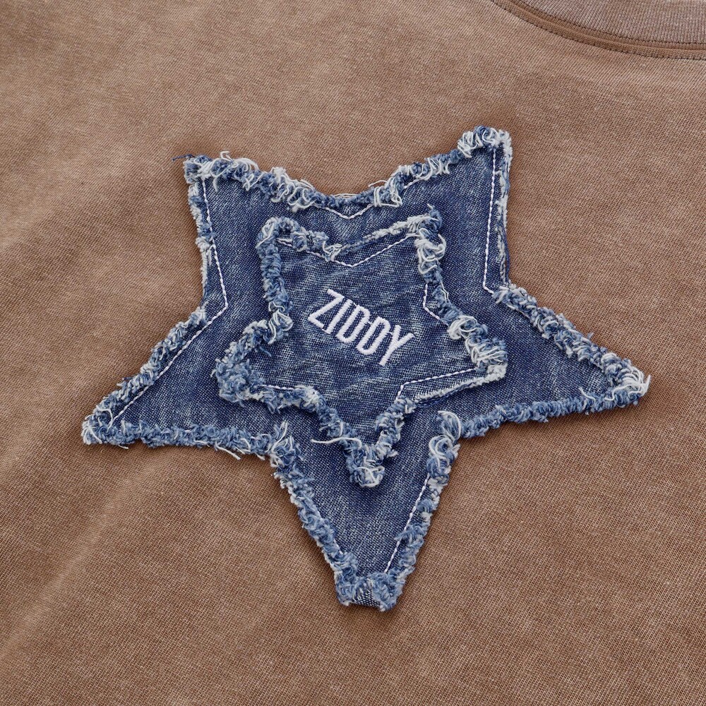 立体感のあるデニム星パッチと、むら染めのヴィンテージカラーが新鮮な1枚。