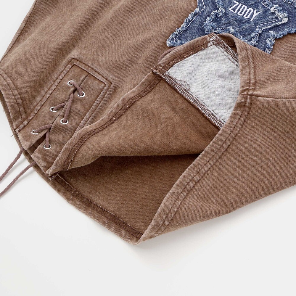 デニム星パッチ、むら染め、レースアップの3要素がトレンド全部盛りのデザイン。