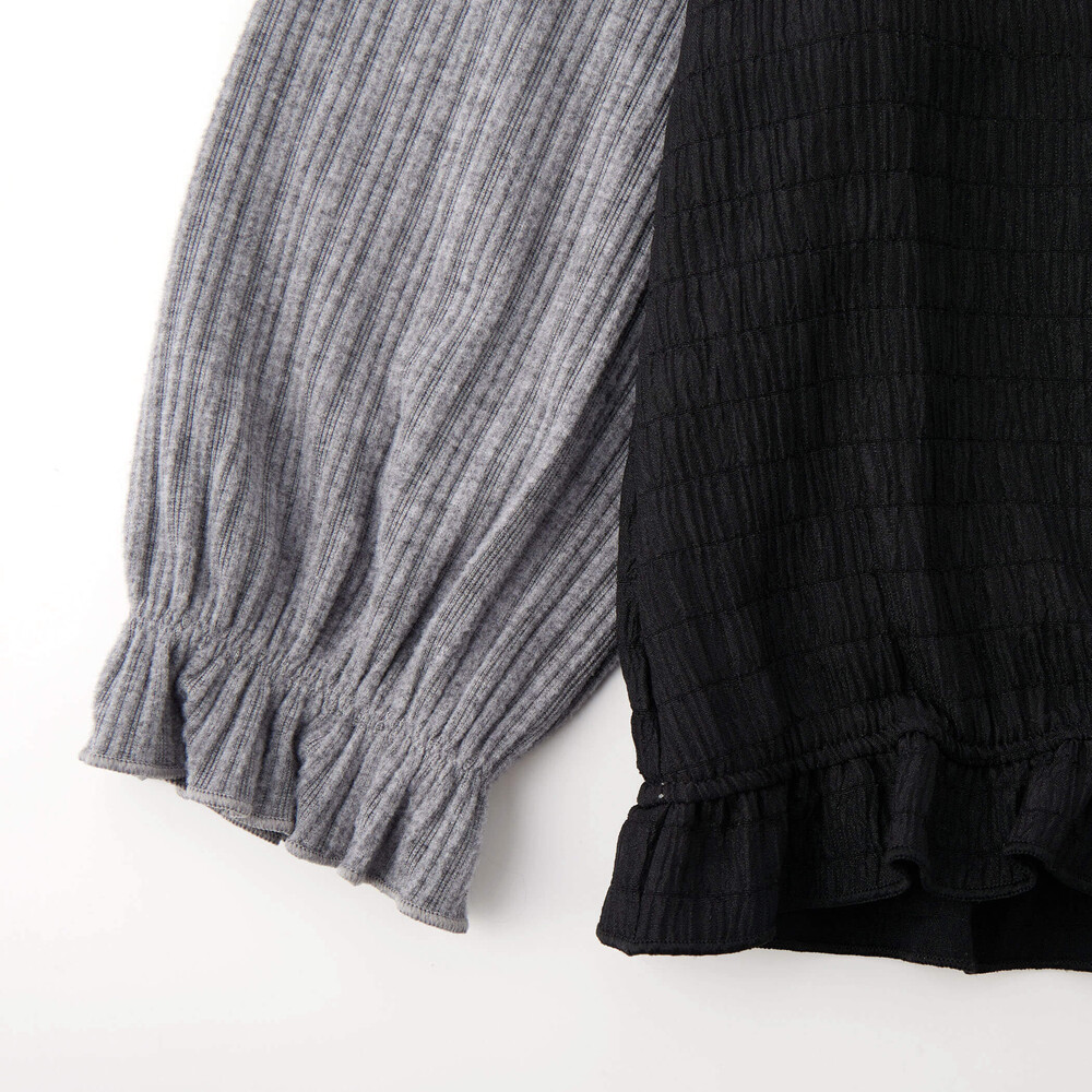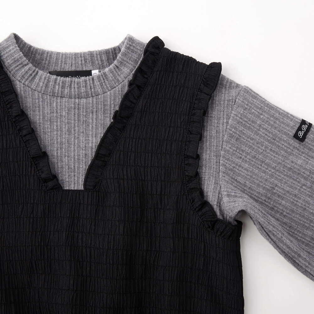 ふんわりギャザーが女の子らしいリブ編みトップスとシャーリングベストがドッキングされたデザインの女の子用セットアップです。