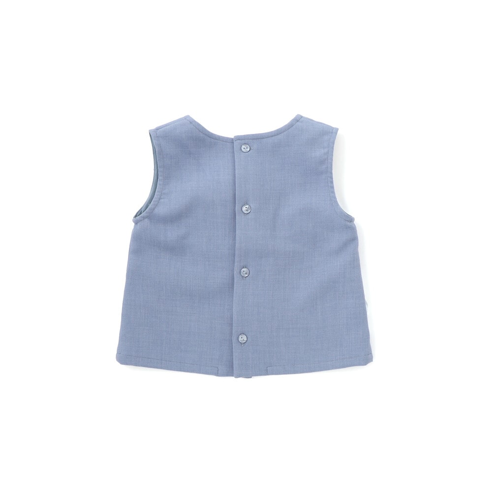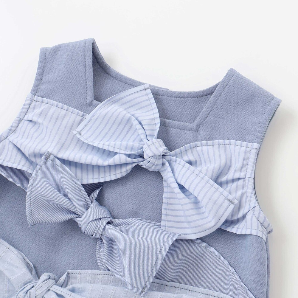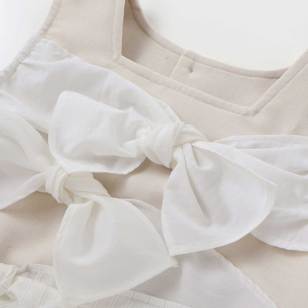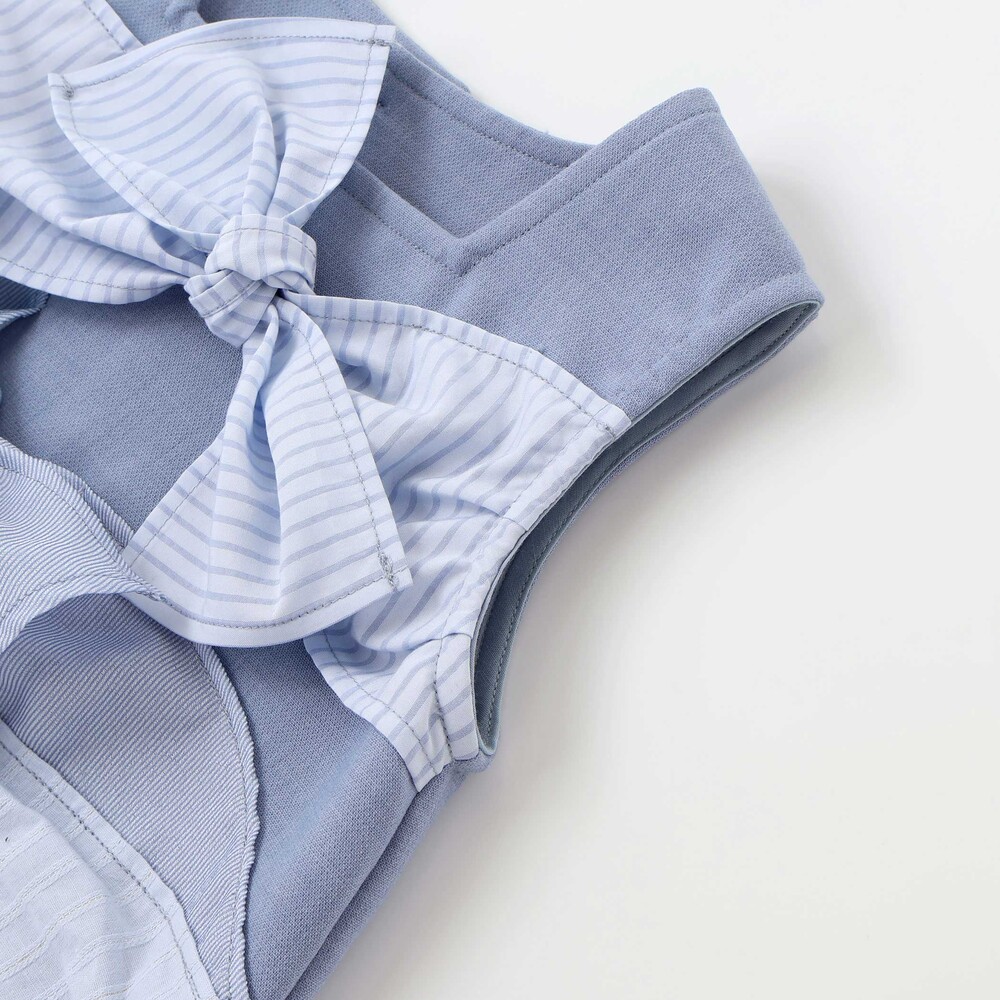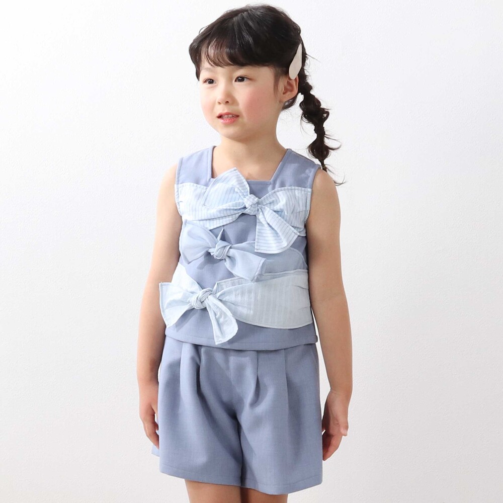トップスはノースリーブ仕様で、胸元とウエスト部分にリボンをあしらい、存在感のある華やかな印象に。