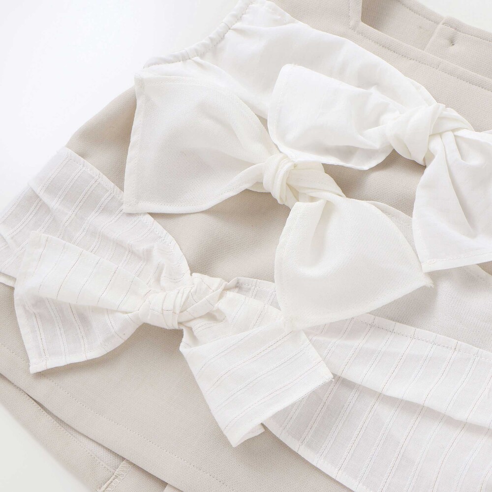 ストライプ柄の大きなリボンデザインが目を引く、上品で可愛らしいセットアップ。