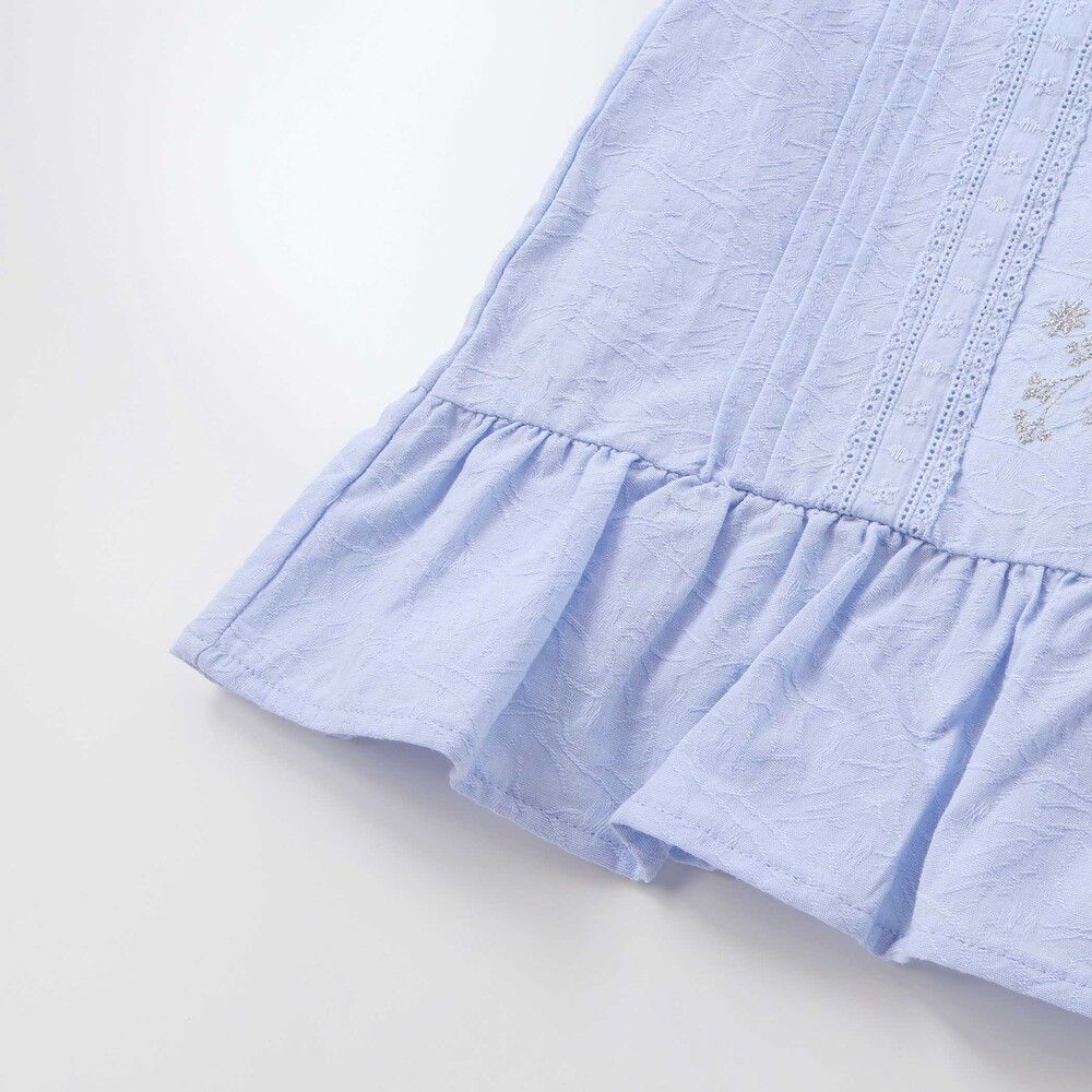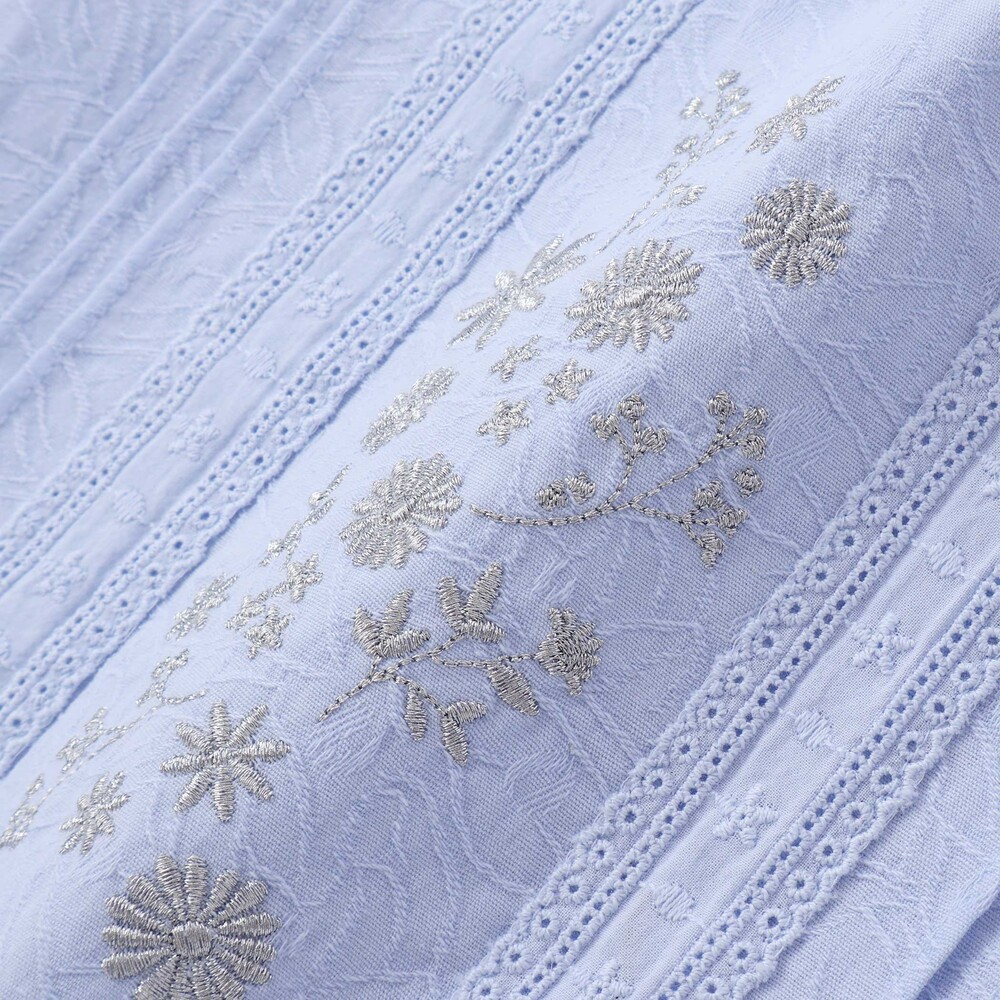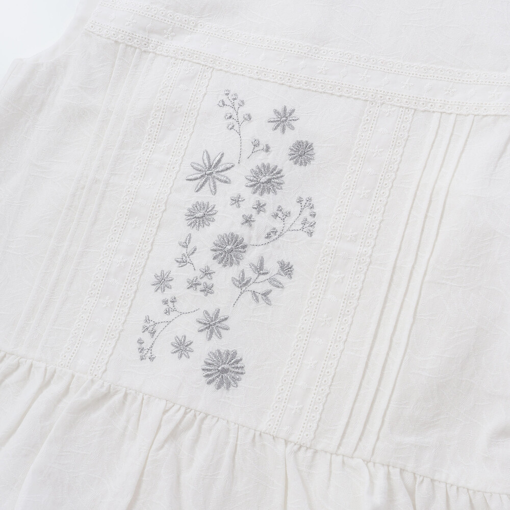 上品な花刺しゅうとピンタック、縦レースを贅沢にあしらったブラウスは、ふんわりフリルで華やかさアップ。