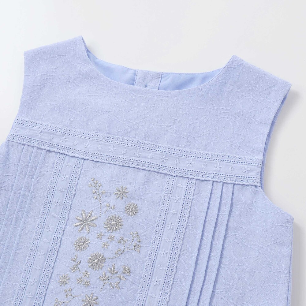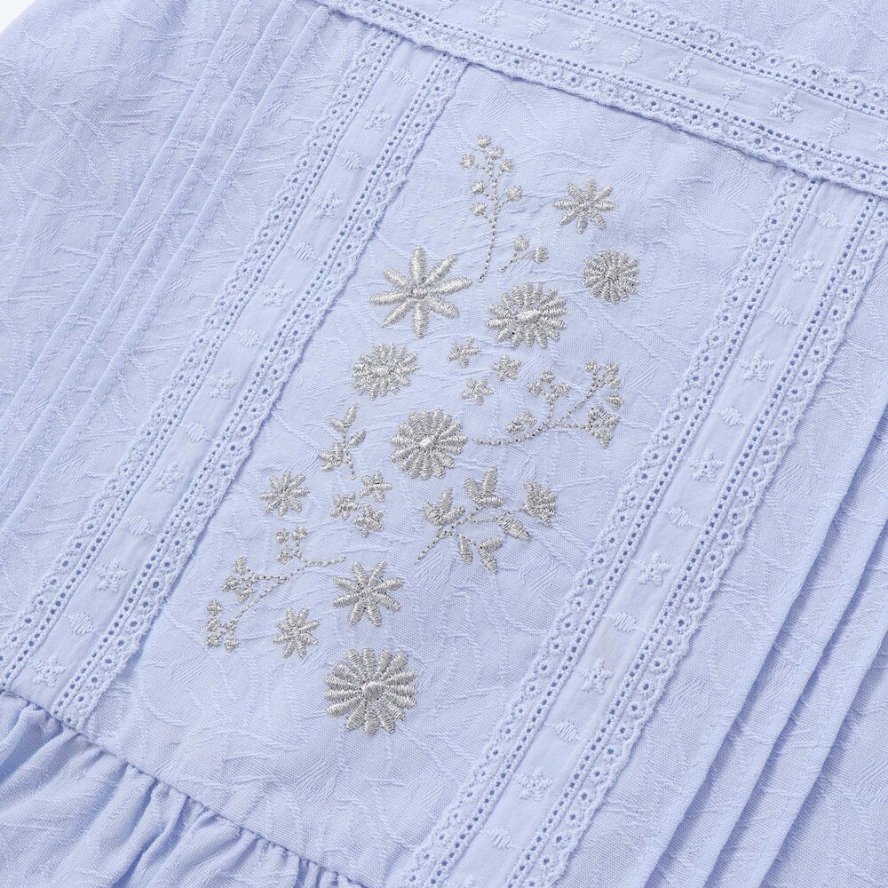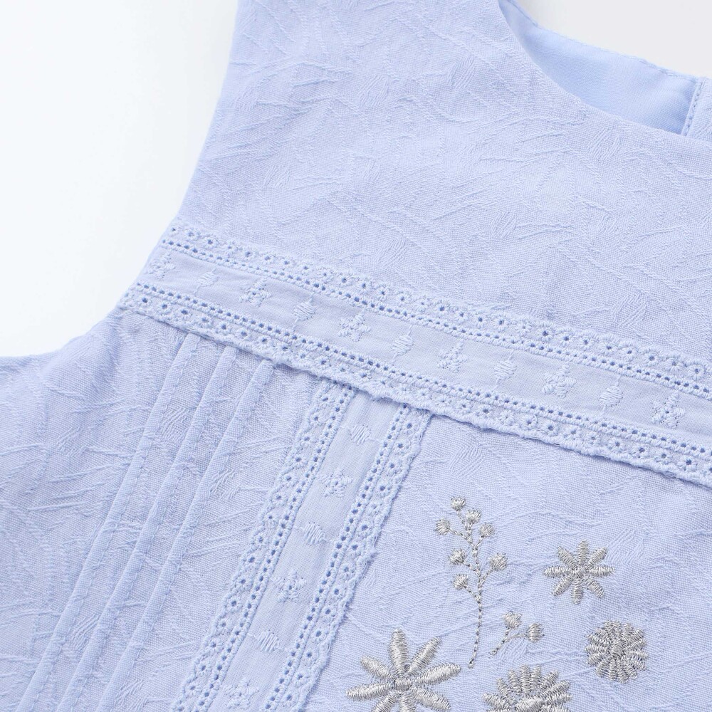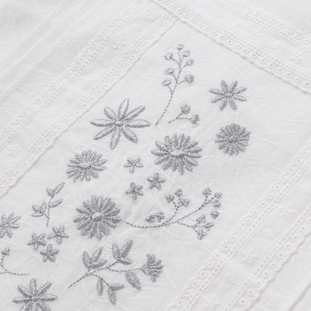 上品な花刺しゅうとピンタック、縦レースを贅沢にあしらったブラウスは、ふんわりフリルで華やかさアップ。