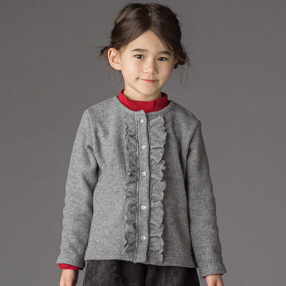 銀糸が編みこまれた上品なラメニットを使用した女の子用フリルカーディガン。