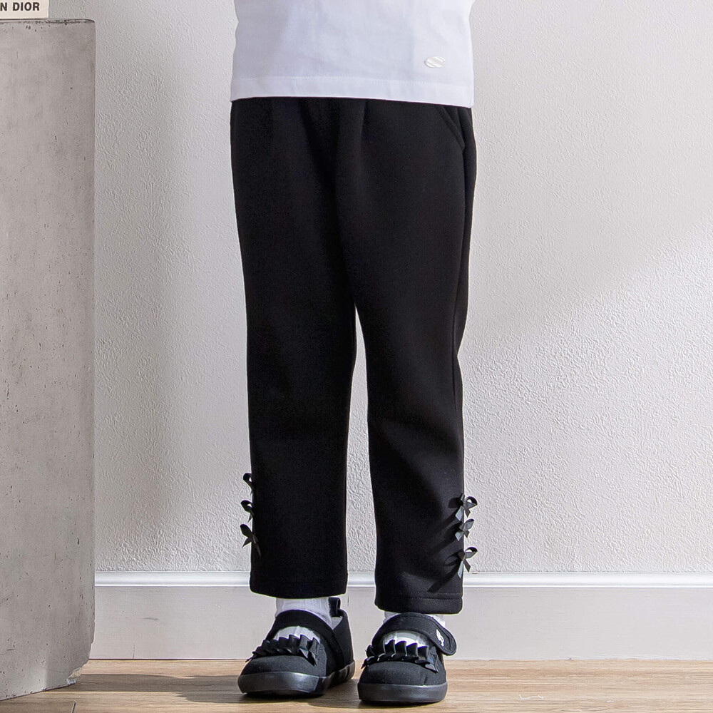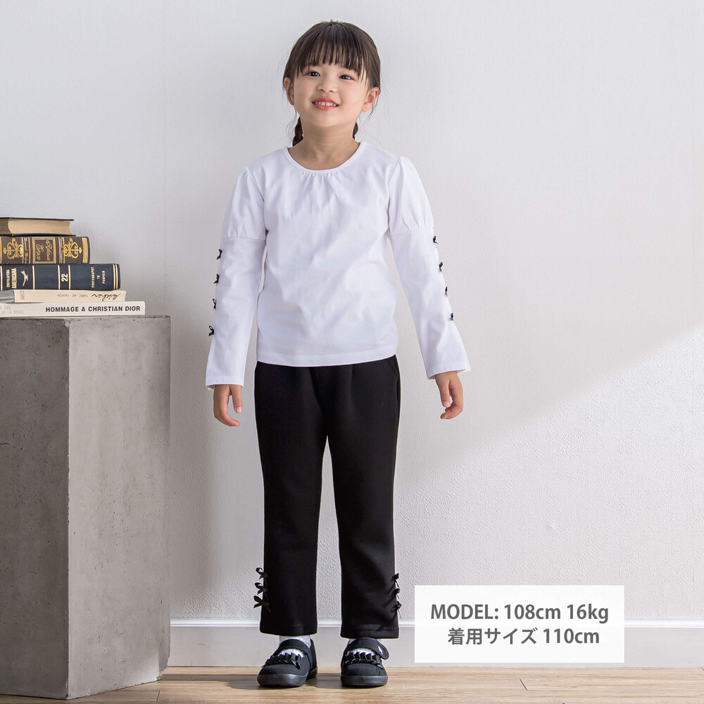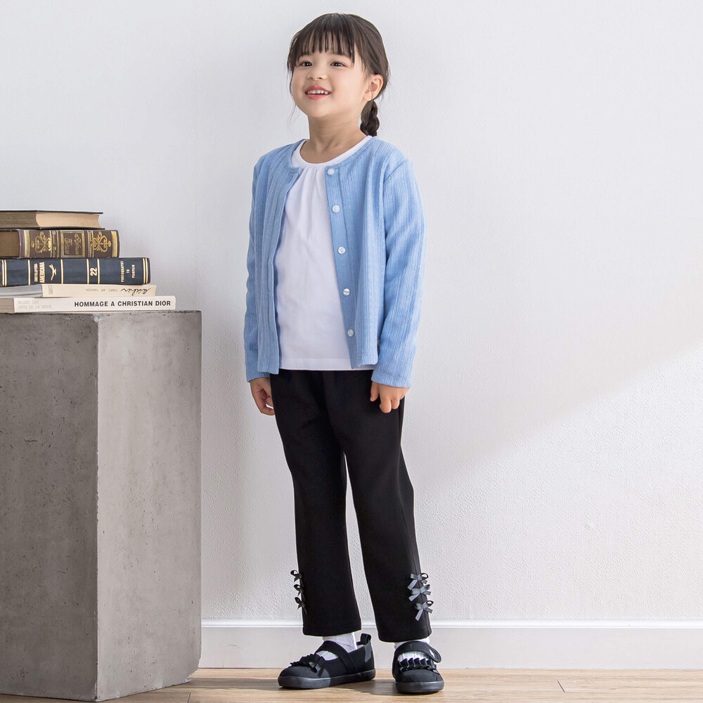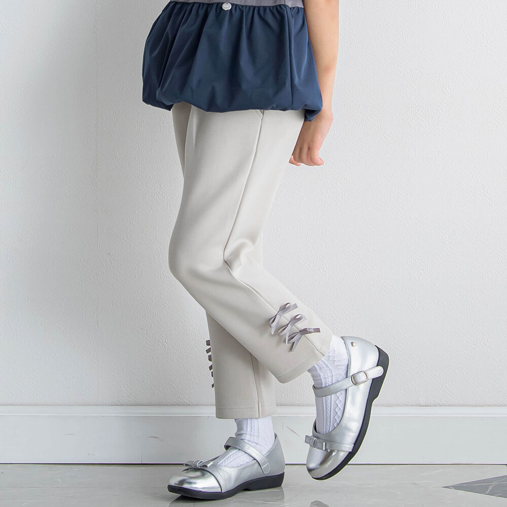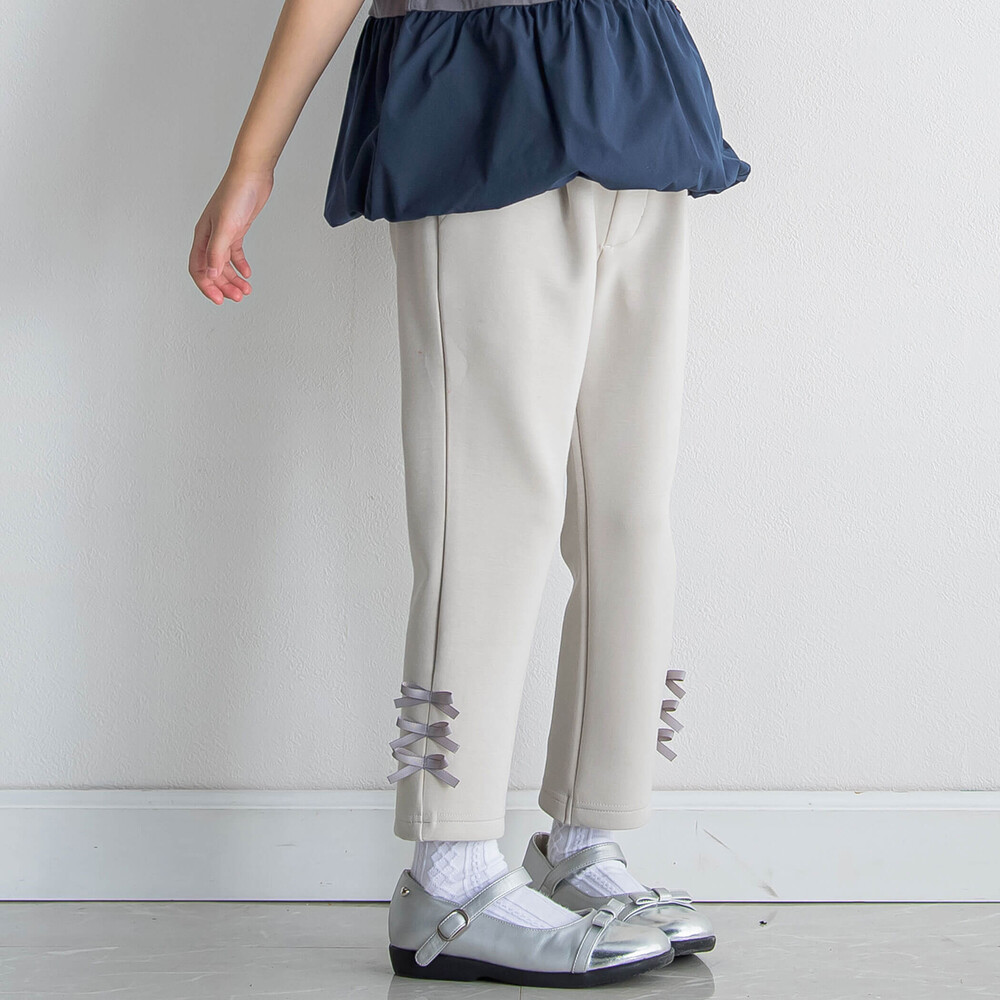 裾にならんだグログランリボンがかわいい女の子用ロングパンツ。