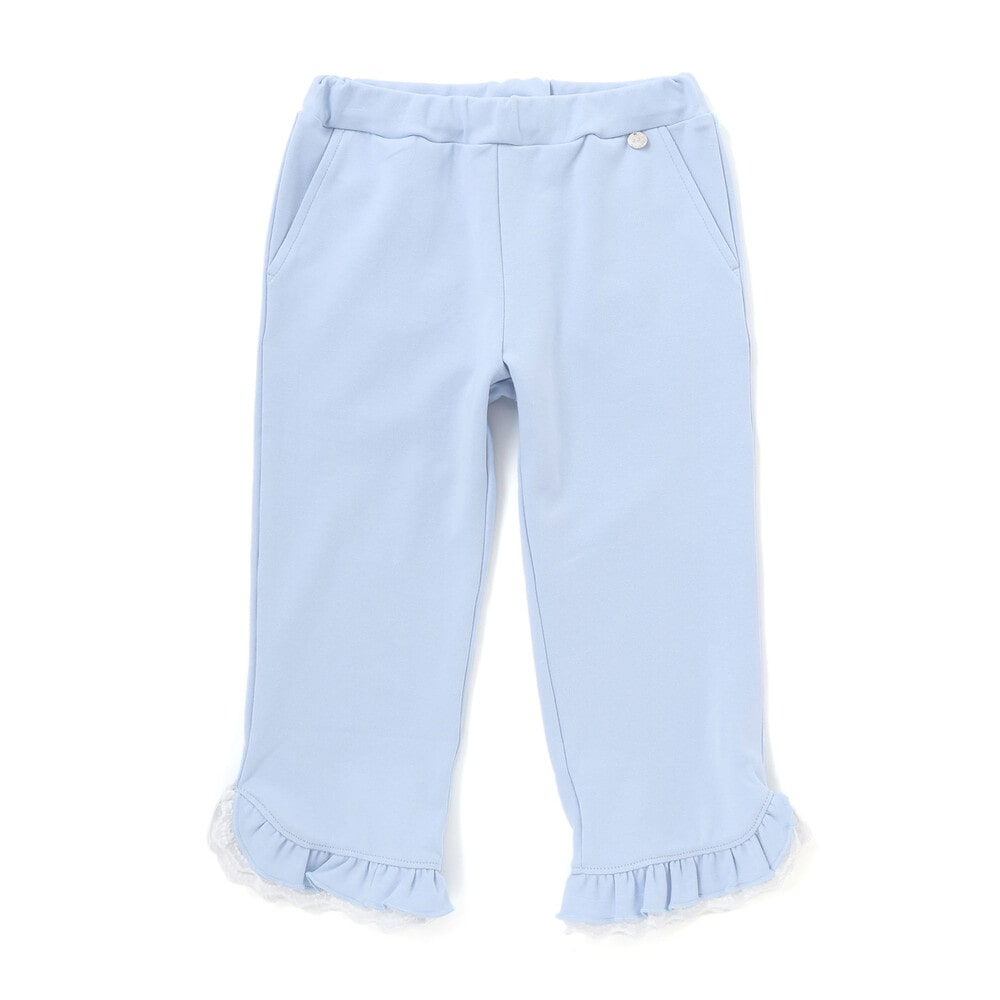 裾のフリルとレース使いが可愛らしい、女の子らしさ満点のストレートパンツ。