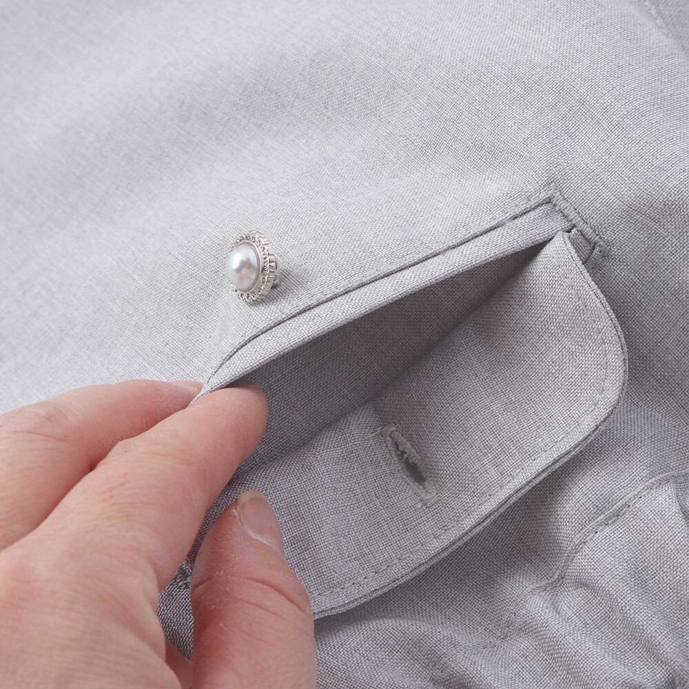 フラップ付きポケットに“シルバー×パール”のボタンを添え、フォーマルにも使える華やかさをプラスしました。
