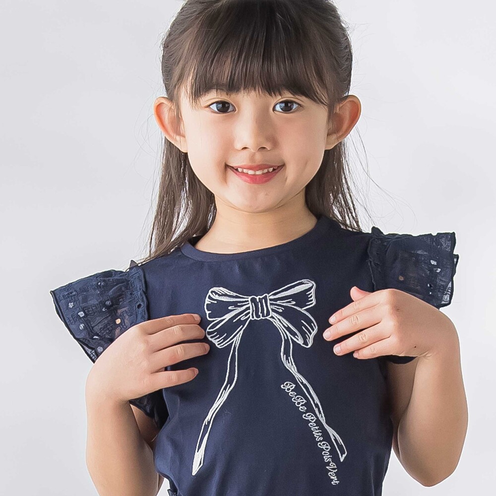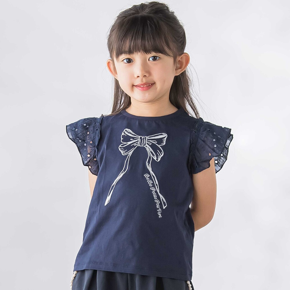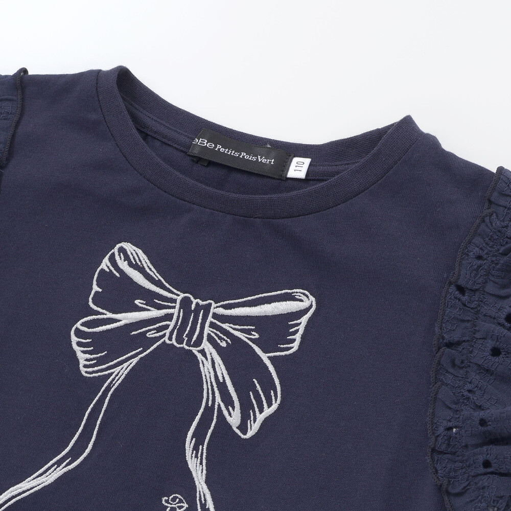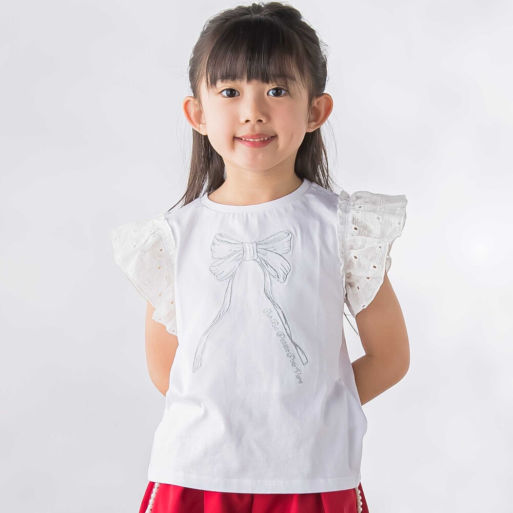 ふんわり袖×きらめくリボンで、とびきり可愛いが叶う、女の子用リボン刺しゅうTシャツ。