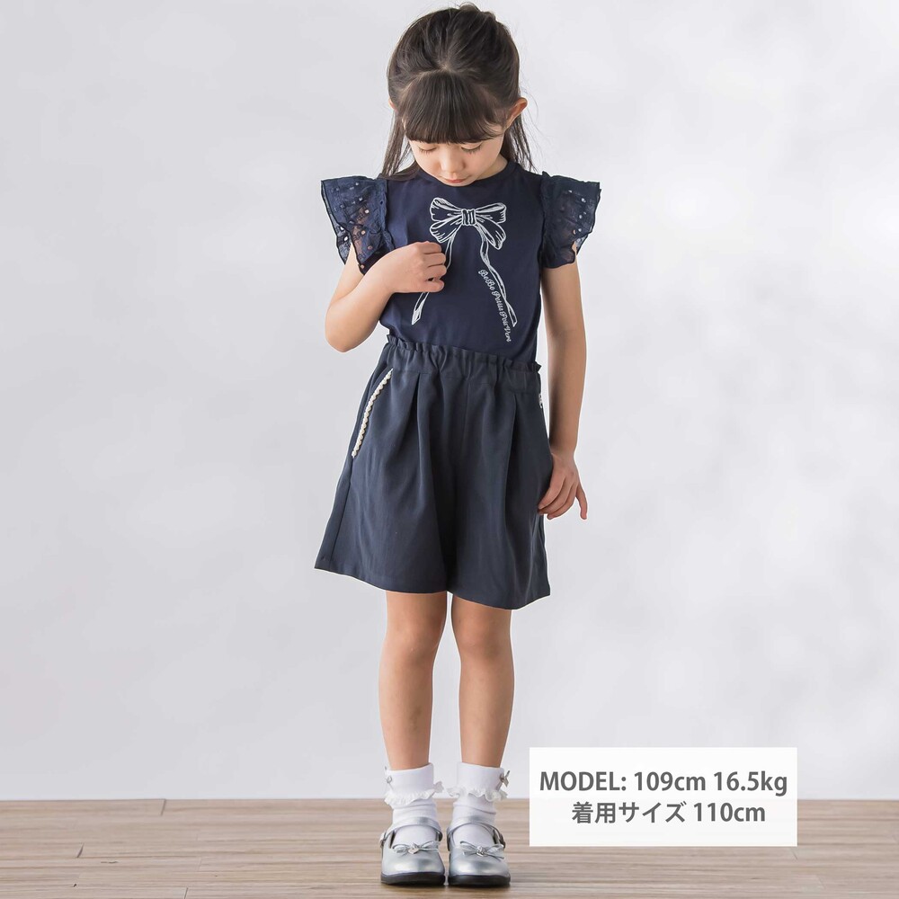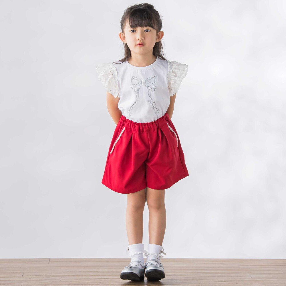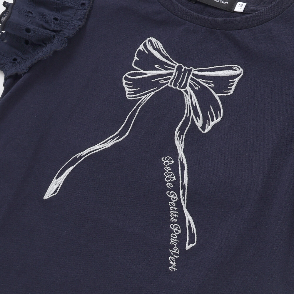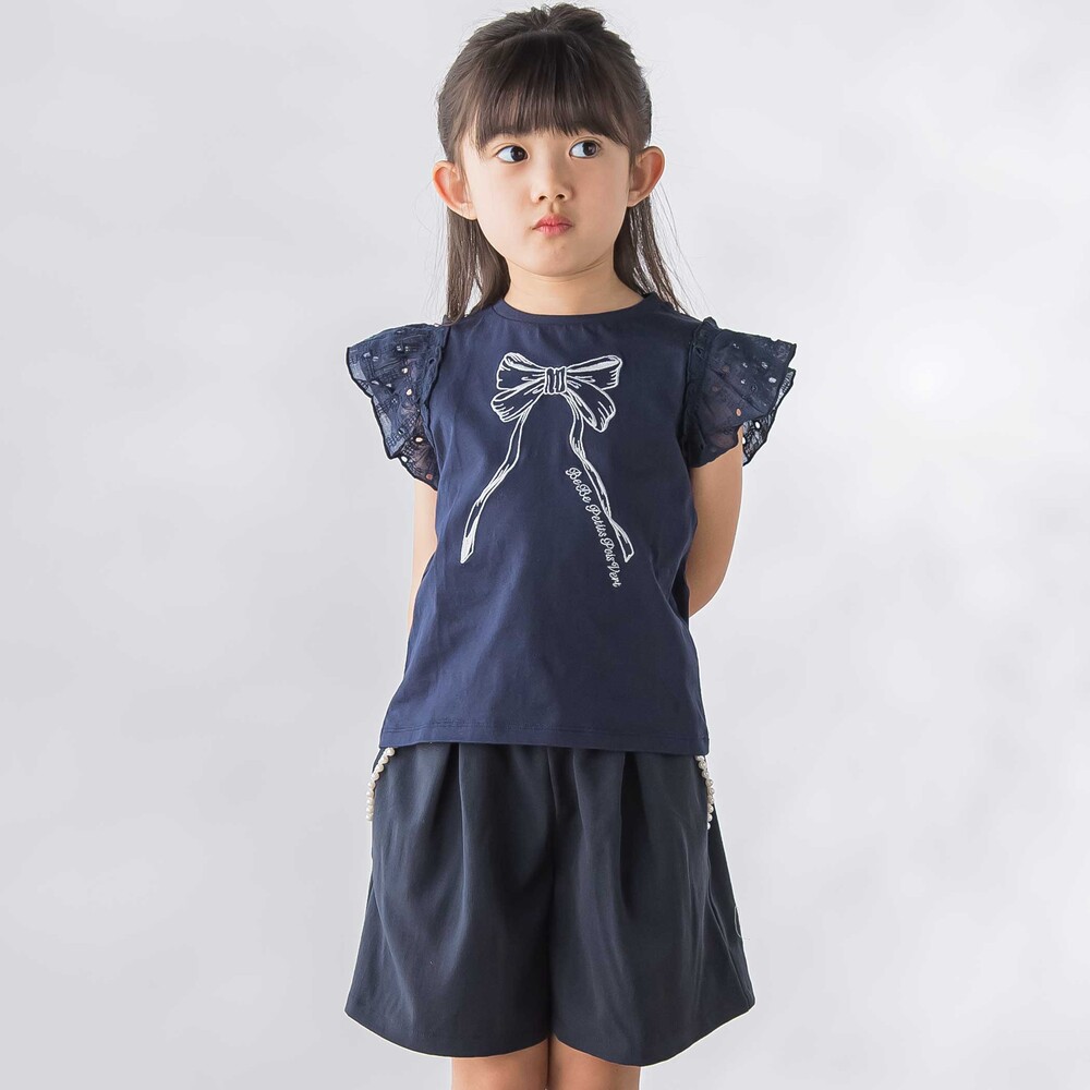 ふんわり袖×きらめくリボンで、とびきり可愛いが叶う、女の子用リボン刺しゅうTシャツ。