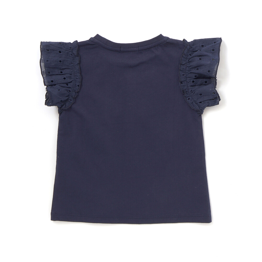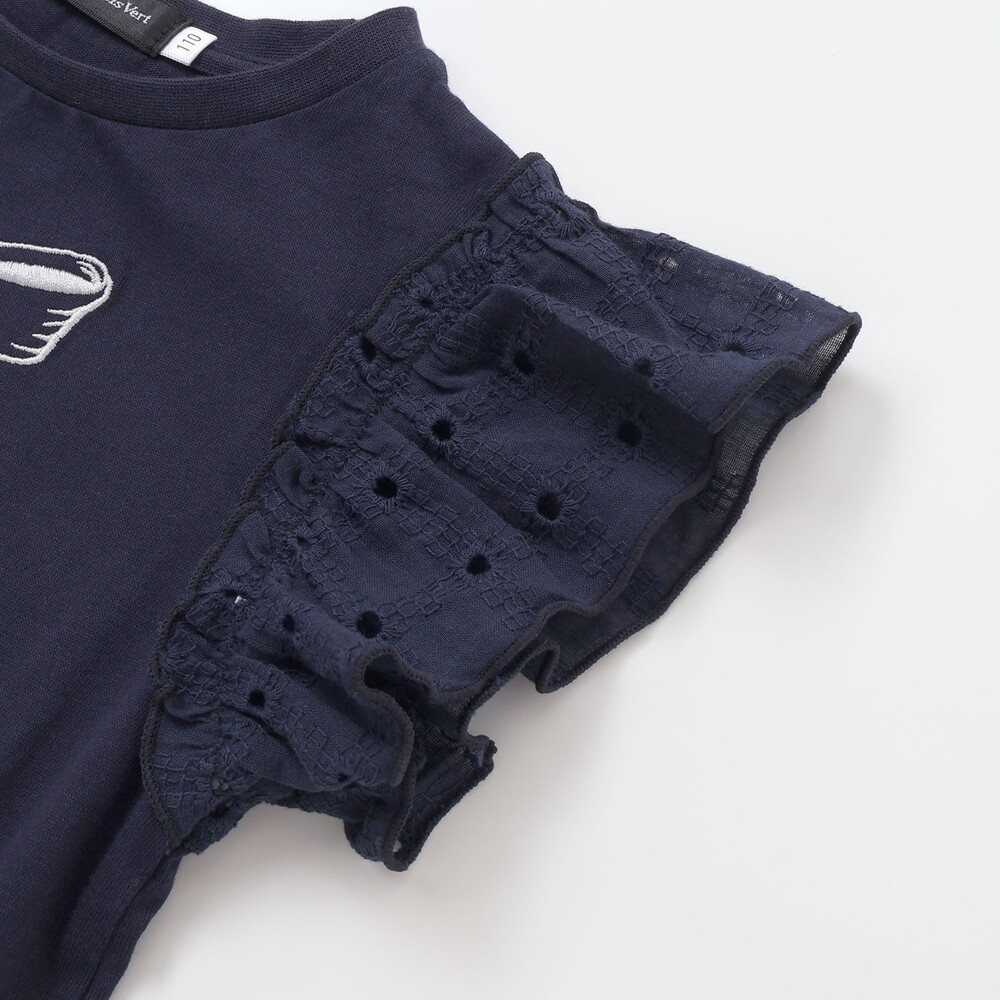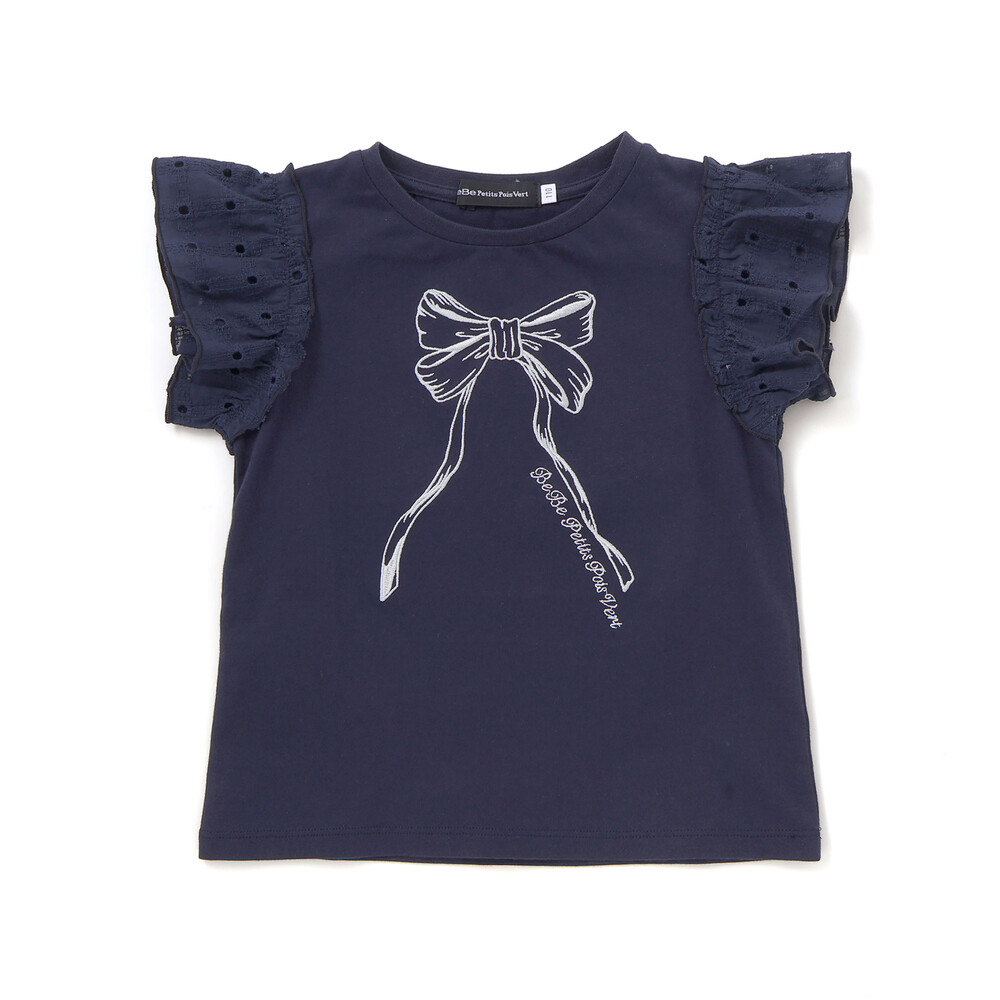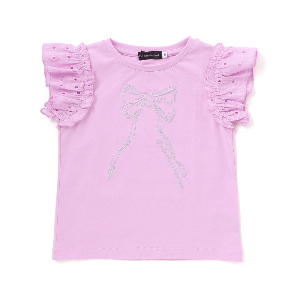 繊細なレースフリル袖と光沢糸を使ったリボン刺しゅうがポイントの、着映えするガーリーTシャツ。