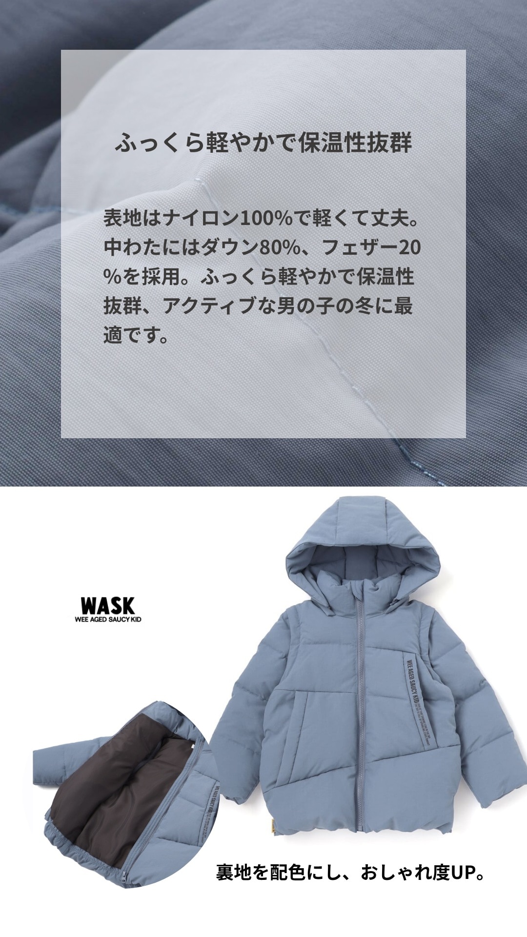 ふっくら軽やかで保温性抜群、アクティブな男の子の冬に最適です。