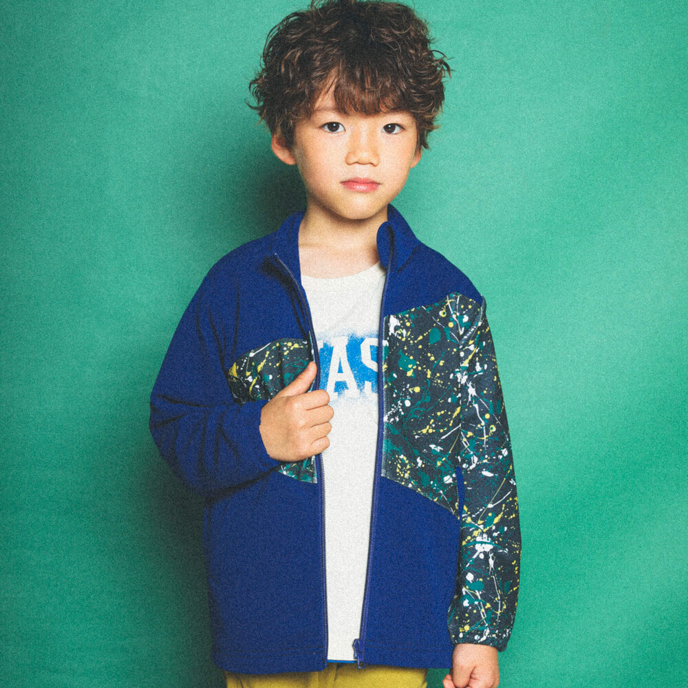ペンキを飛ばしたような総柄プリントが印象的な長袖ライトジャケット。