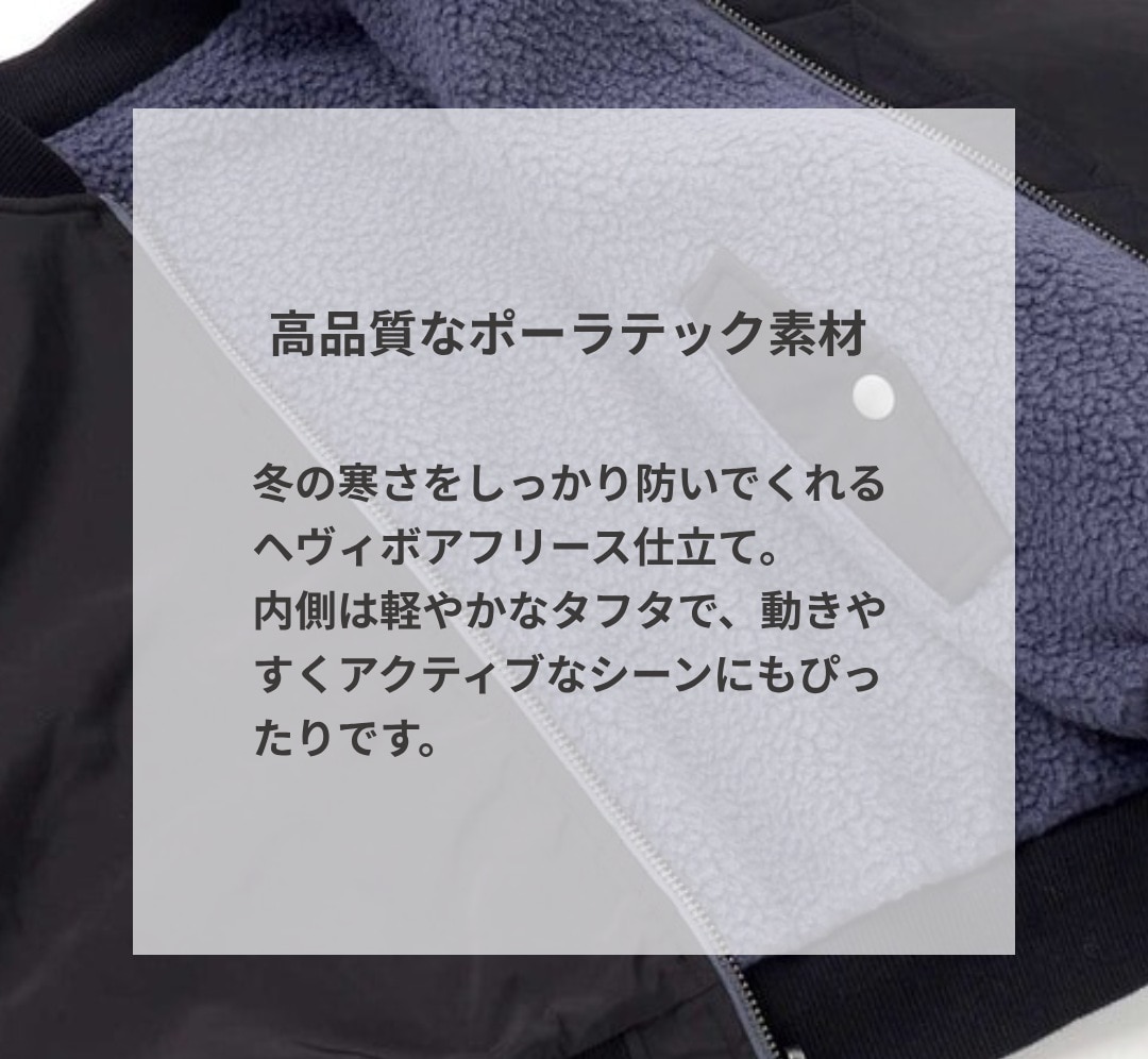 高品質なポーラテック素材を使用し、冬の寒さをしっかり防いでくれるヘヴィボアフリース仕立て。