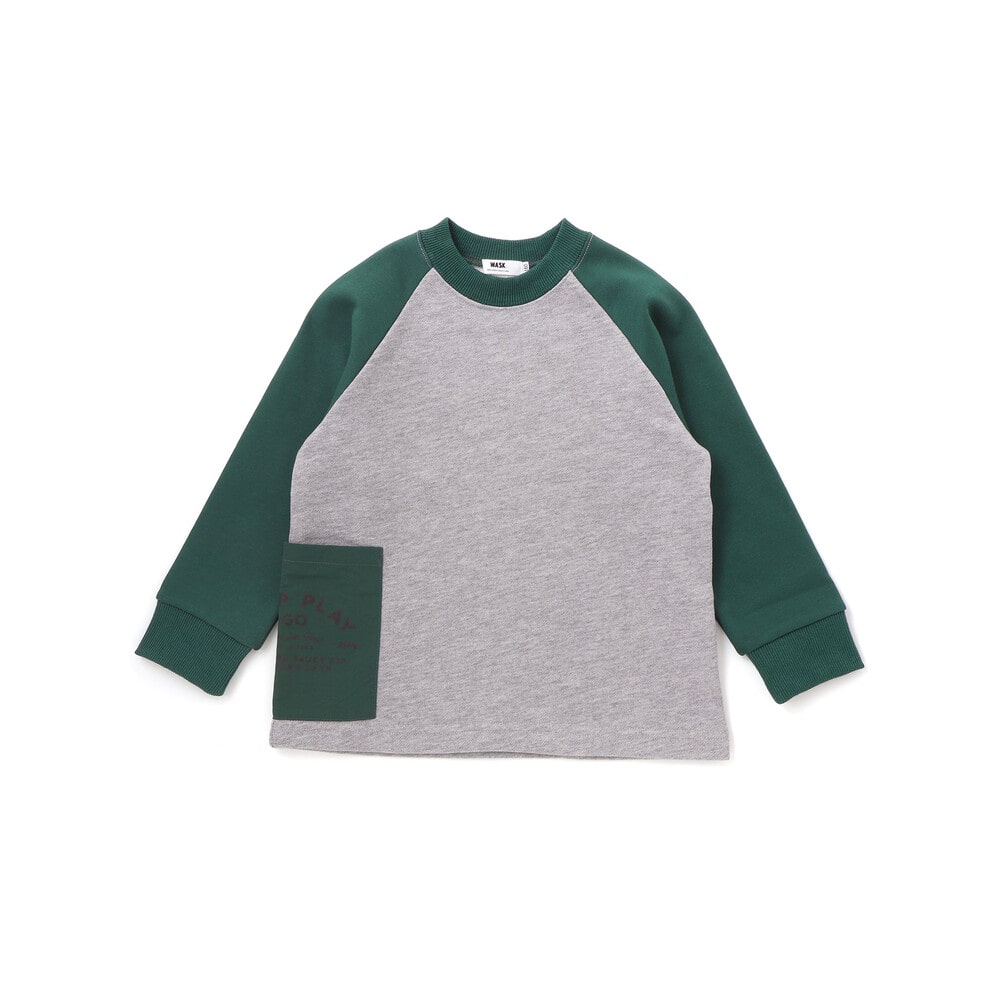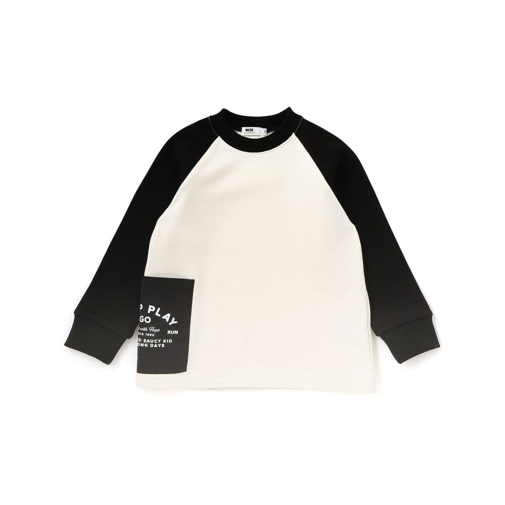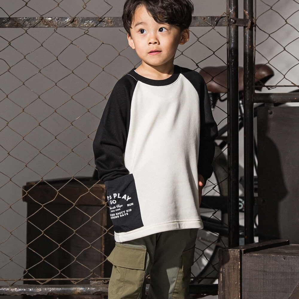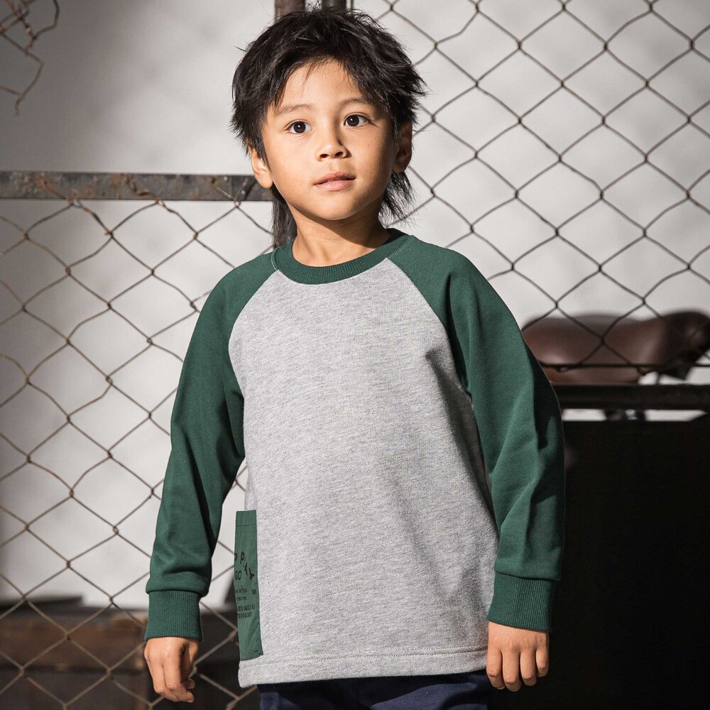 袖の切り替えデザインが目を引くバイカラーラグラントレーナー。
