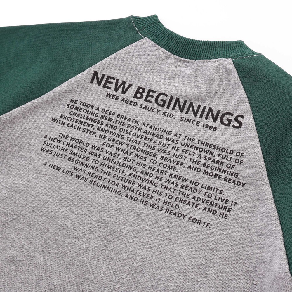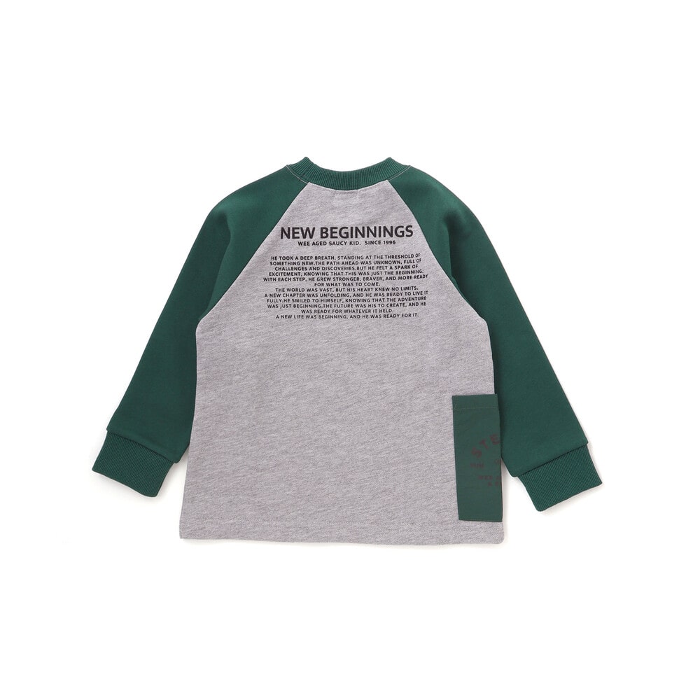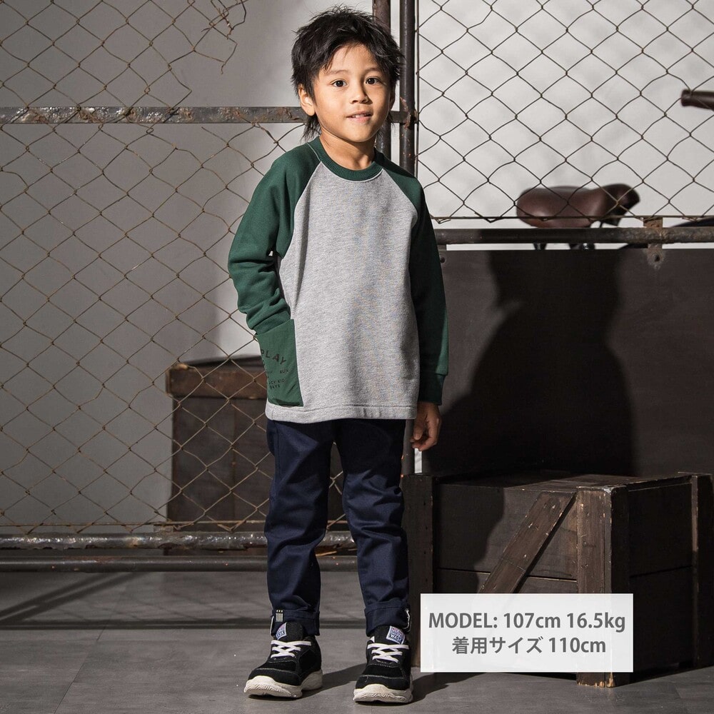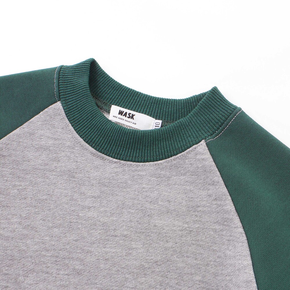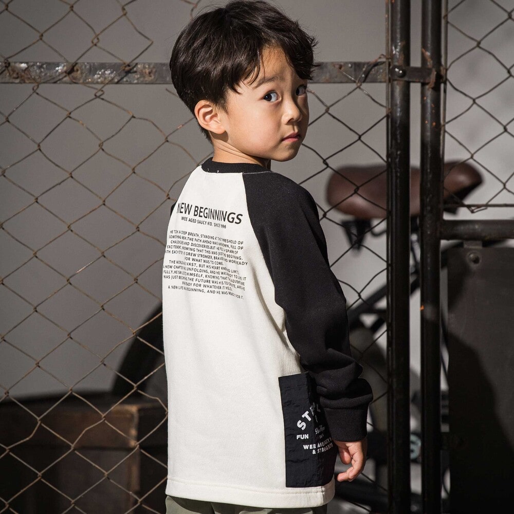 袖の切り替えデザインが目を引くバイカラーラグラントレーナー。