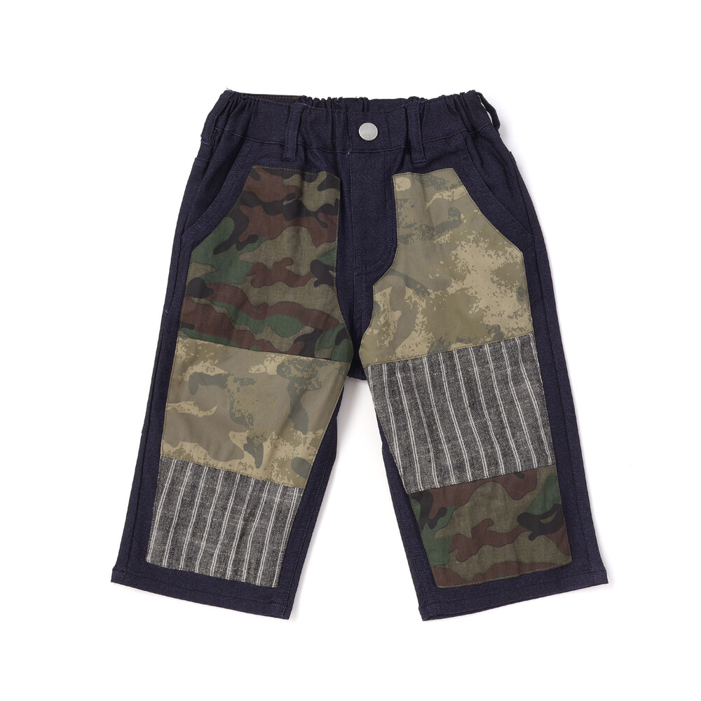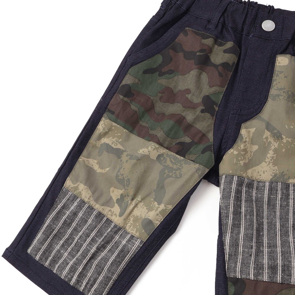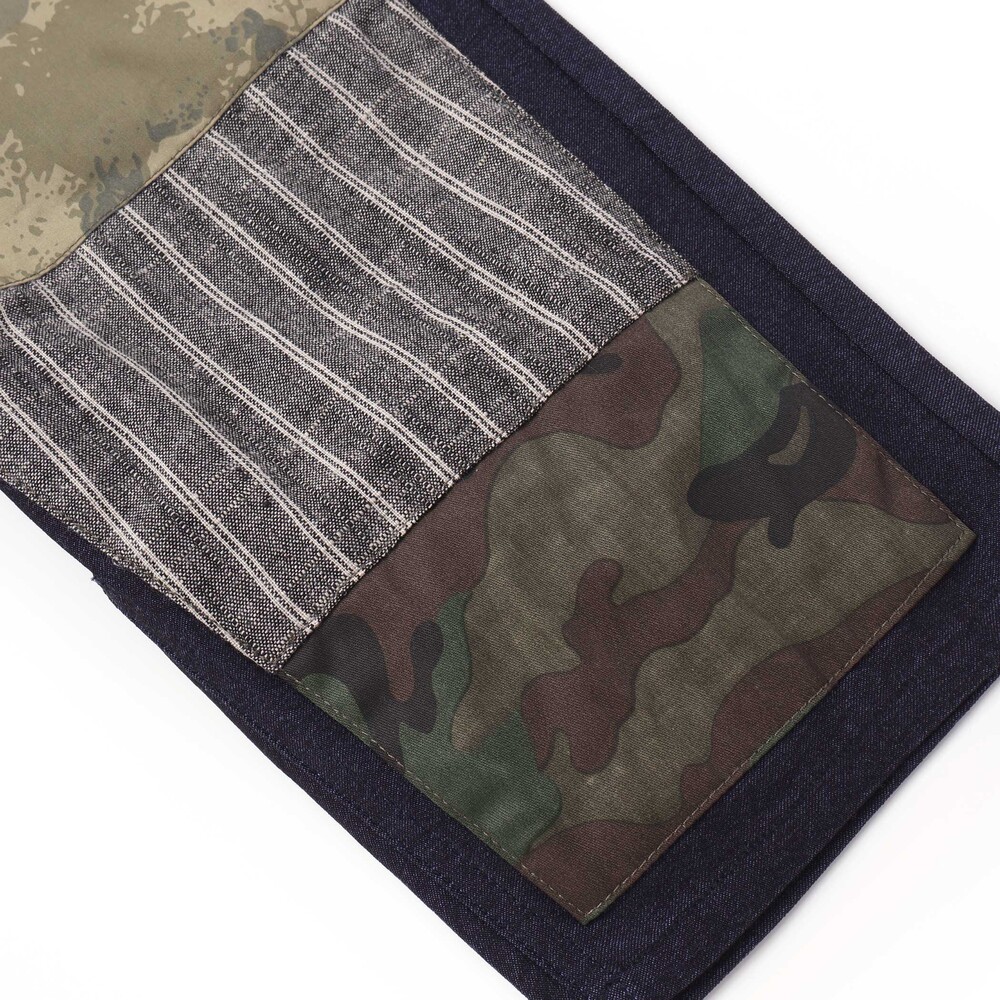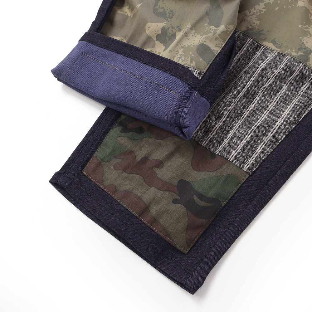 迷彩柄とストライプ柄を組み合わせたパッチワークが、クラフト感とかっこよさをプラス。