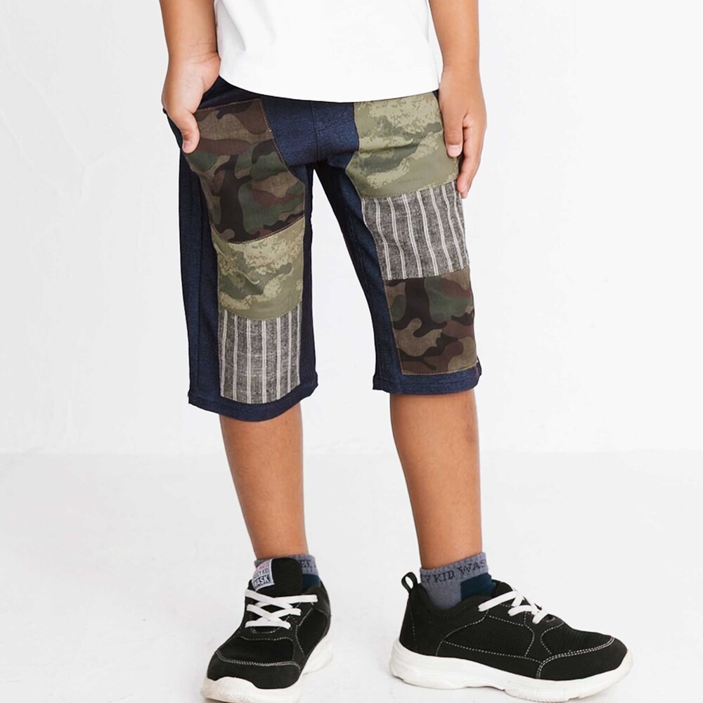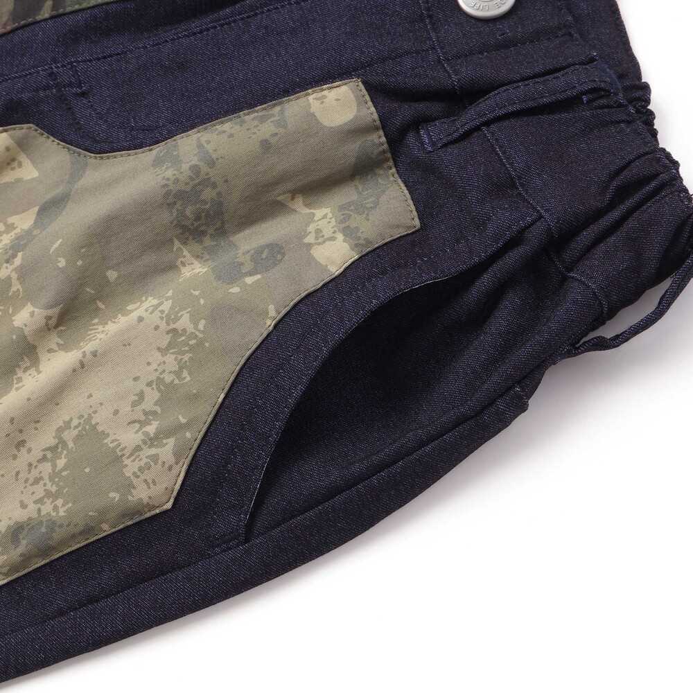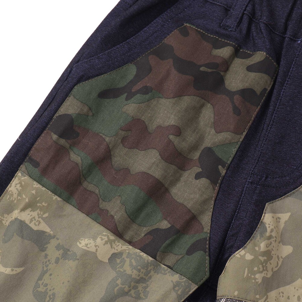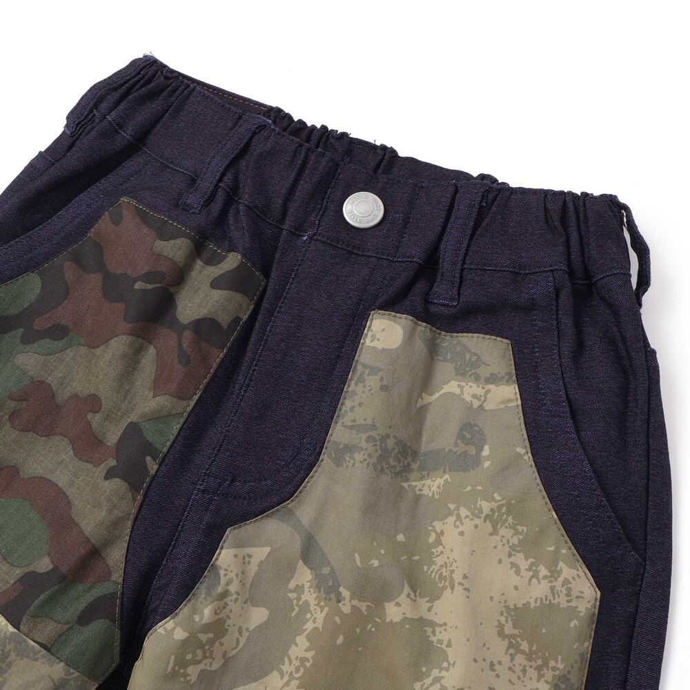迷彩柄とストライプ柄を組み合わせたパッチワークが、クラフト感とかっこよさをプラス。