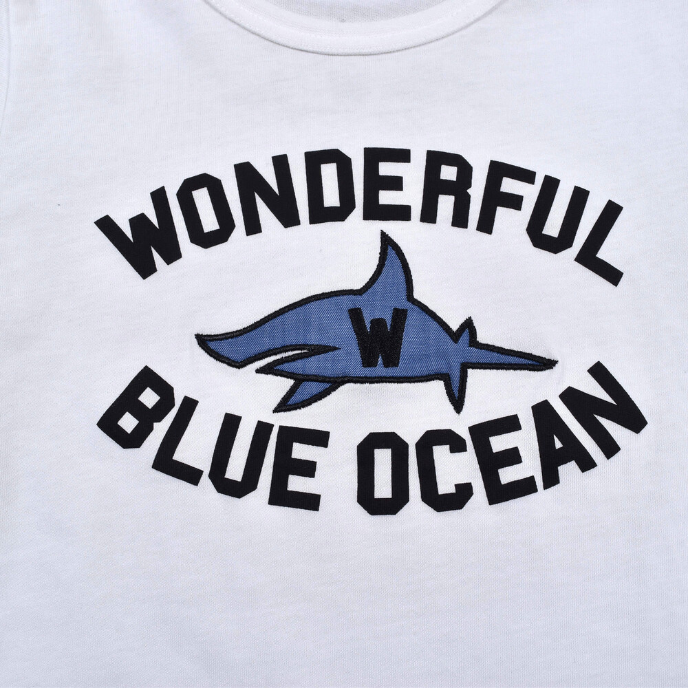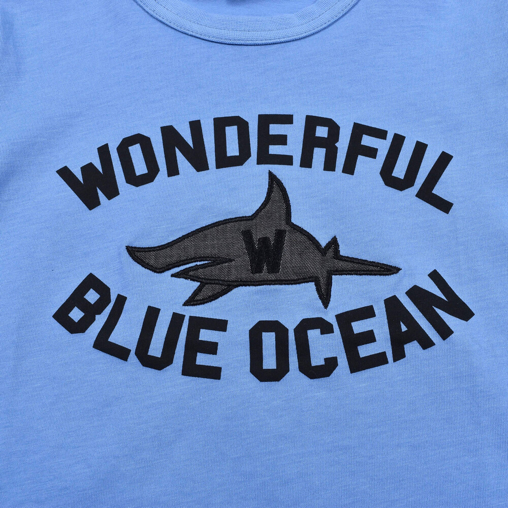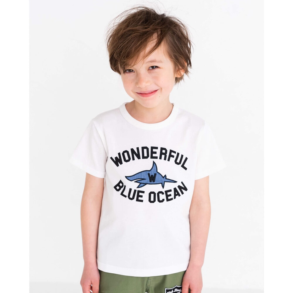 毎年人気のサメTシャツはダンガリーをパッチワークしたデザインに。