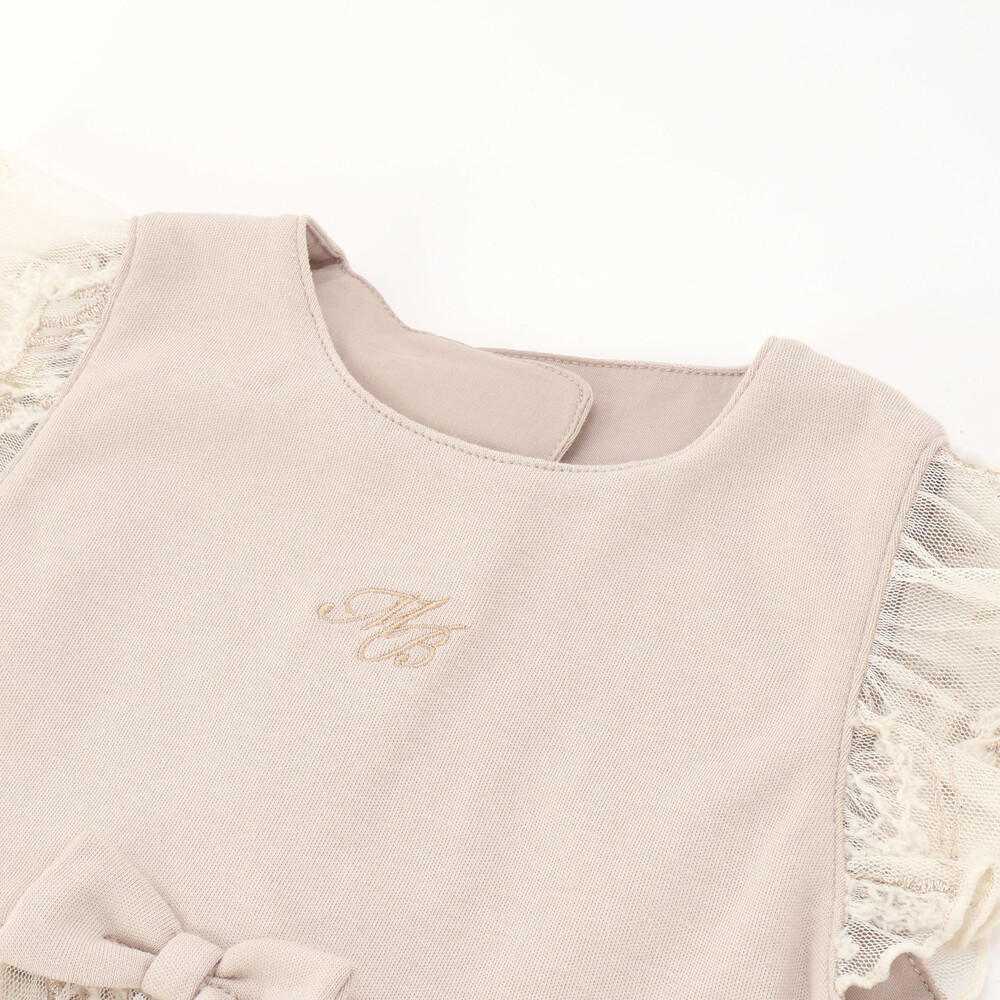 ウエスト部分にはリボン、胸元にはさりげないロゴ刺しゅうがアクセントに。