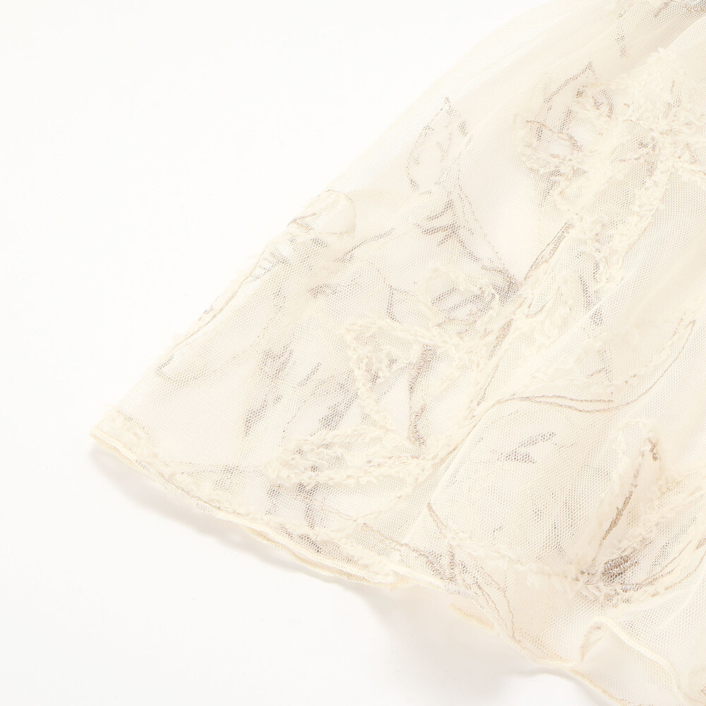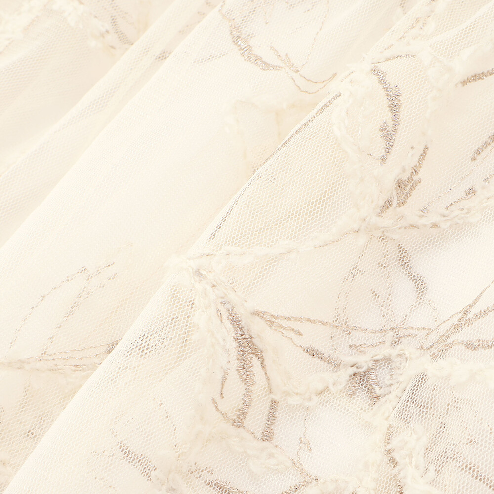柔らかく透け感のあるチュール生地に、ふんわりとしたモール糸で刺しゅうを施した素材。
