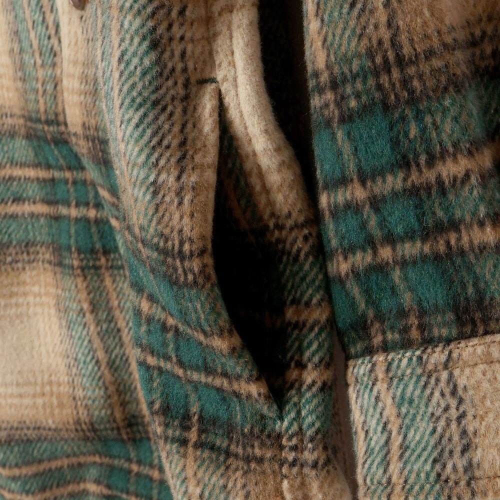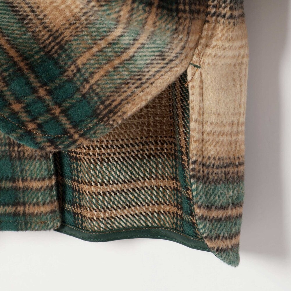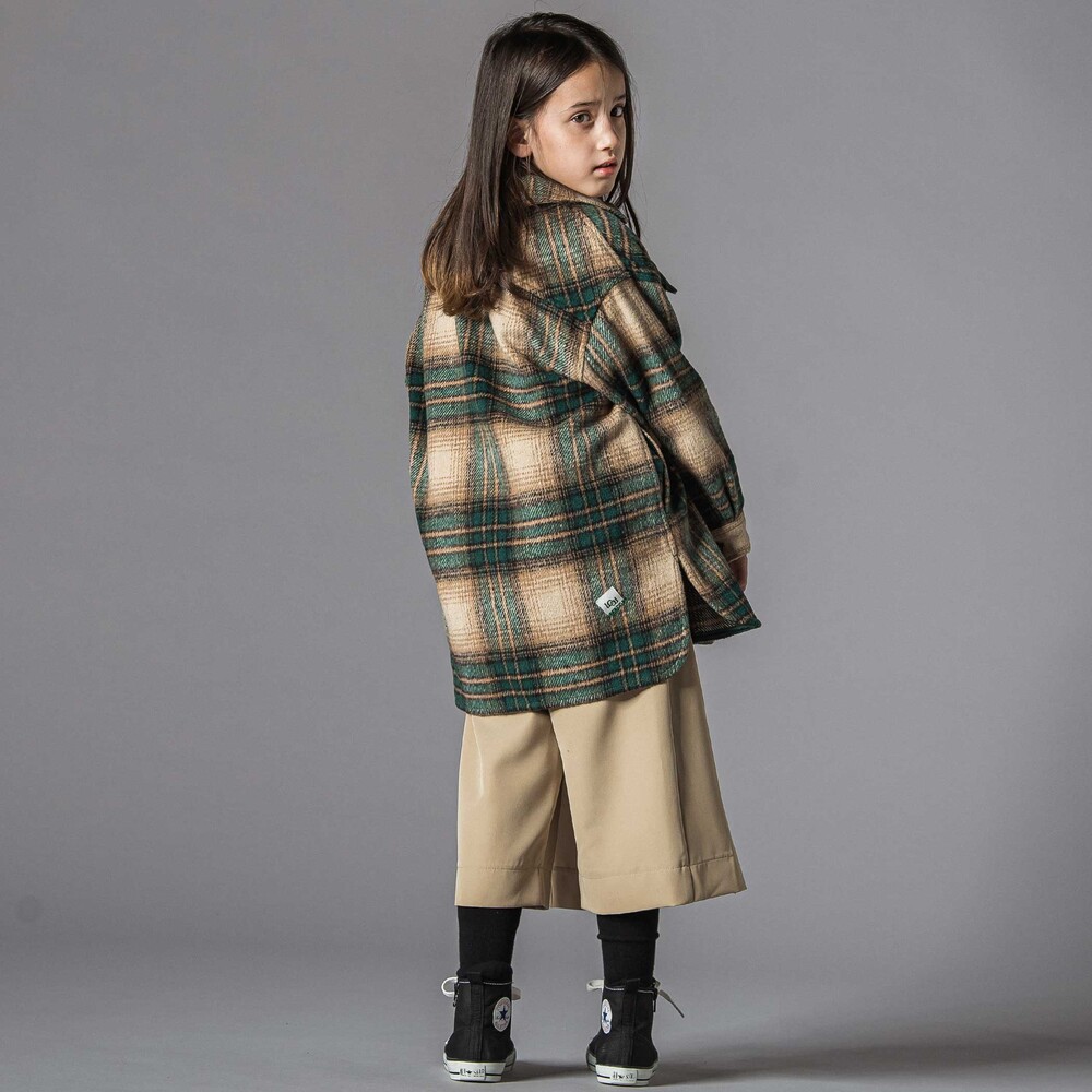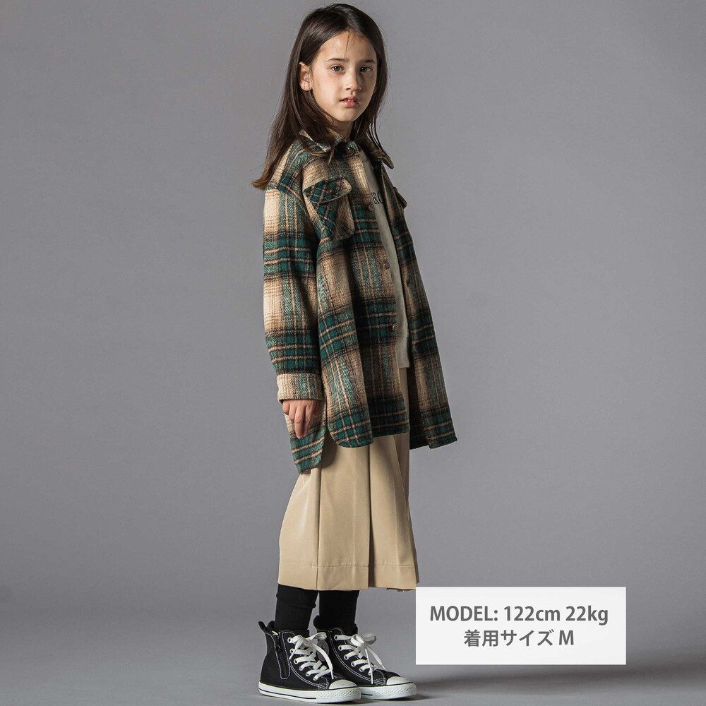 グリーン・ベージュ・ブラウンを基調としたタータンチェック柄が、秋冬らしい温もりとクラシックな雰囲気を演出。