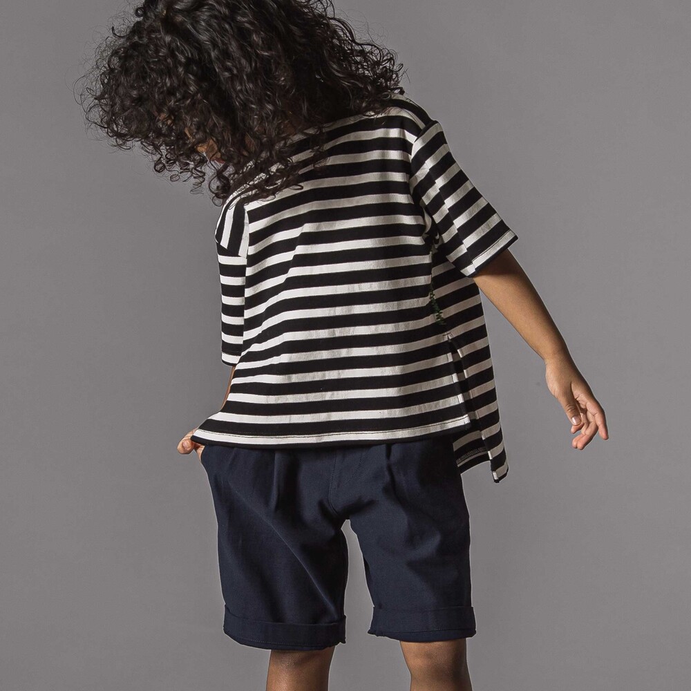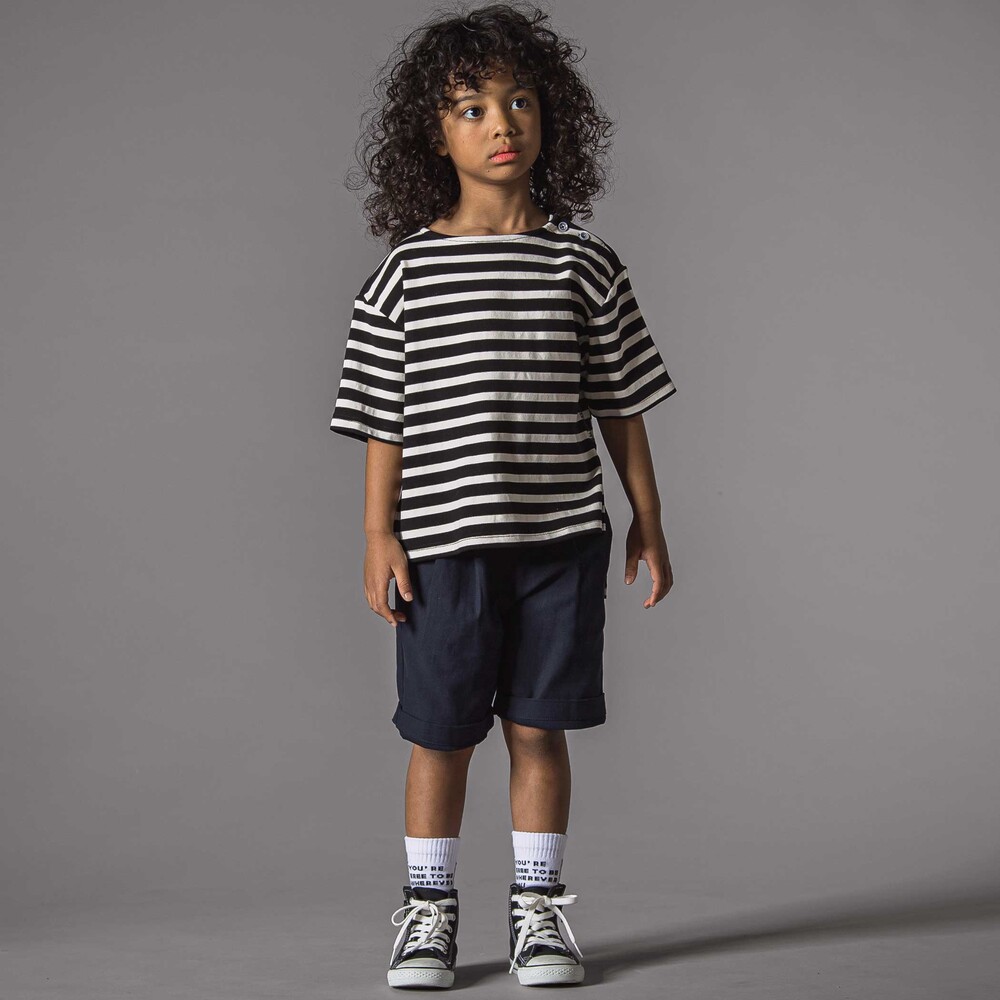 身幅にゆとりを持たせたシルエットとマリン風の肩のボタンがポイント。