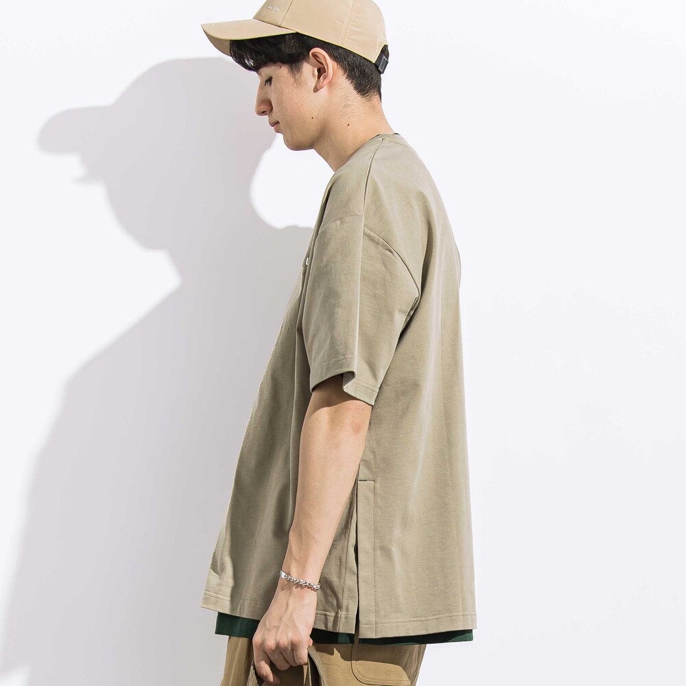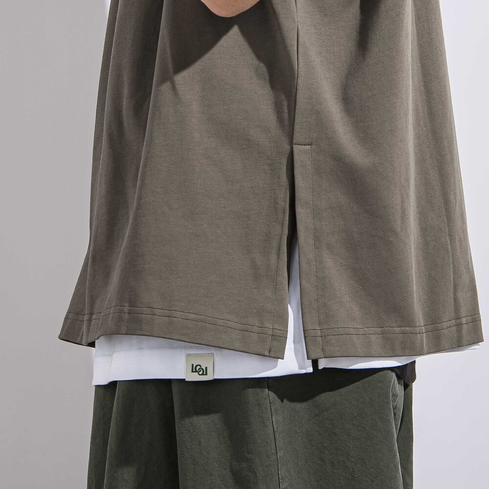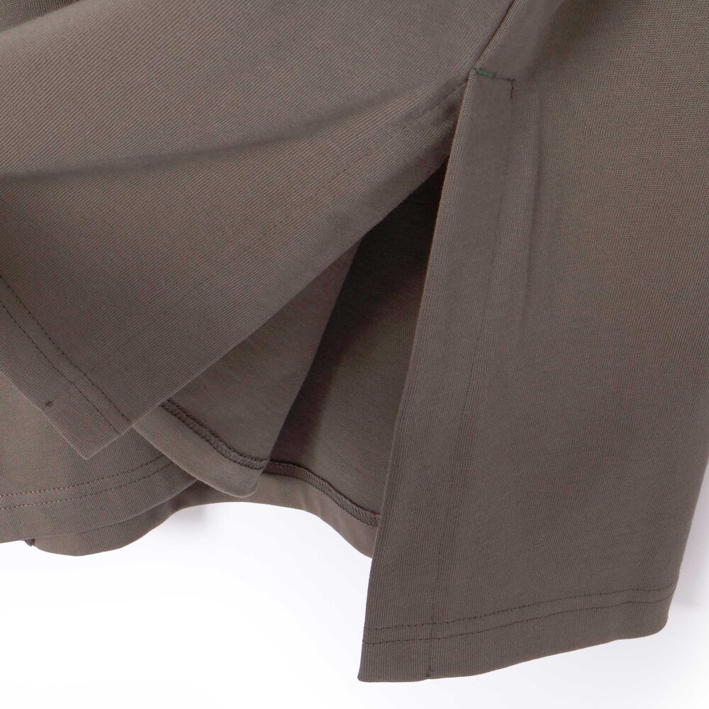 1枚(チャコール・淡カーキ)は脇に深めのスリットを入れ、胸元にロゴ刺しゅう並べたシンプルなデザイン。
