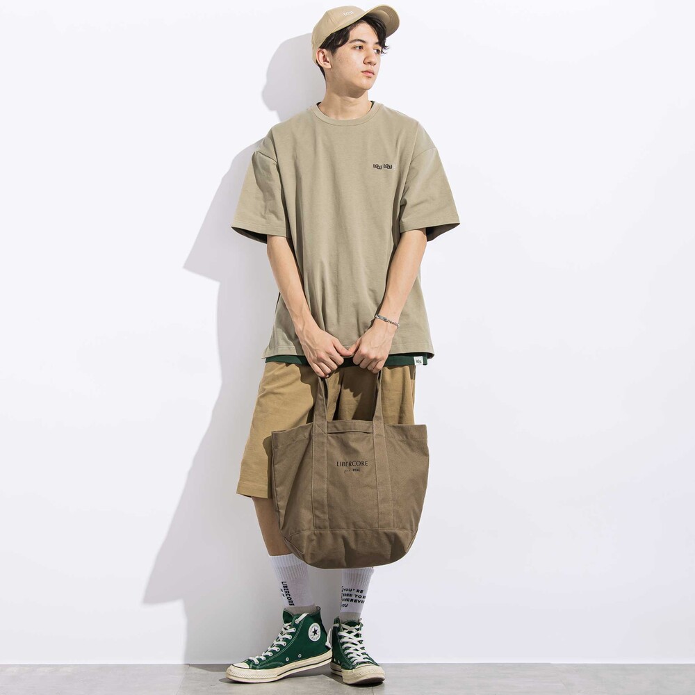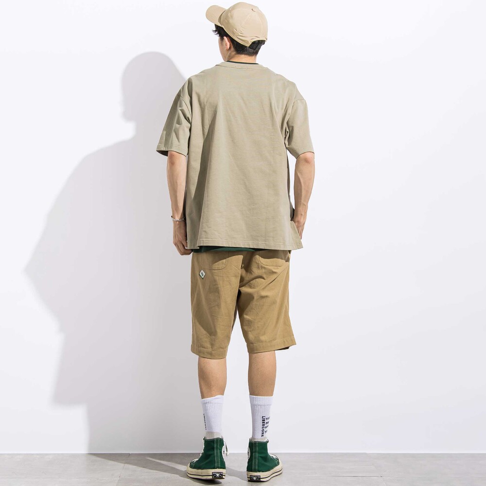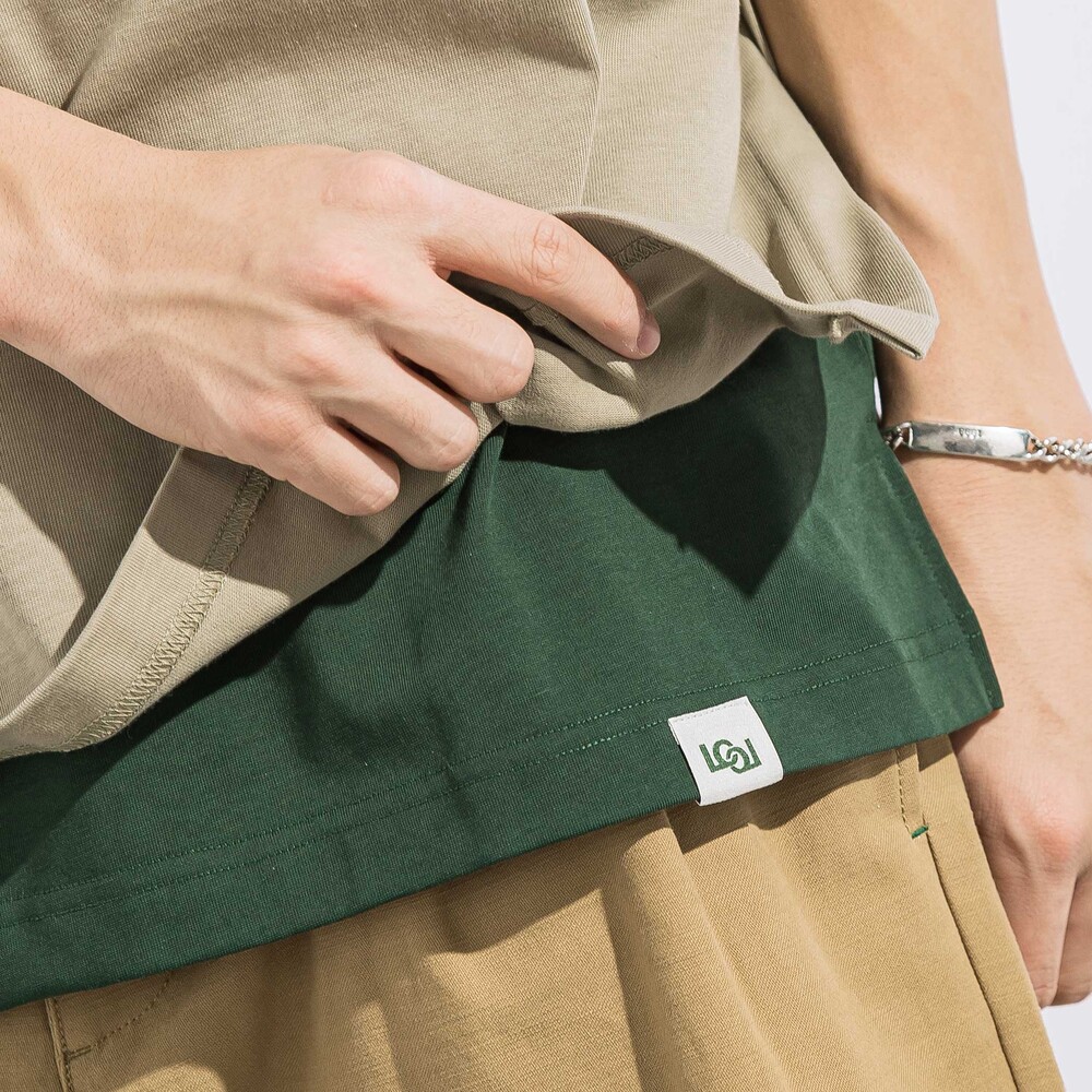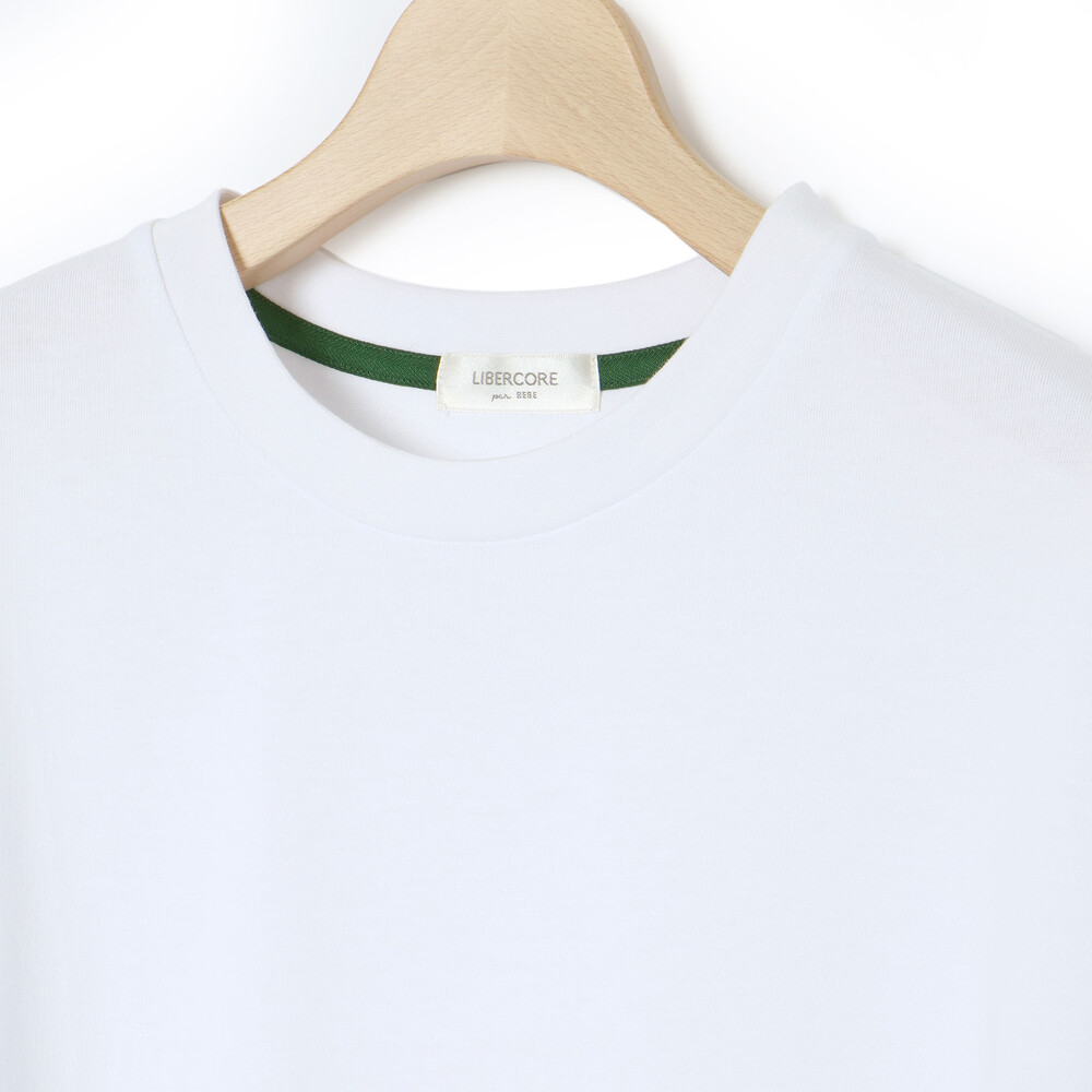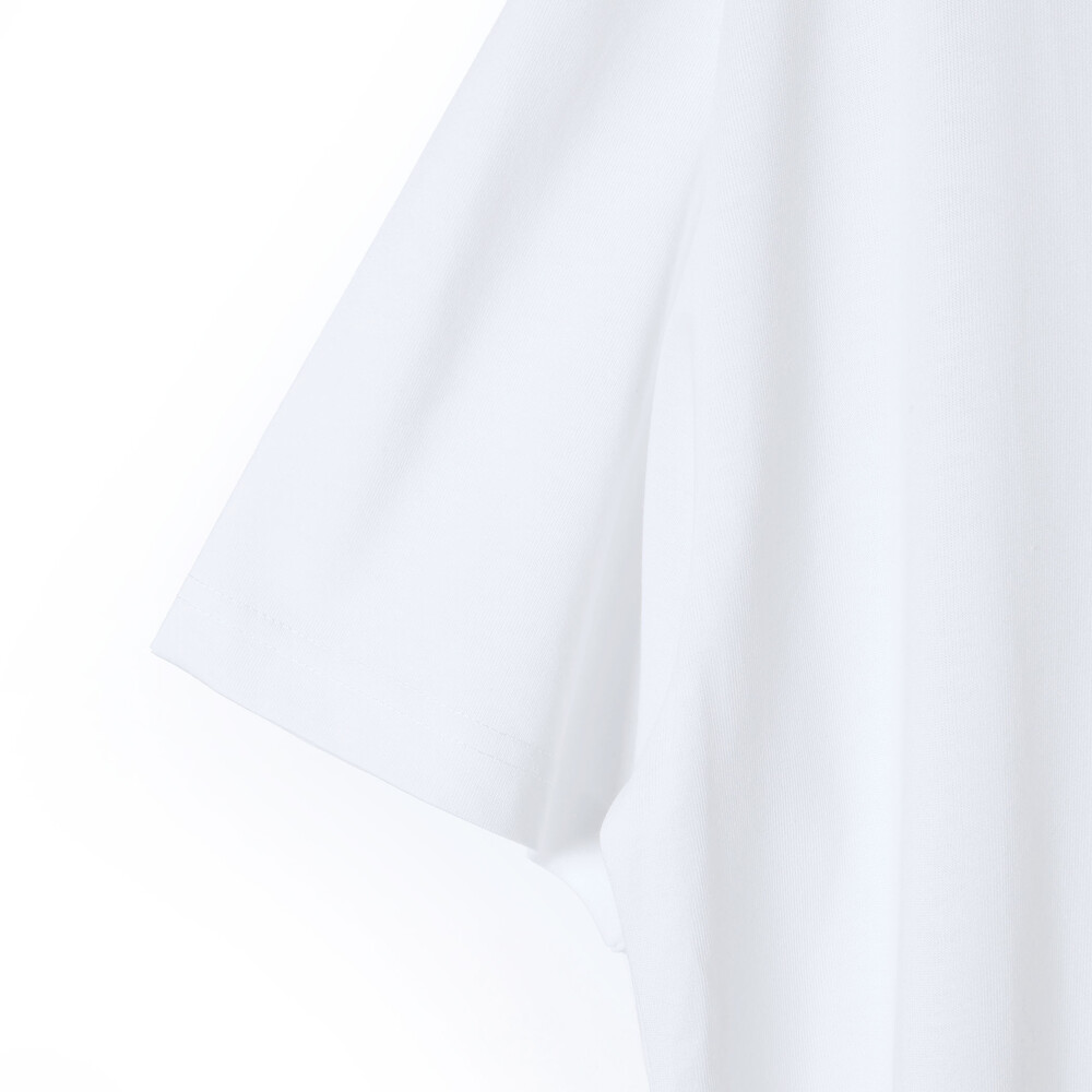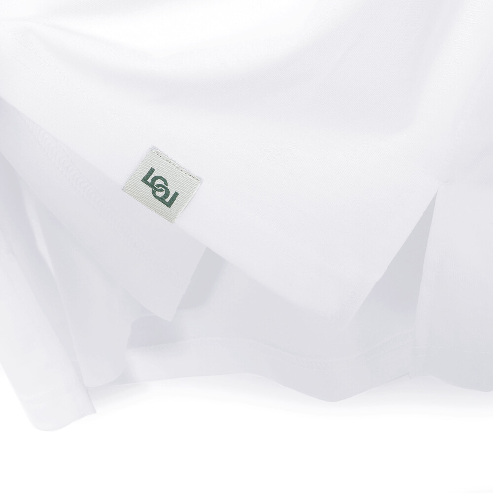 裾にネーム付きのTシャツ(ホワイト・グリーン)はさらりとした肌当たりで柔らかな天竺のカットソーを使用。
